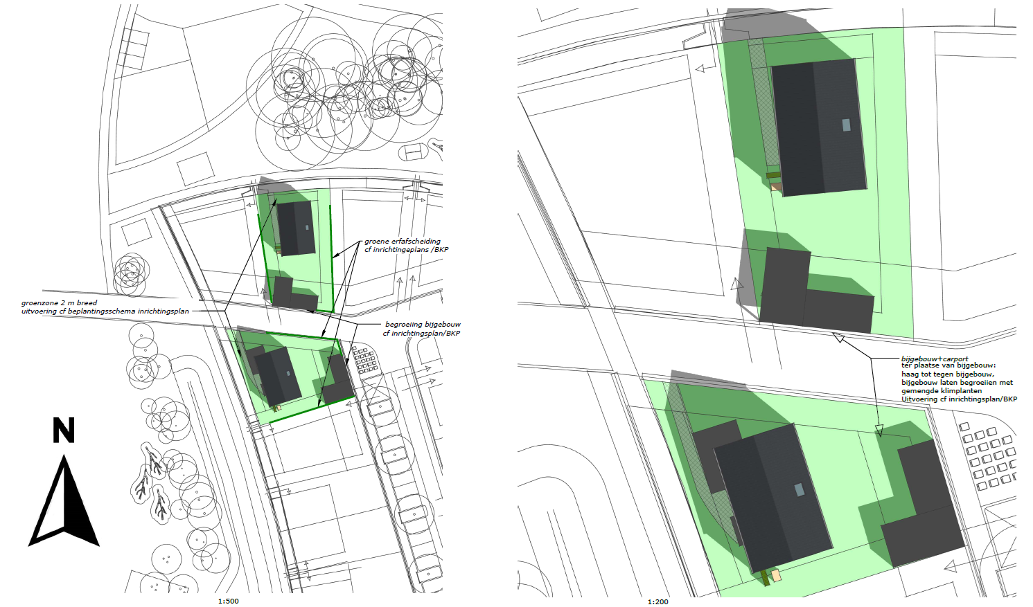 Achterin de tuin wordt standaard één parkeerplaats op eigen terrein gerealiseerd. Optioneel kan gekozen worden voor een berging, carport of zelfs een garage (zie illustraties en optielijst).