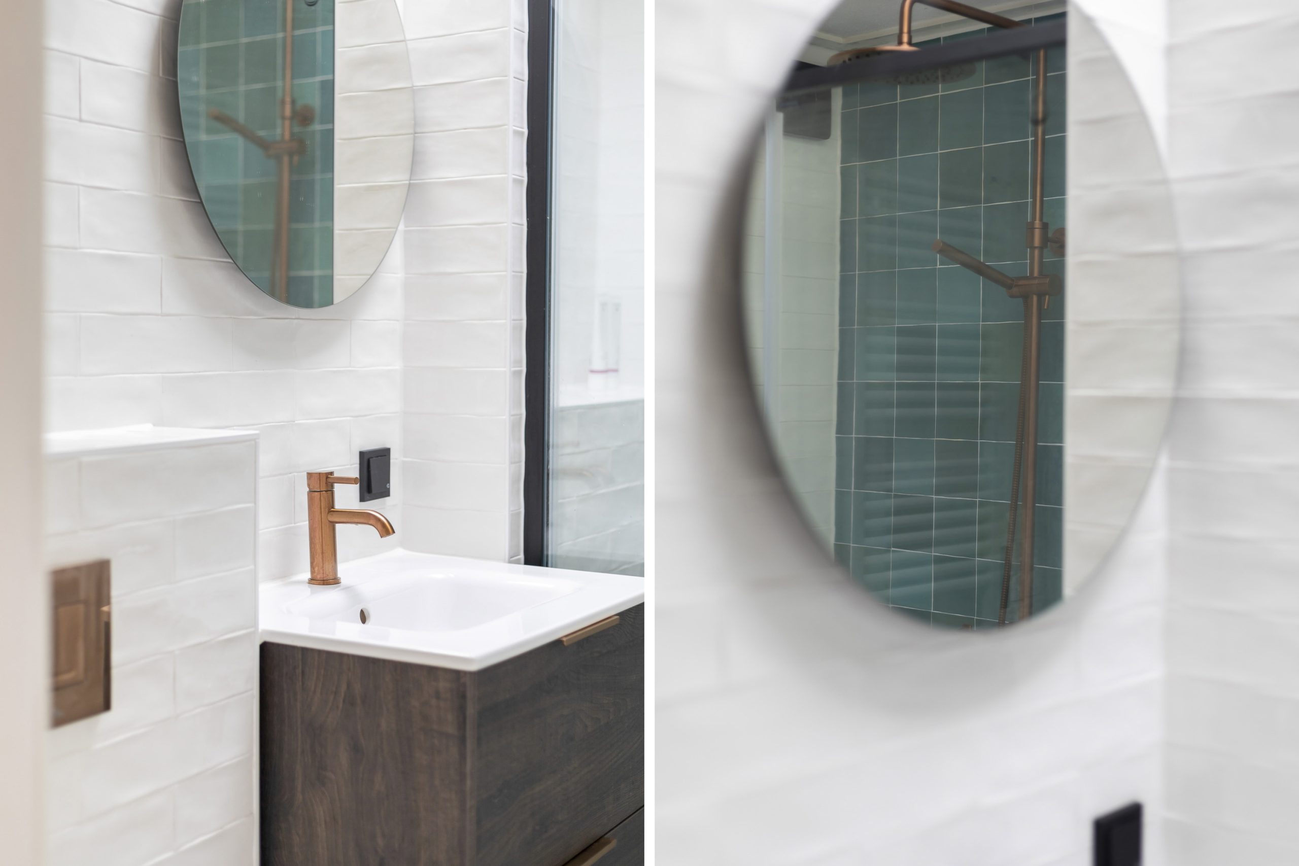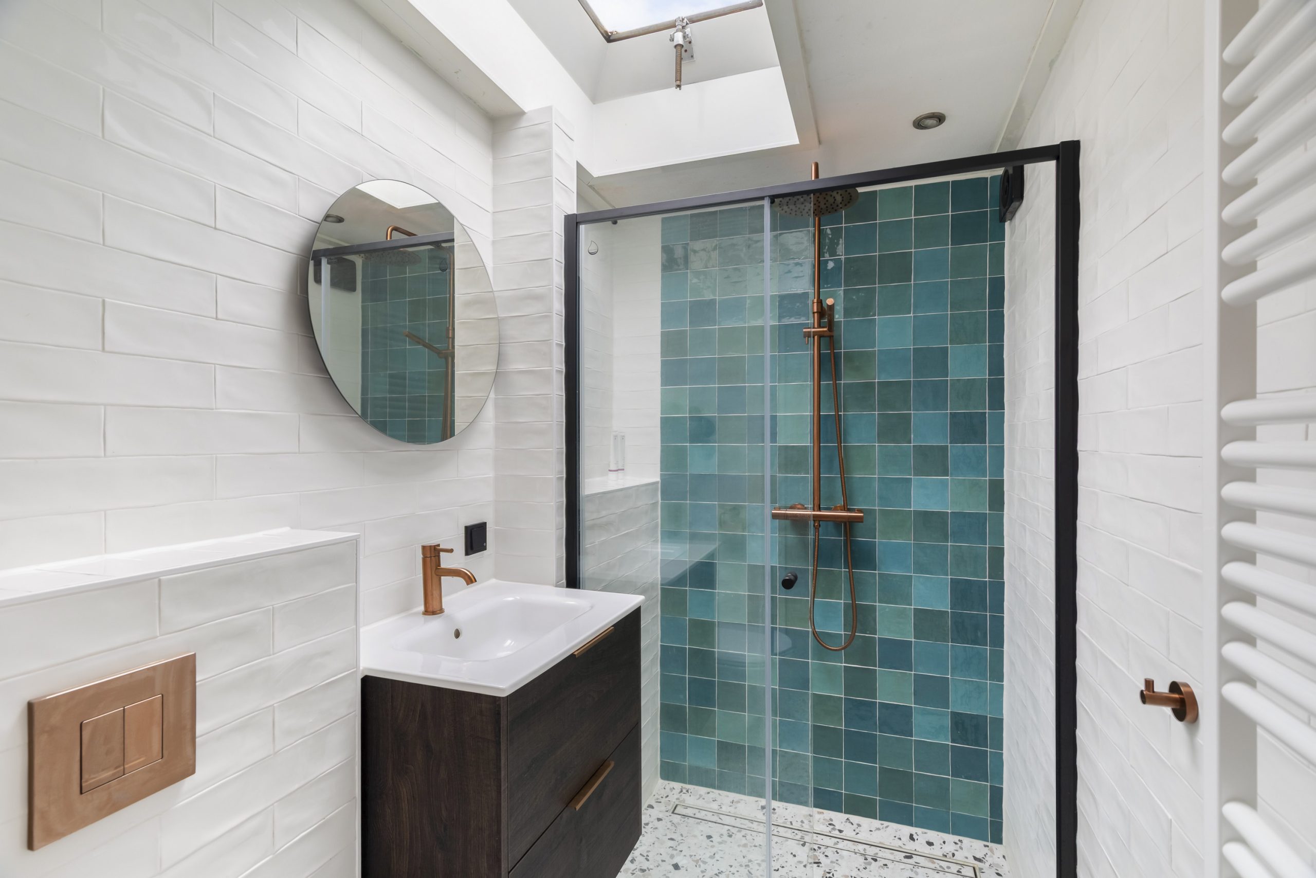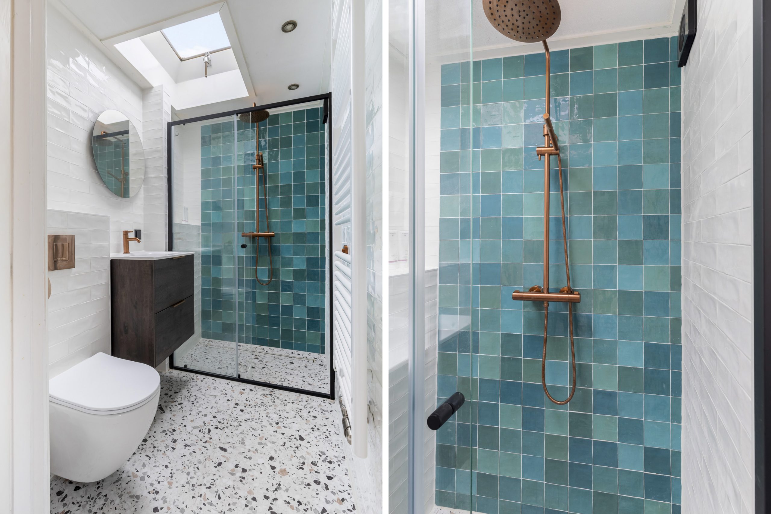 Ook de badkamer is werkelijk een plaatje, deze is eveneens in 2024 geplaatst en beschikt over een ruime douche met koperkleurige inbouwkraan, wastafel op meubel met inbouwkraan, spiegel met verlichting, toilet, designradiator, mechanische ventilatie, een lichtkoepel, moderne terrazzoprint vloertegels en sfeervolle wandtegels.