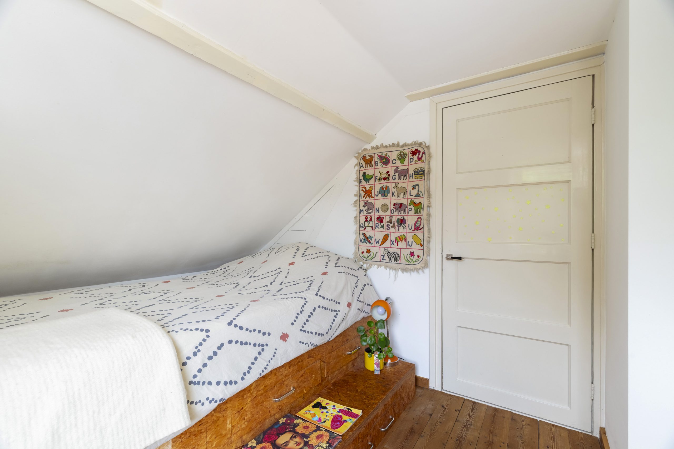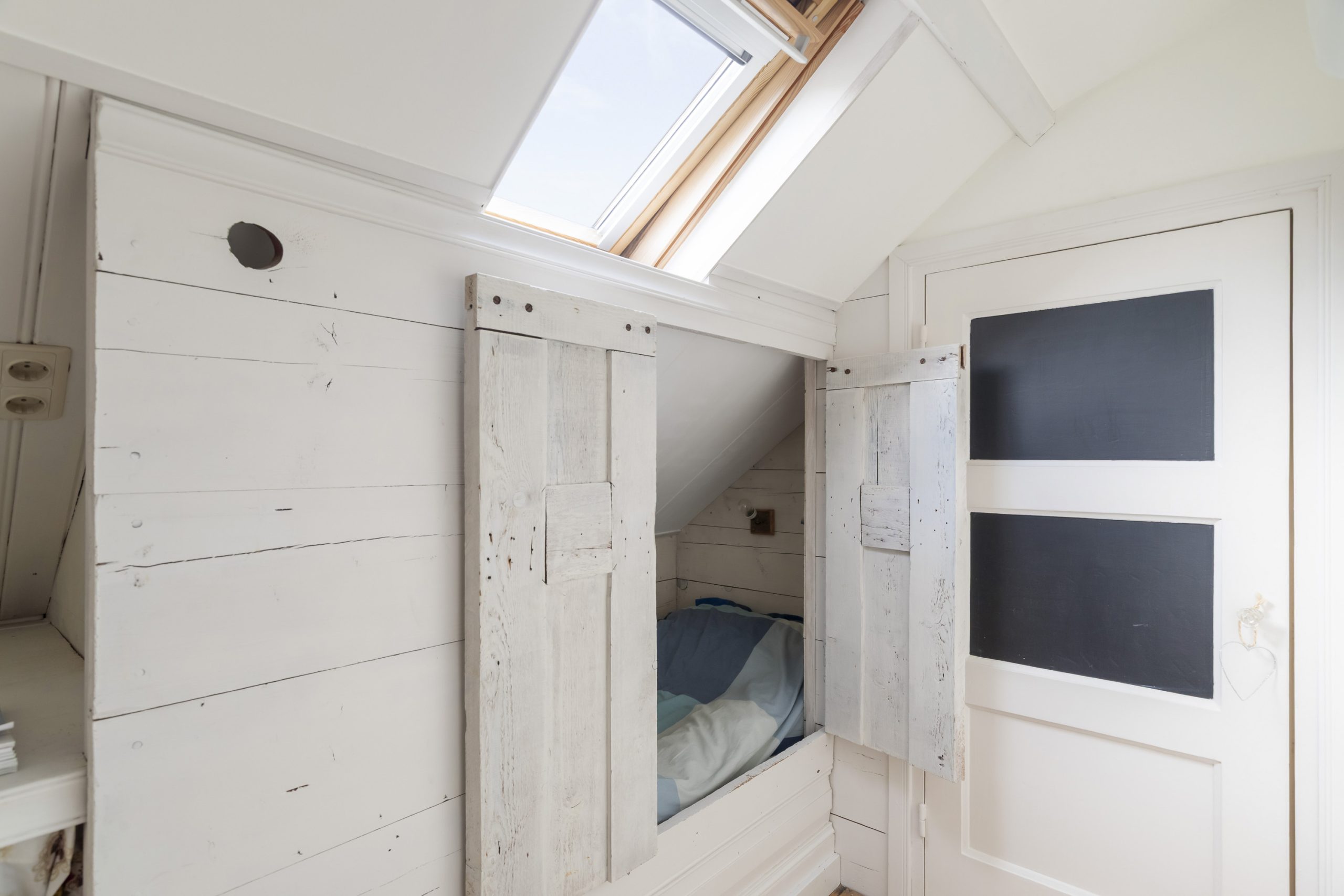 Kleine slaapkamer aan zijkant met sfeervolle bedstee (1-persoons), vaste kast en een dakraam.