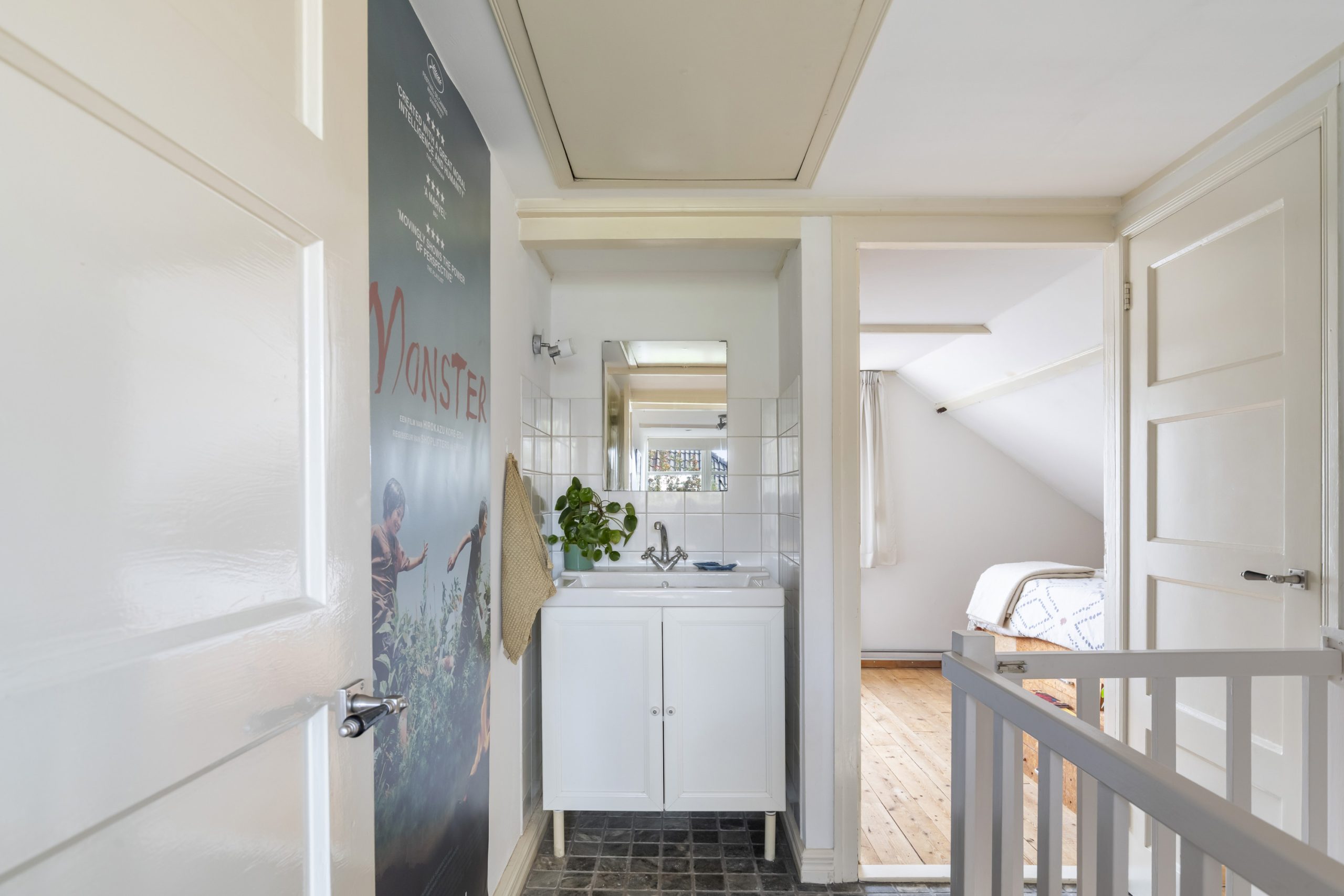 De overloop beschikt over hardstenen vloertegeltjes, een wastafel en toegang tot de vliering (middels vlizotrap).