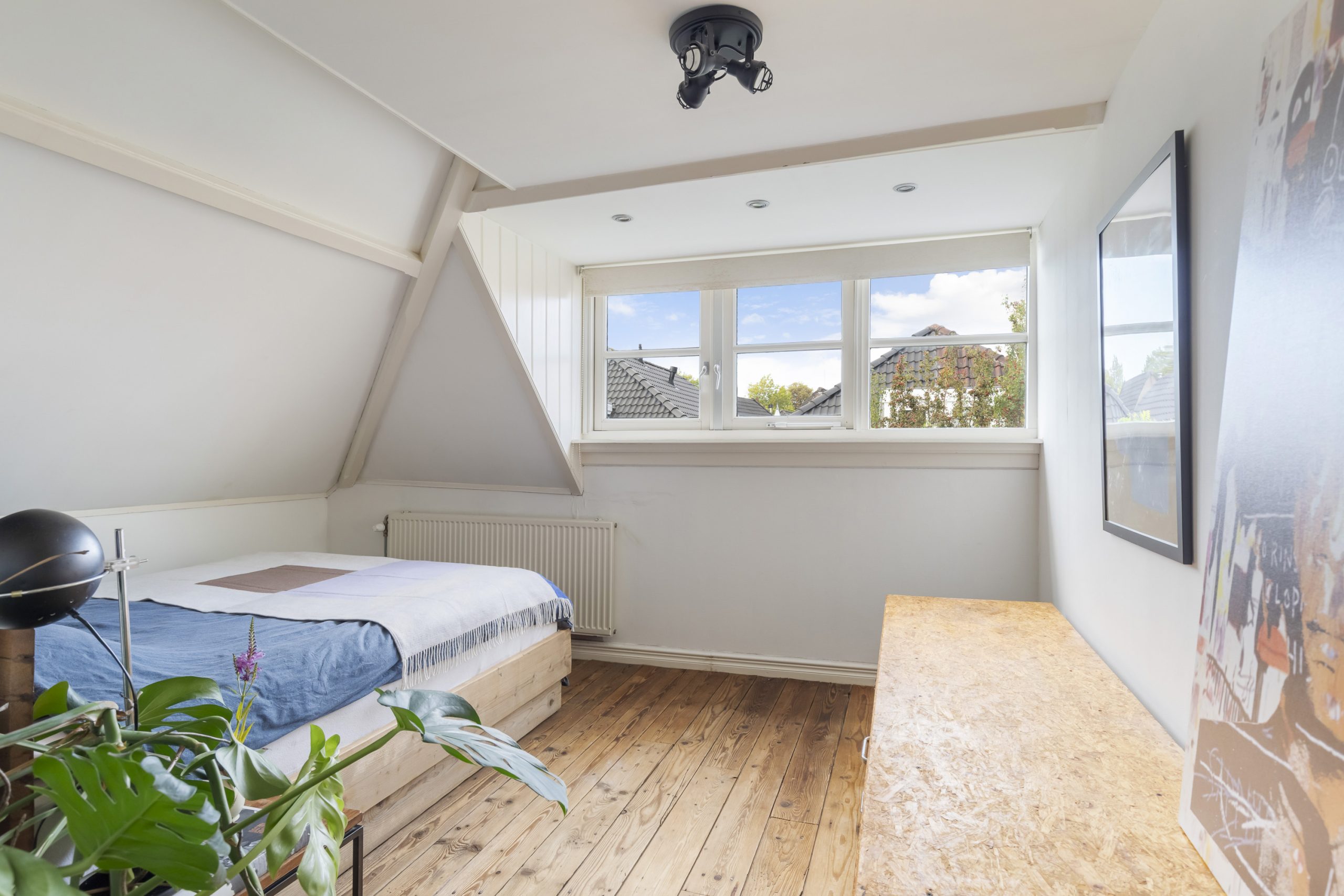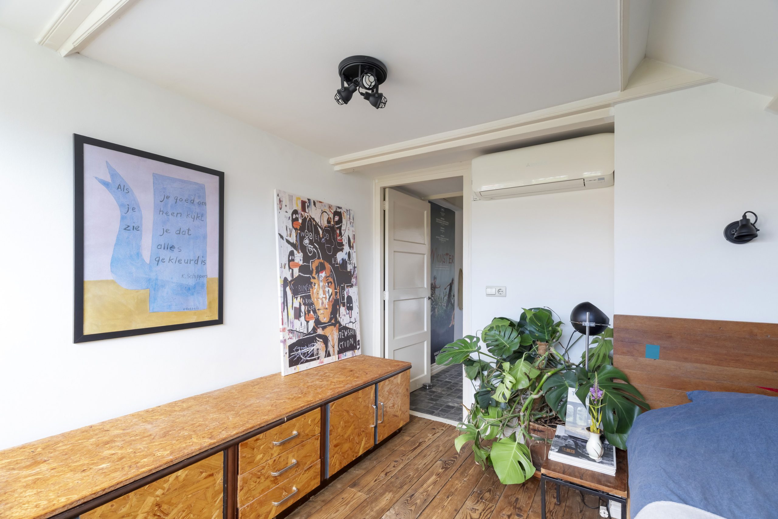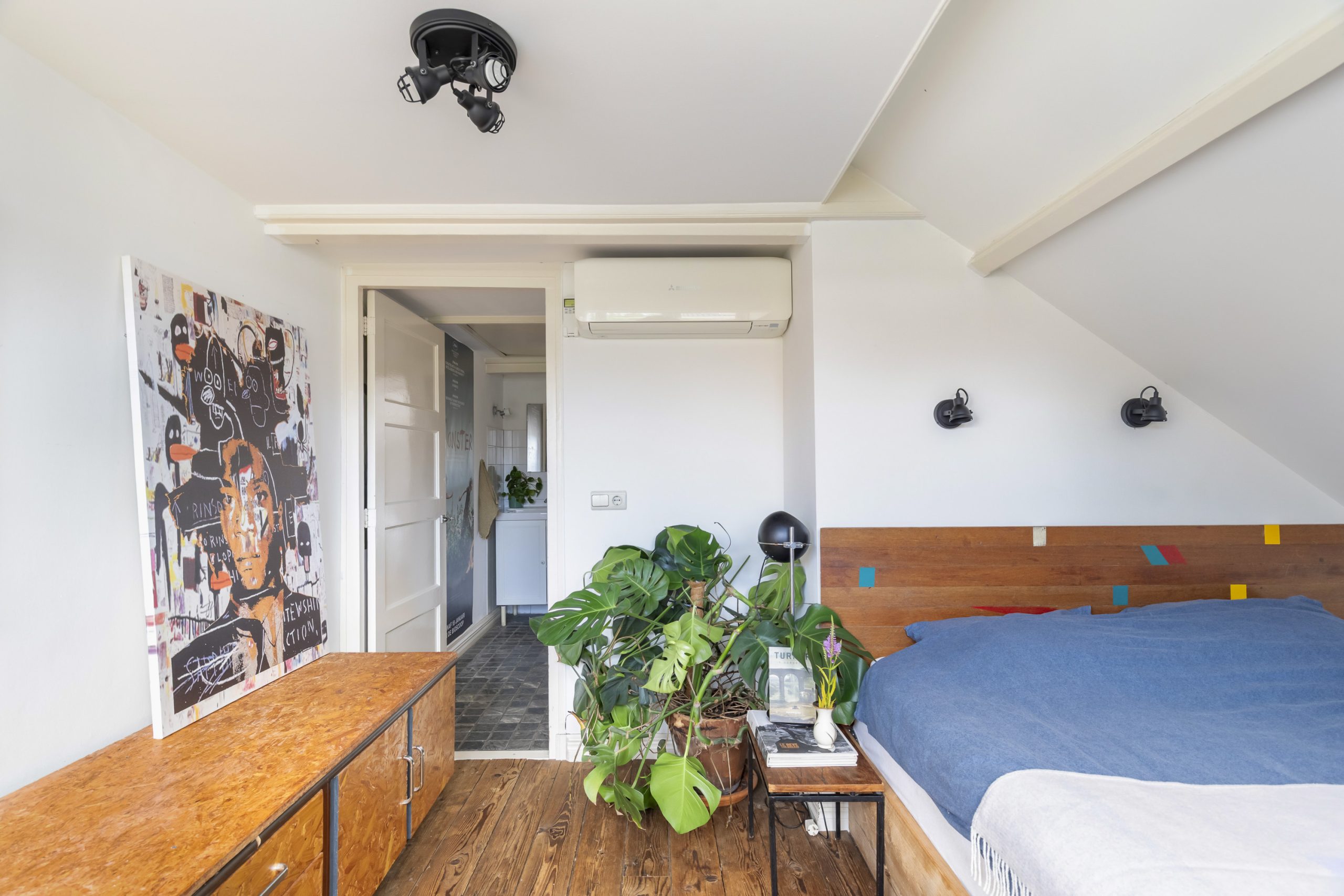 Grote slaapkamer aan voorzijde met grote dakkapel, voorzien van een houten vloer, airconditioning en dubbel glas.