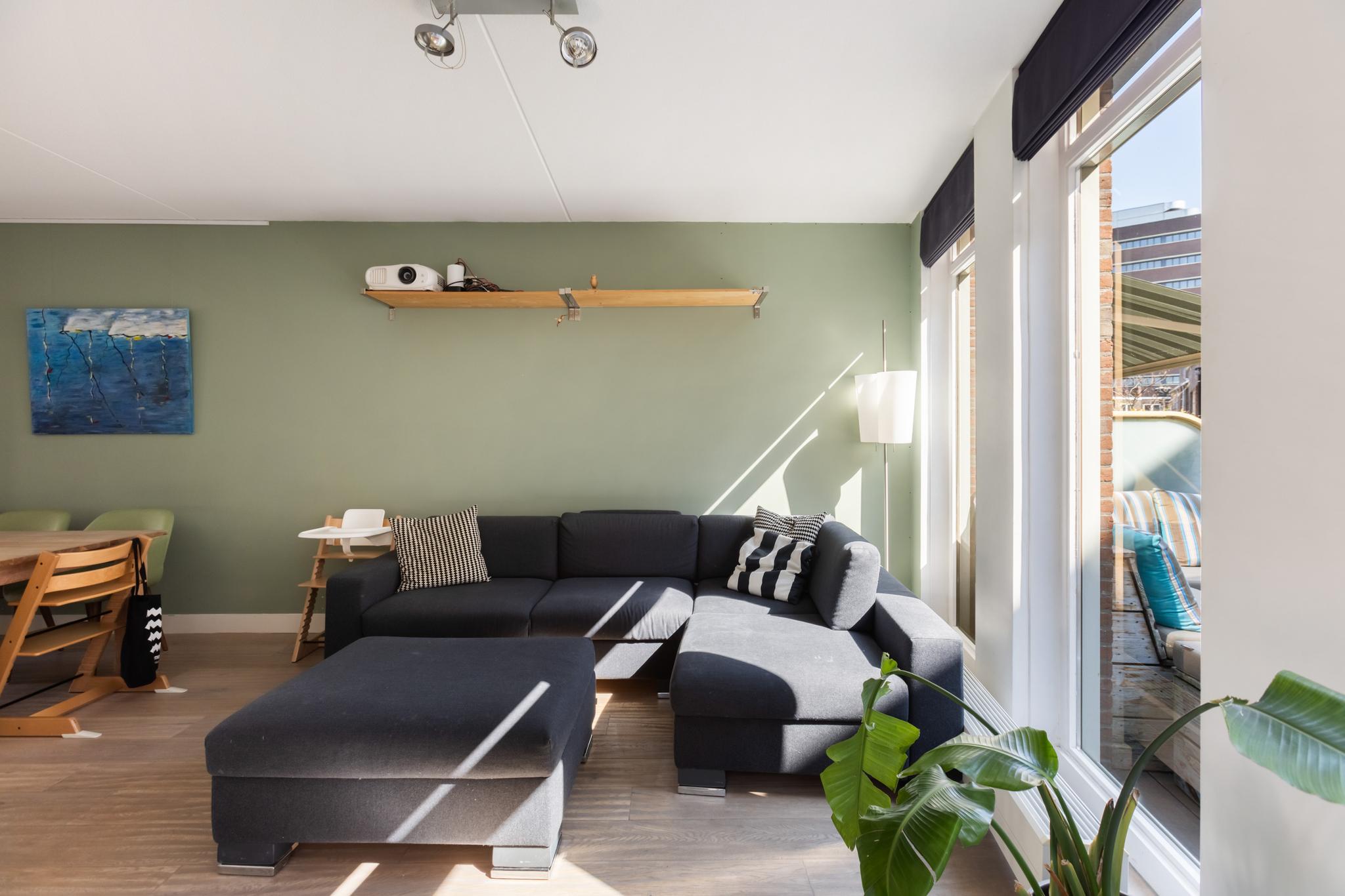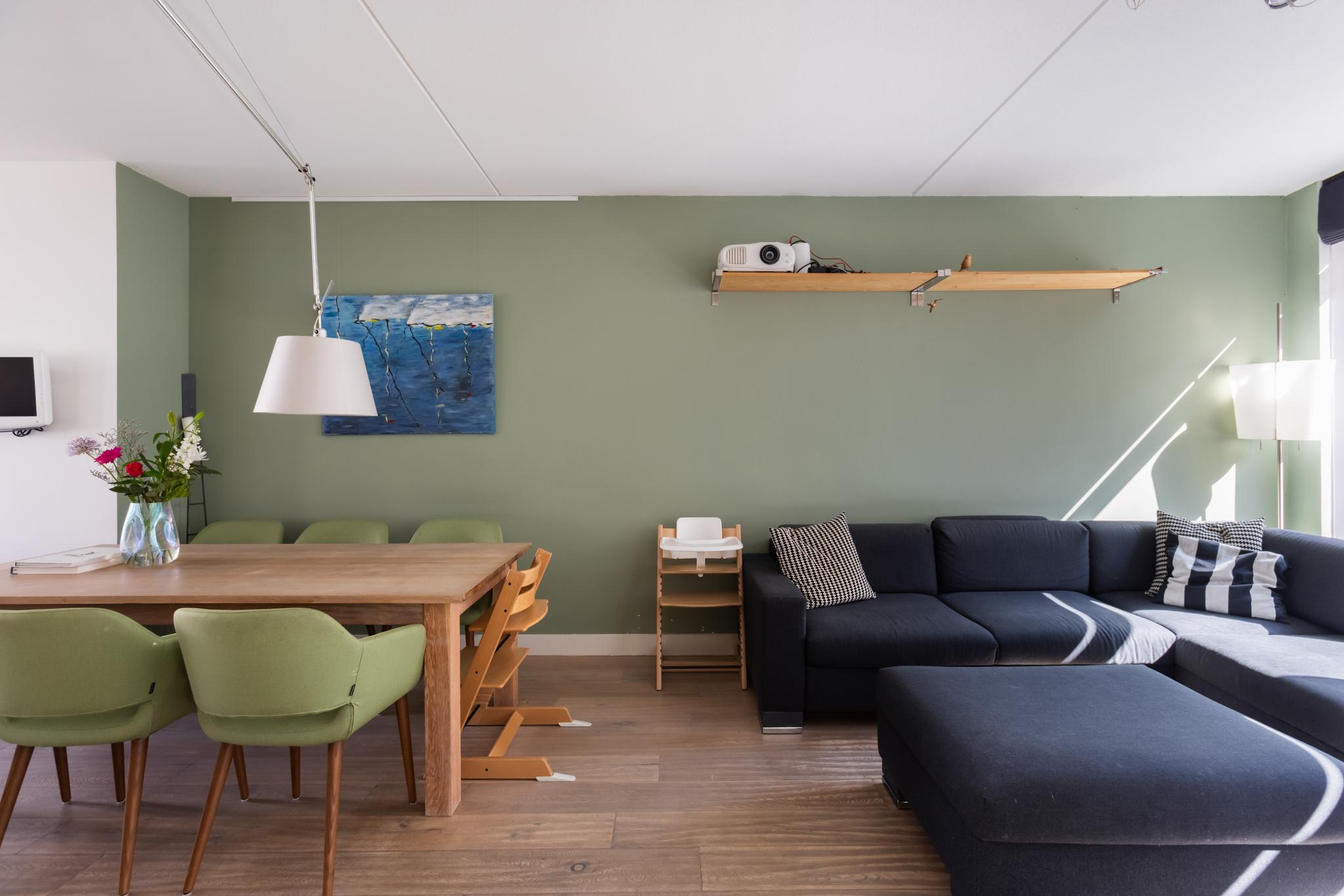De woonkamer is gelegen aan de achterzijde van de verdieping en is voorzien van een eikenhouten parketvloer en stucwerk wandafwerking.