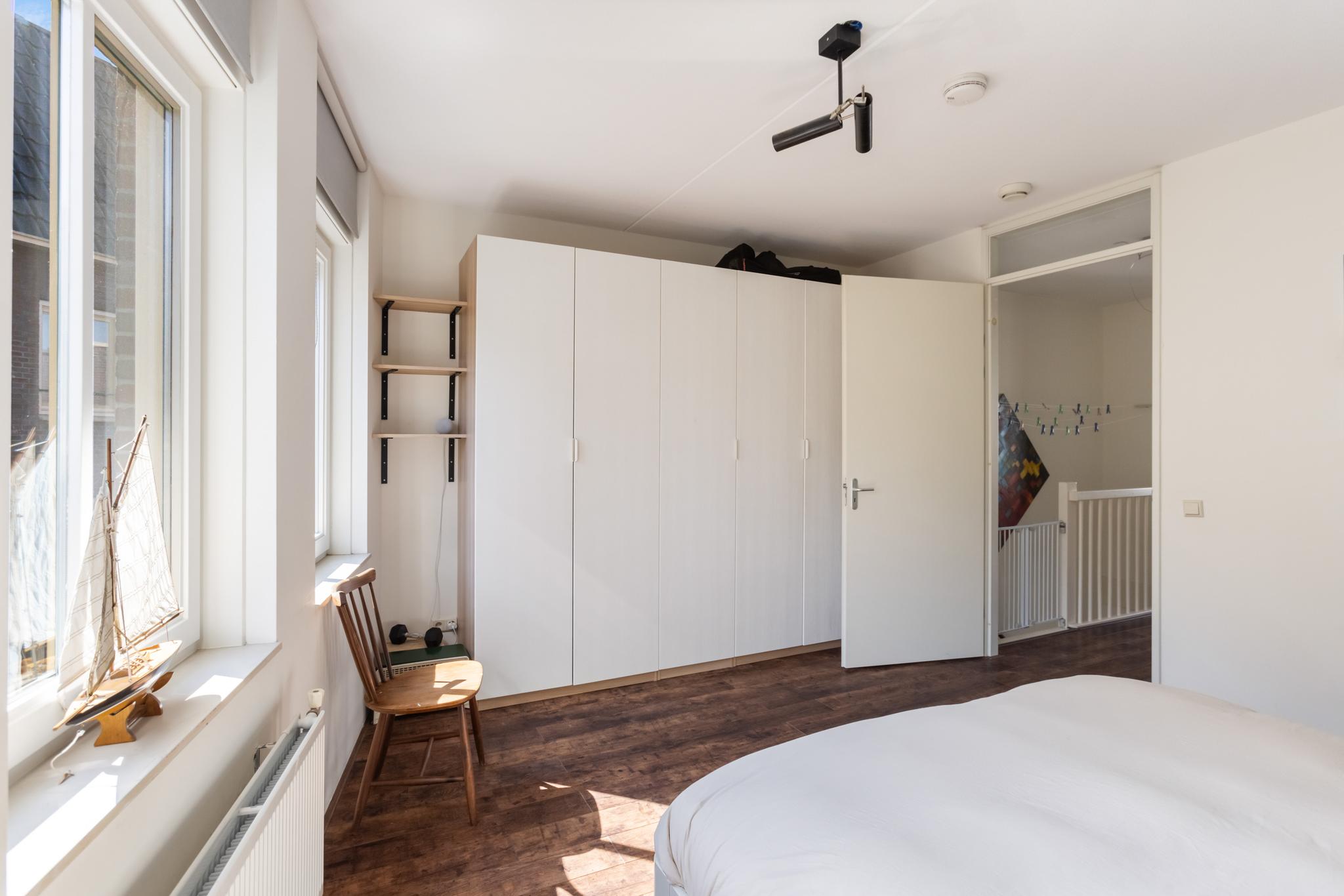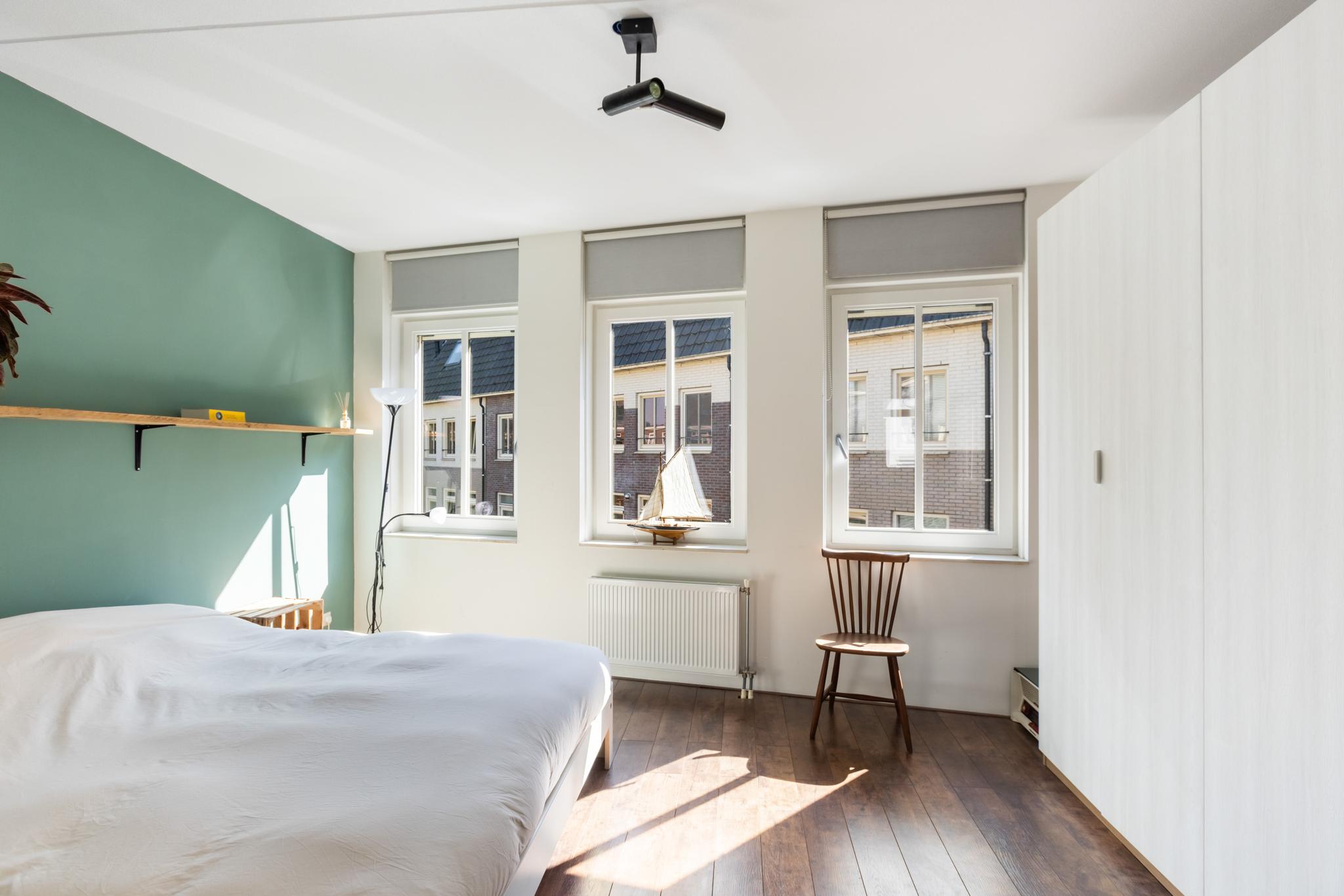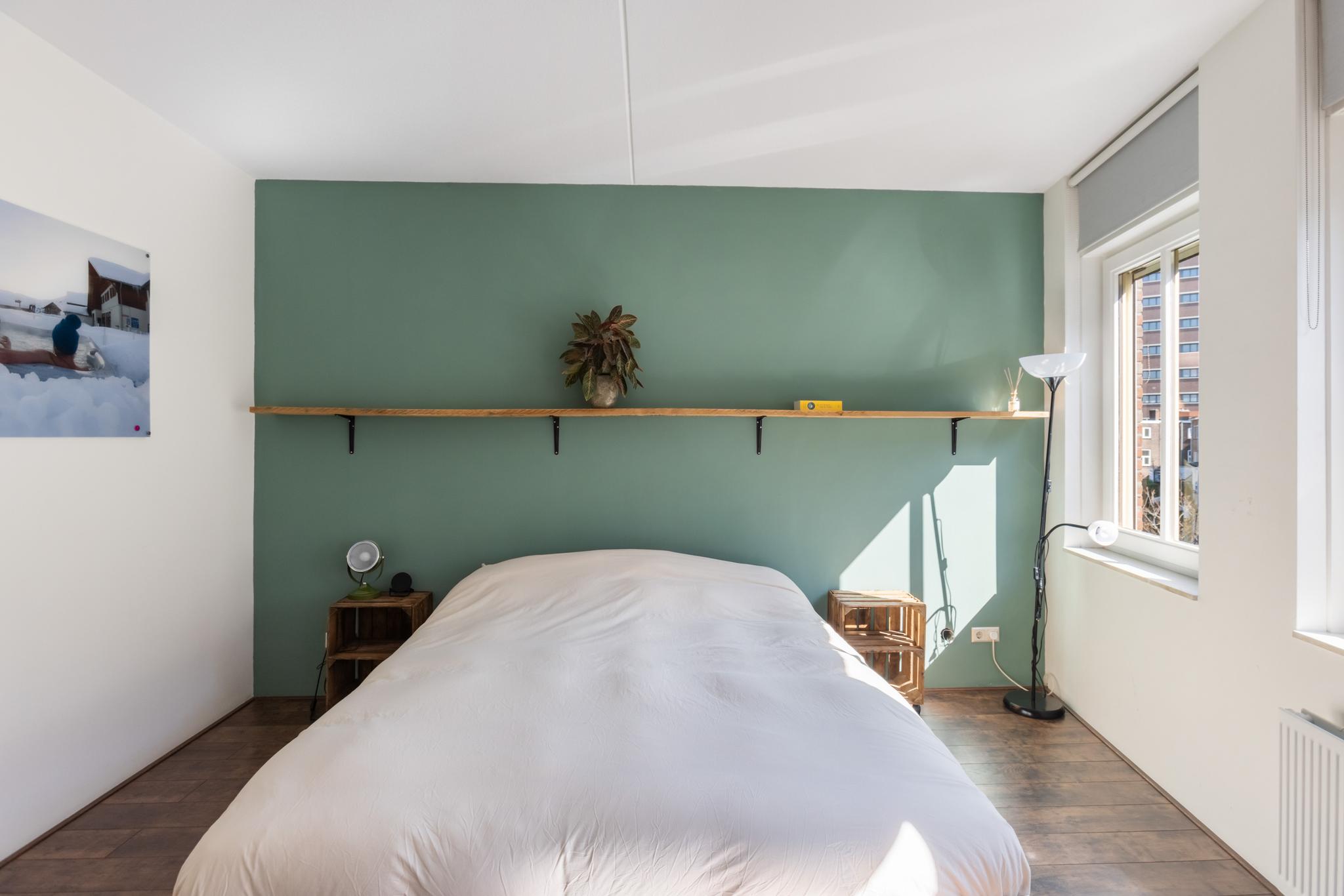 Ruime slaapkamer aan achterzijde met laminaatvloer, stucwerk wandafwerking, draai-kiep ramen met horren en een grote kastenwand (ter overname).