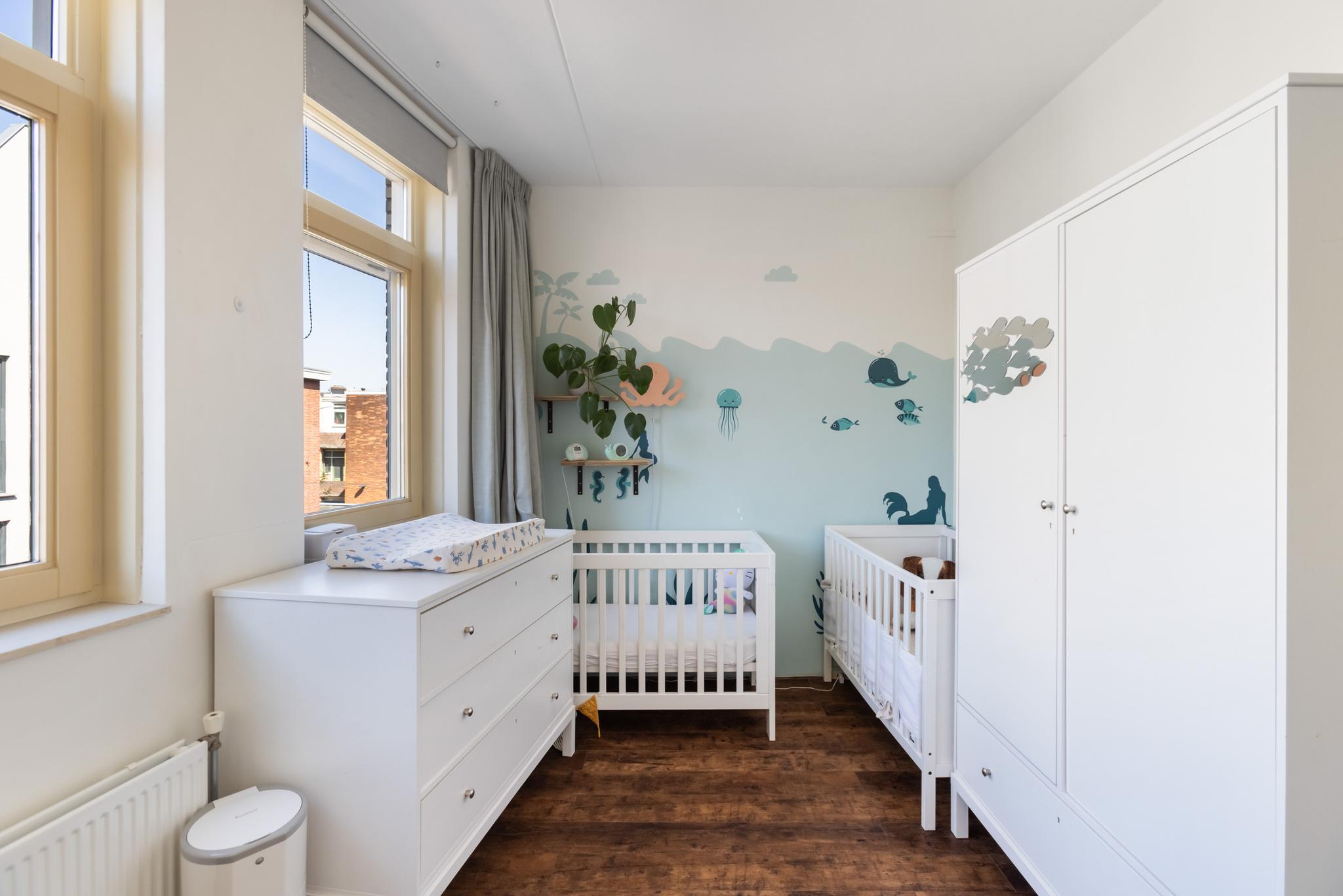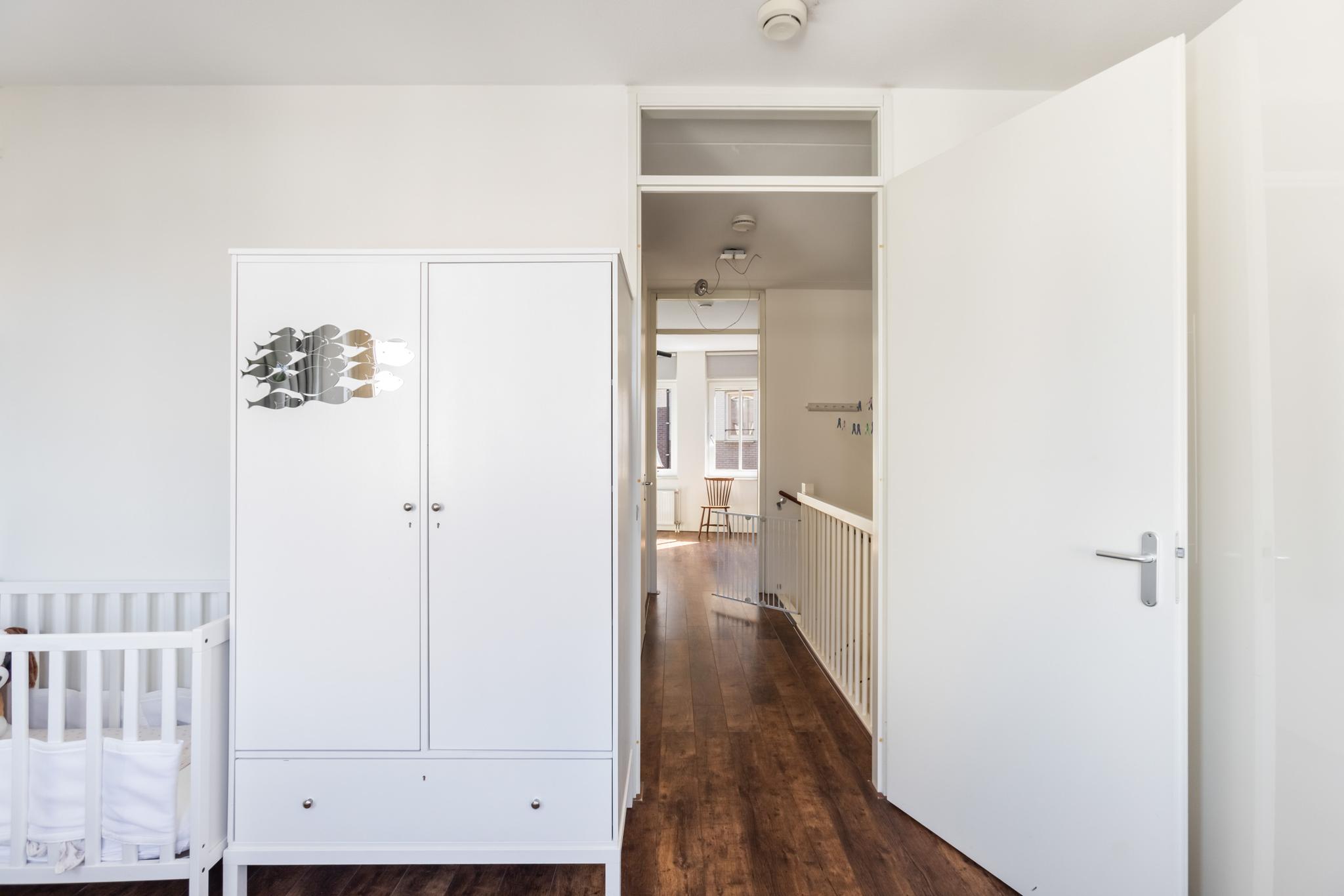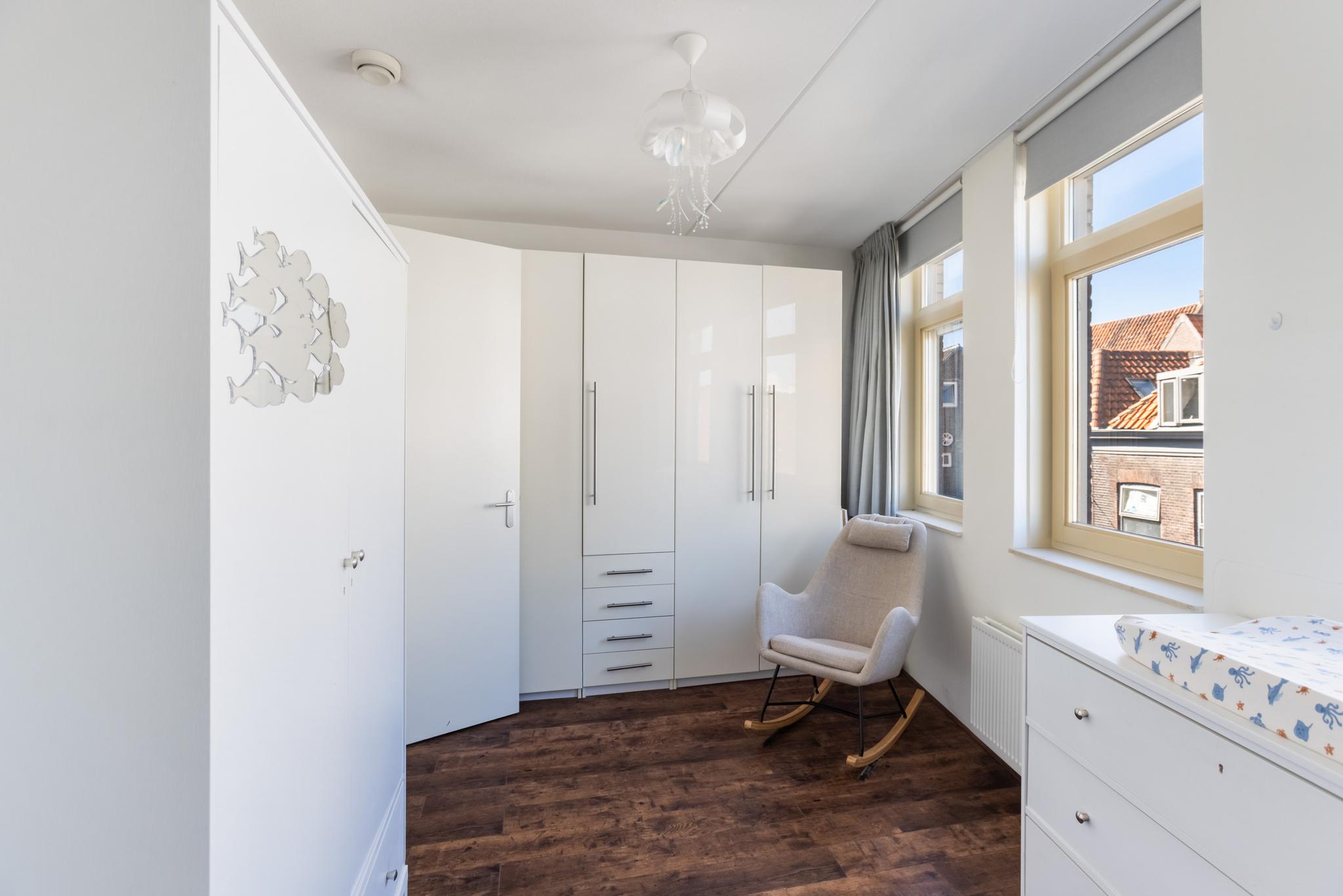 Ruime slaapkamer aan achterzijde met laminaatvloer, stucwerk wandafwerking, draai-kiep ramen met horren en een grote kastenwand (ter overname).