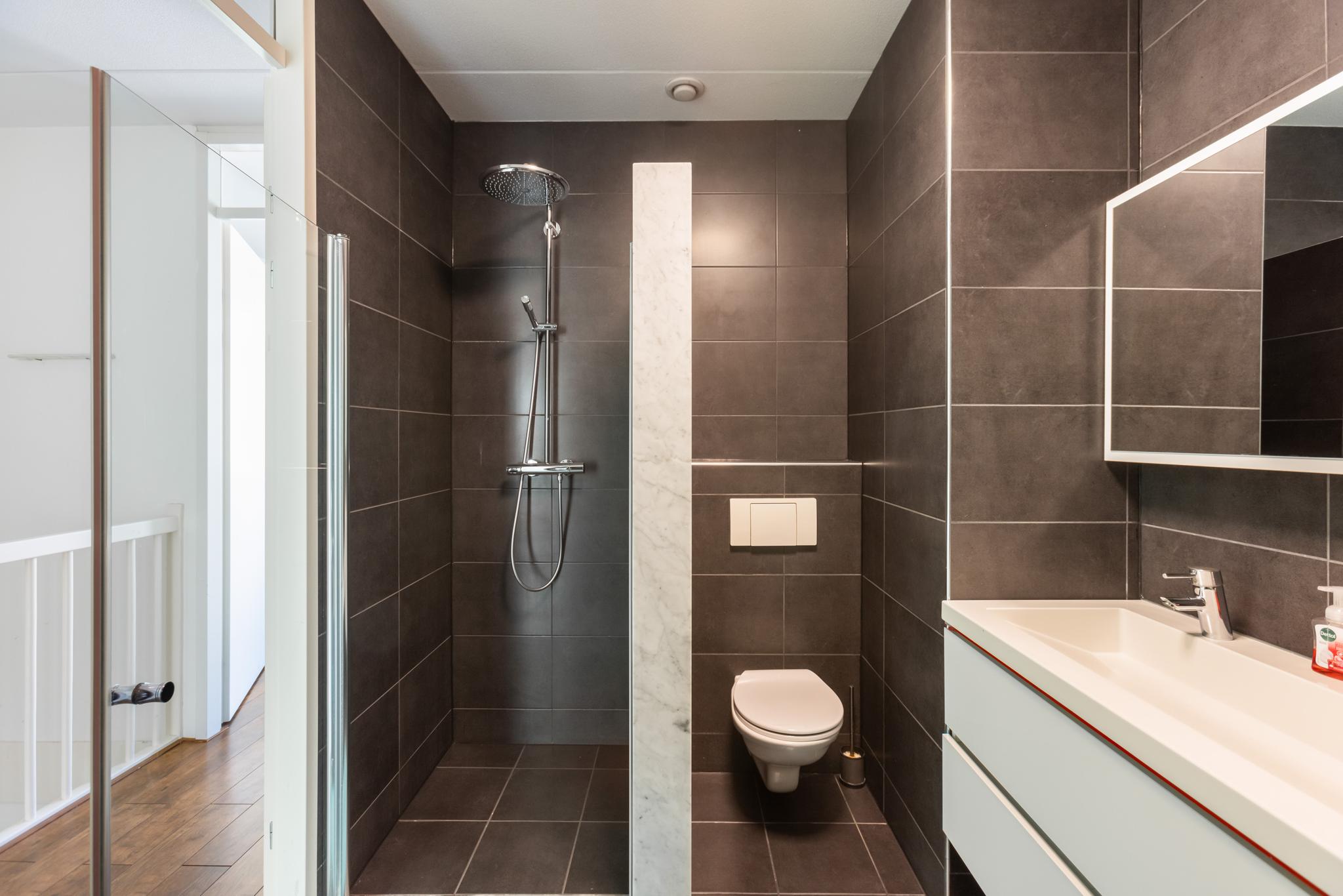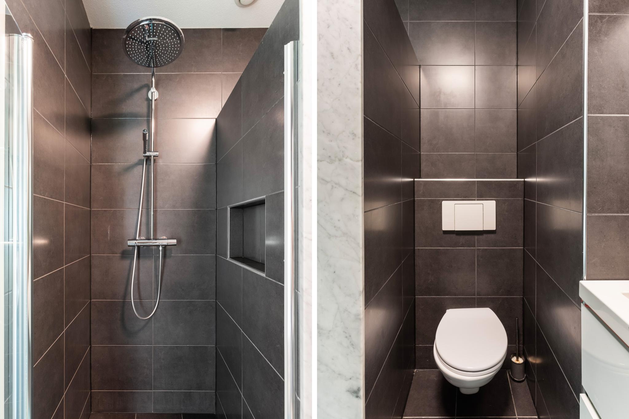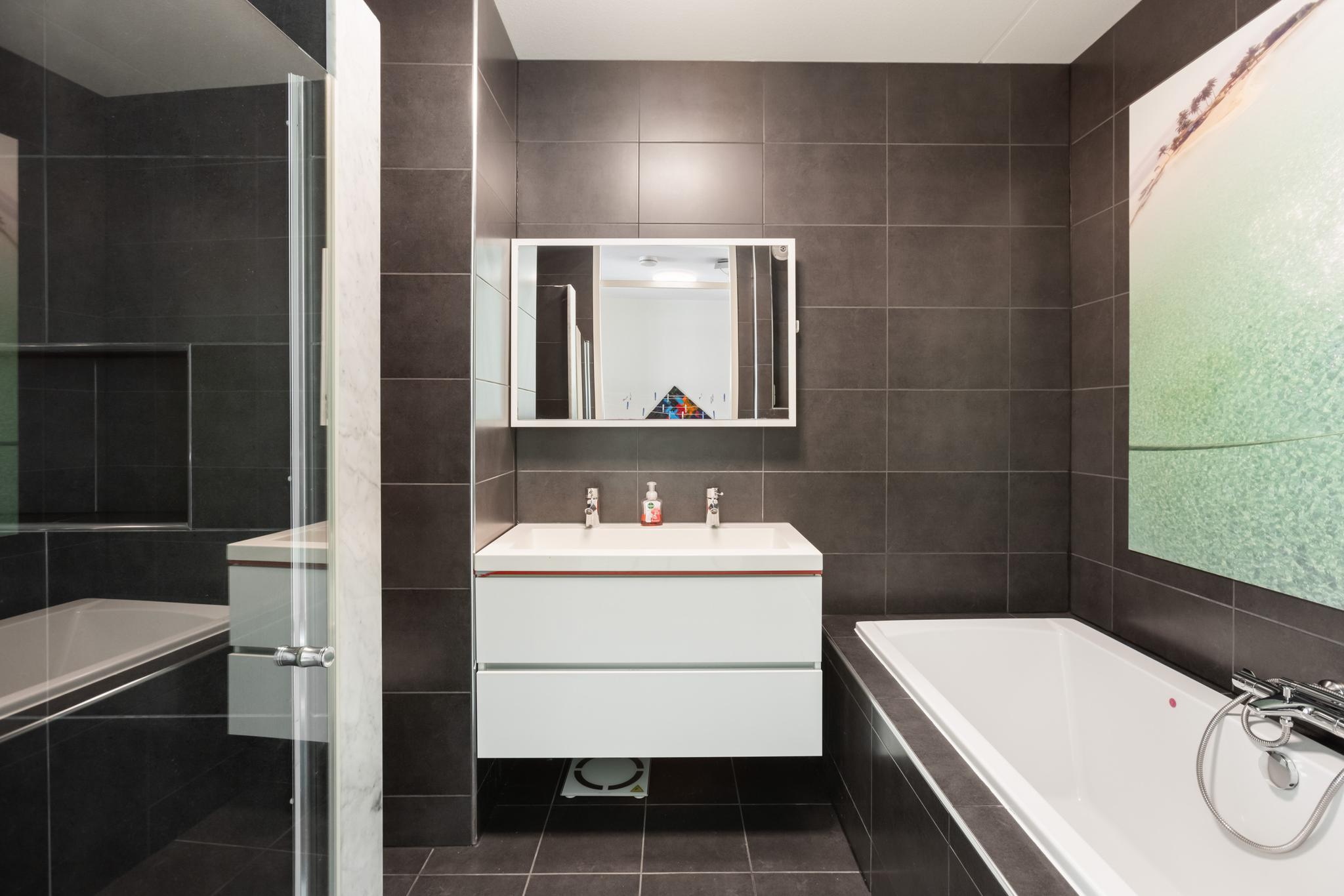 De grote inpandige badkamer is van alle gemakken voorzien. Zo beschikt de badkamer zowel over een ruime douche als een groot ligbad. Verder is deze voorzien van een brede wastafel met twee kranen, wasmeubel, toilet en geïntegreerde LED-verlichting. De badkamer is volledig betegeld.