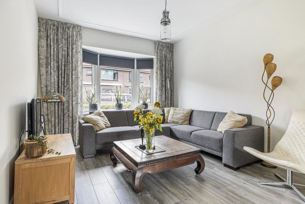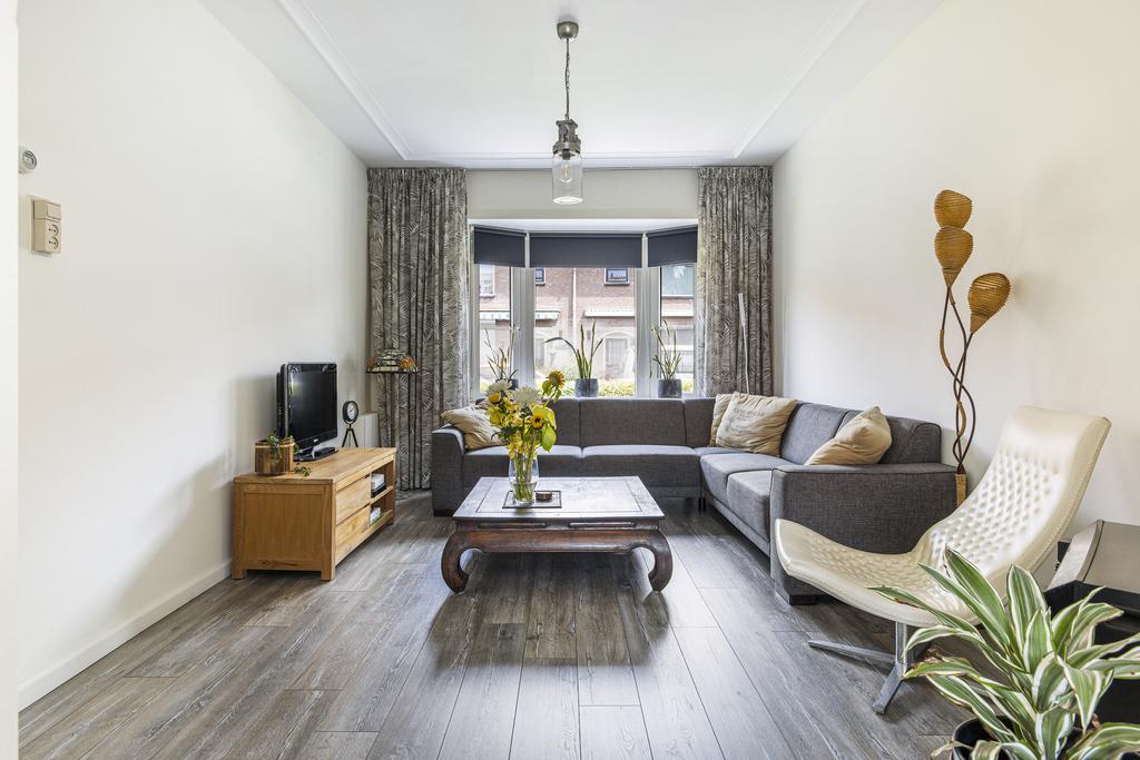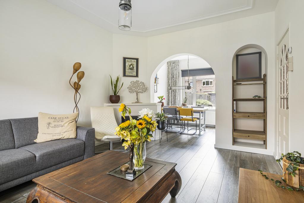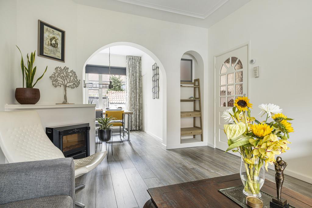 Gezellige woonkamer in 2 delen verdeeld met vaste kast/ nis. Aan de voorzijde is een erker aanwezig en aan de achterzijde een vaste kast. Er zijn mensen die de keuken en de woonkamer hebben samengevoegd (met ondersteuning van de tussenmuur) dus dat is ook nog een optie!
