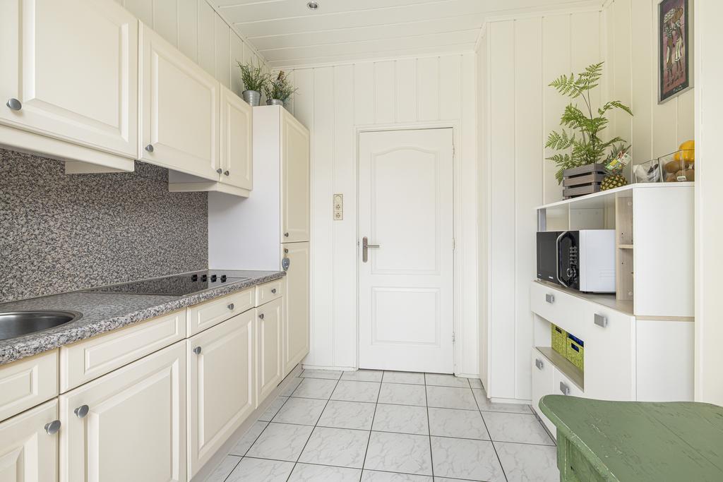 De keuken is nu apart van de woonkamer en voorzien van een wandopstelling. In de keuken is een kookplaat aanwezig, met afzuigkap, spoelbak en een koelkast met vriezer. De handige kast aan de overzijde van de keuken blijft ook achter.