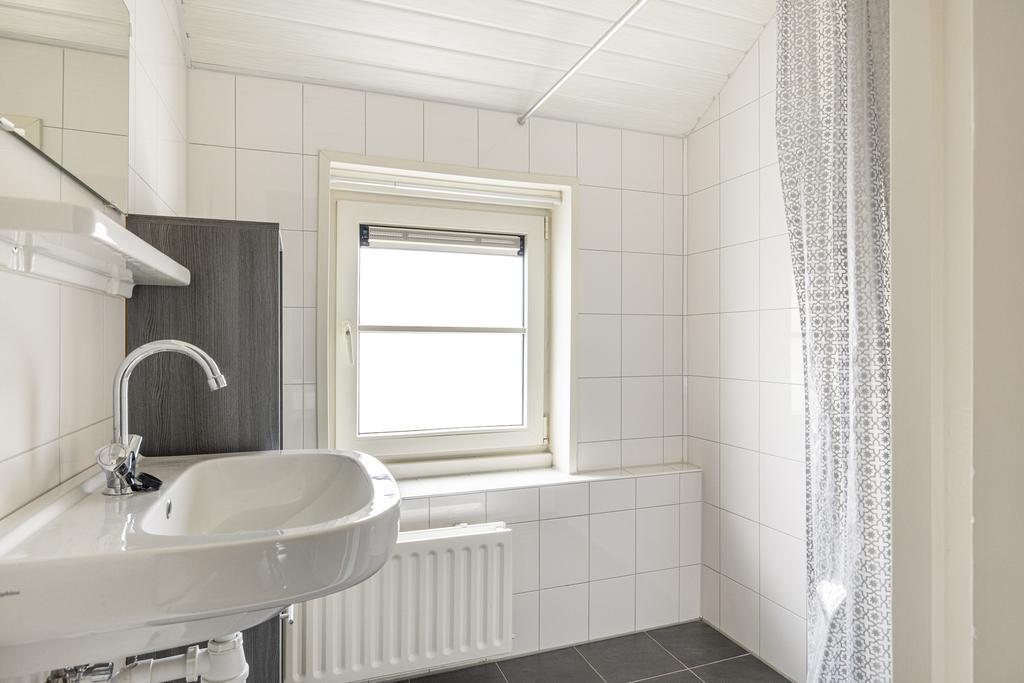 Badkamer met douche en wastafel, het geheel is fris wit betegeld.
