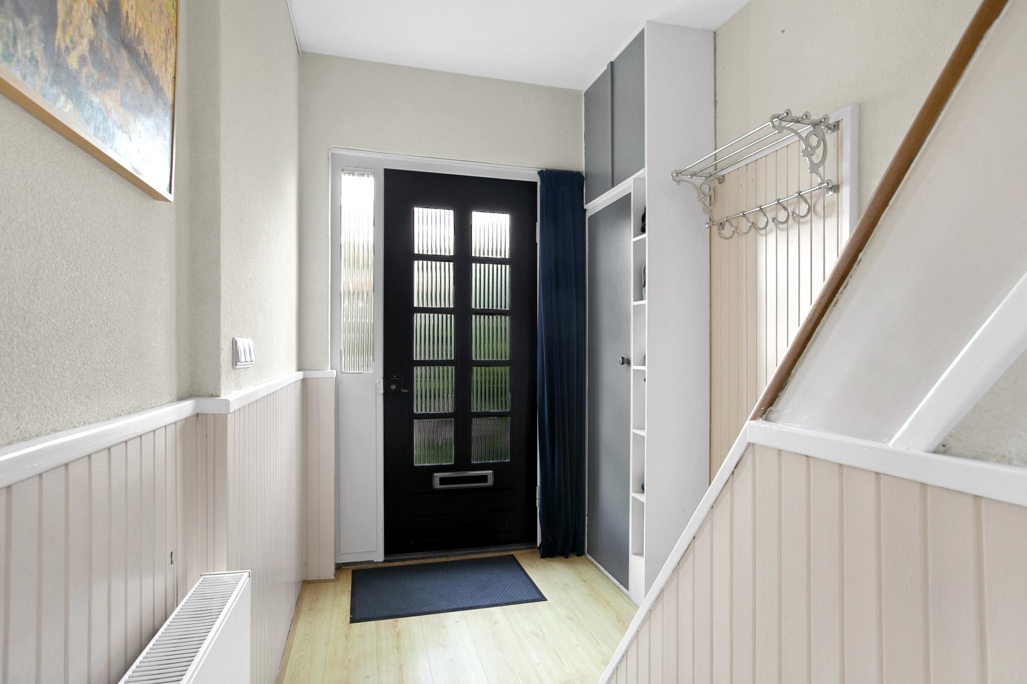 Entree in de hal met meterkast, kelderkast, toilet, trapopgang en toegang tot de woonkamer.