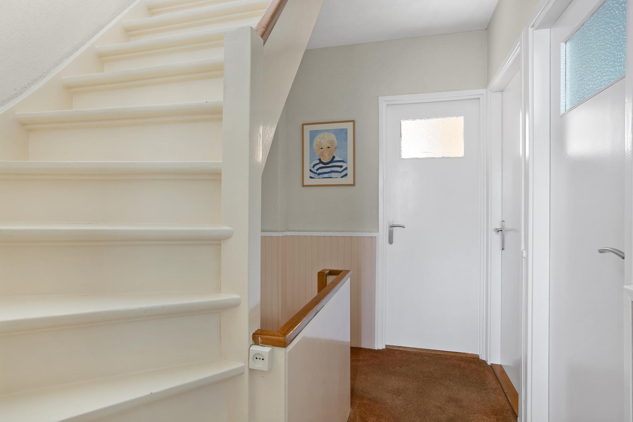 Overloop met vaste trap naar de tweede verdieping en toegang tot alle vertrekken.