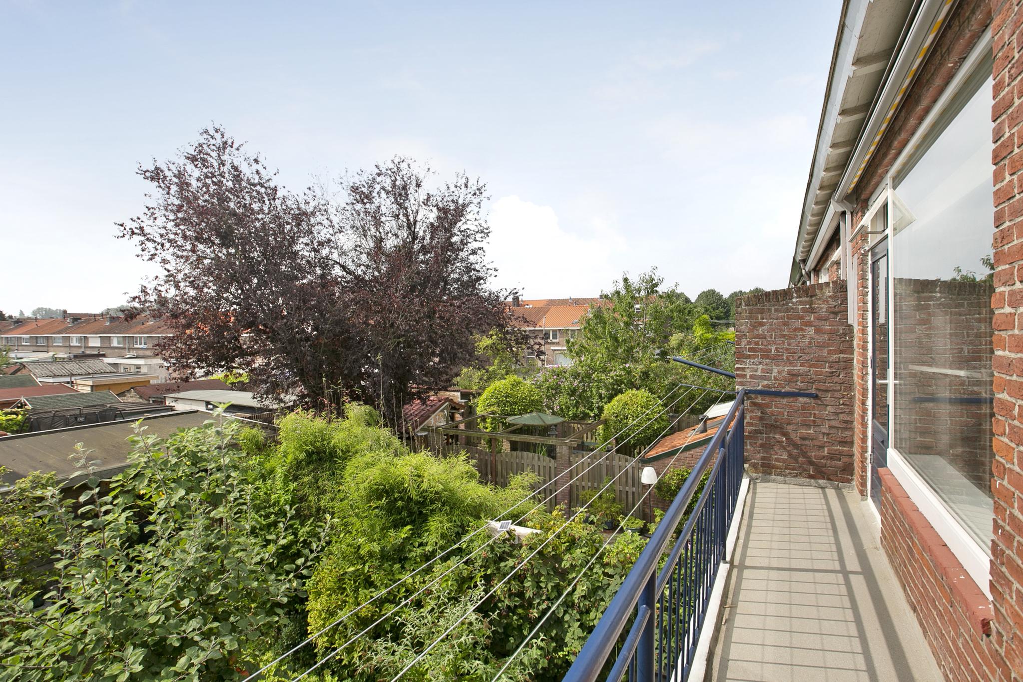 Het balkon biedt vrij uitzicht over de tuin, is voorzien van een nieuwe coating en heeft een hand bedienbaar zonnescherm.