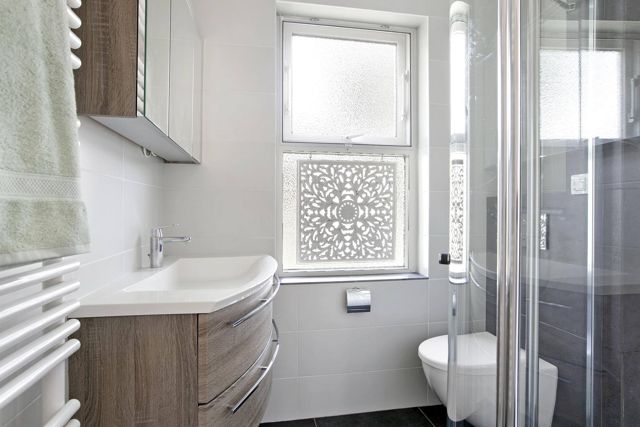 Badkamer met wastafel en meubel, vrijhangend toilet, inloopdouche met thermostaatkraan en regendouche, elektrische ventilatie, spots in het plafond, designradiator en elektrische vloerverwarming.