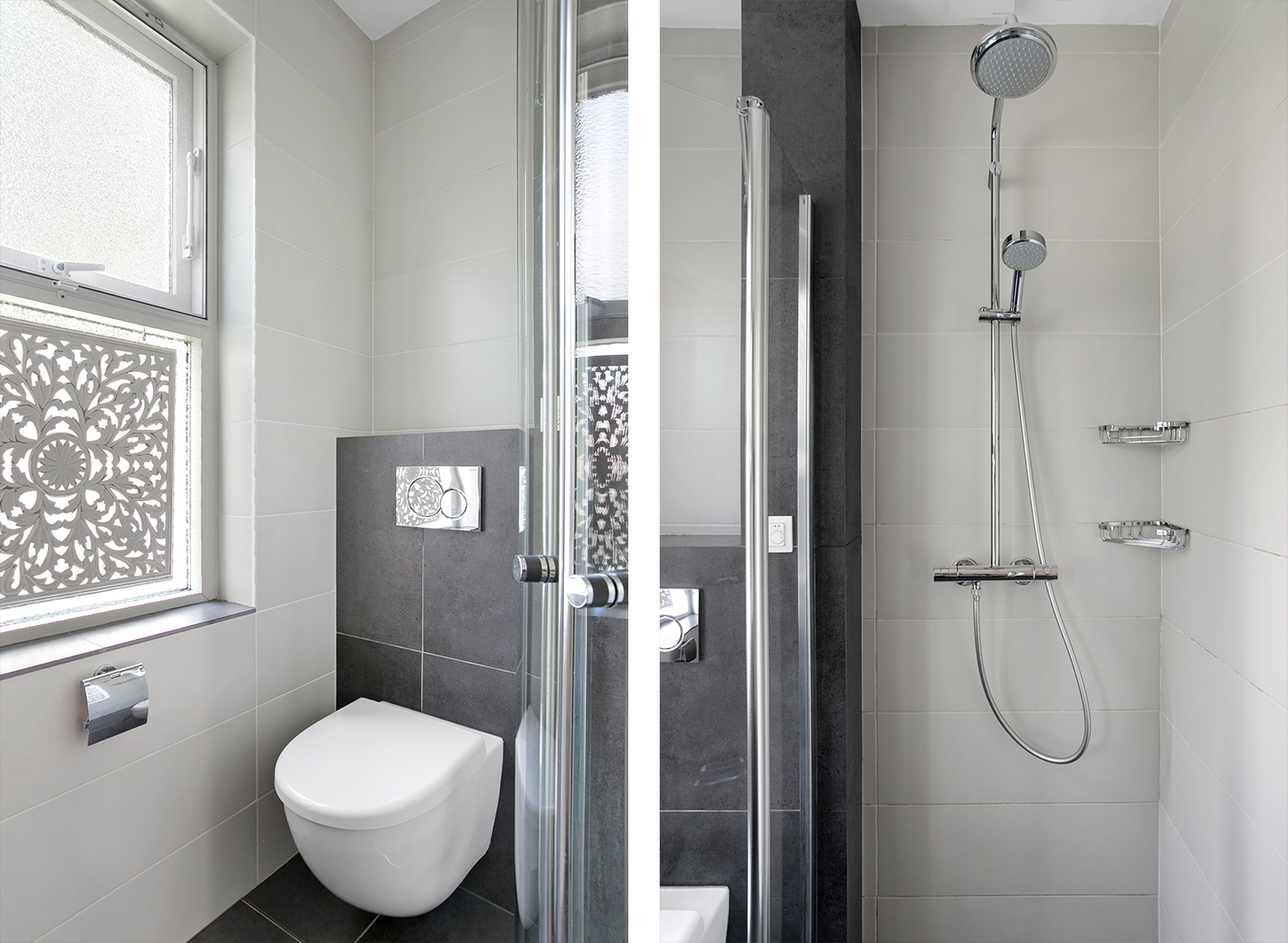 Het toilet is vergroot en voorzien van een fonteintje en geheel betegelde wanden, verlaagd plafond.