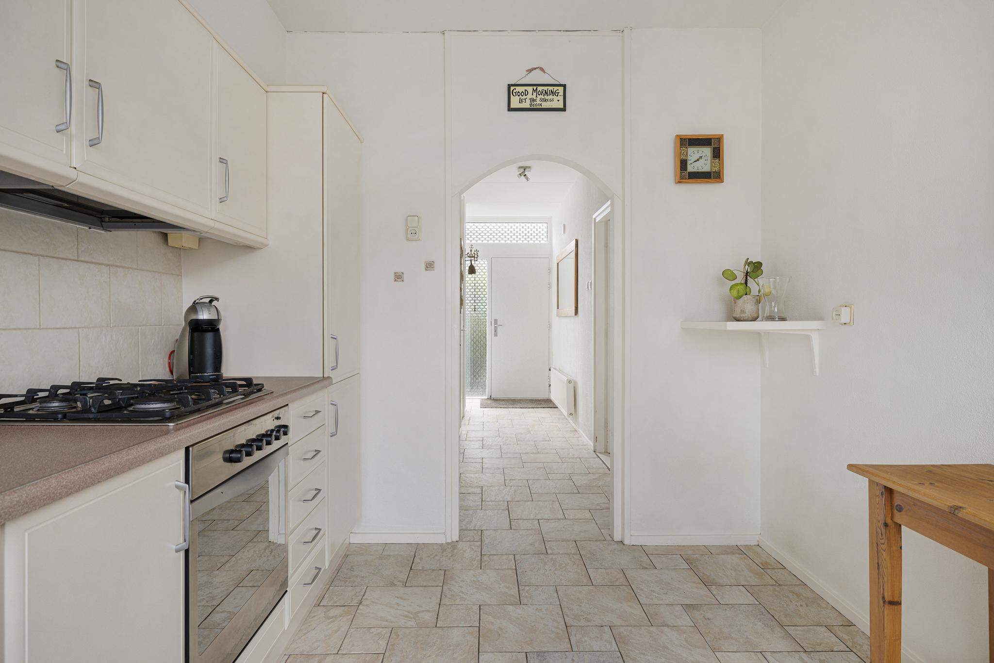 Keuken in wandopstelling met spoelbak, 4 pits gaskookplaat, oven, koelkast met vriezer en deur naar de tuin.