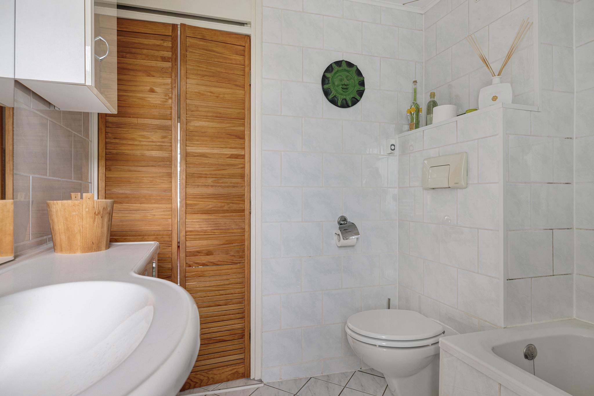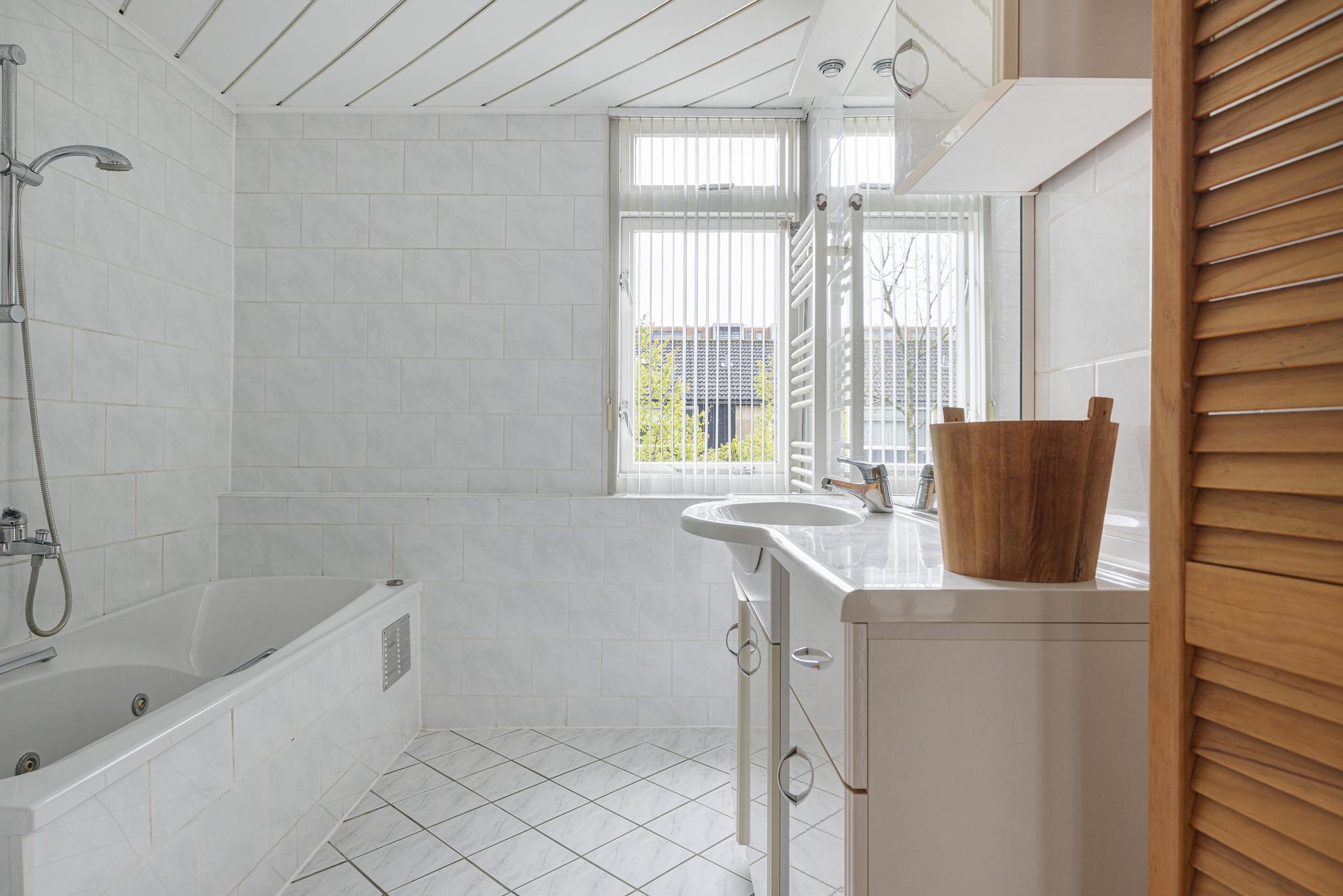 Badkamer met vrijhangend toilet, bad met whirlpool en jets, wastafel met meubel.