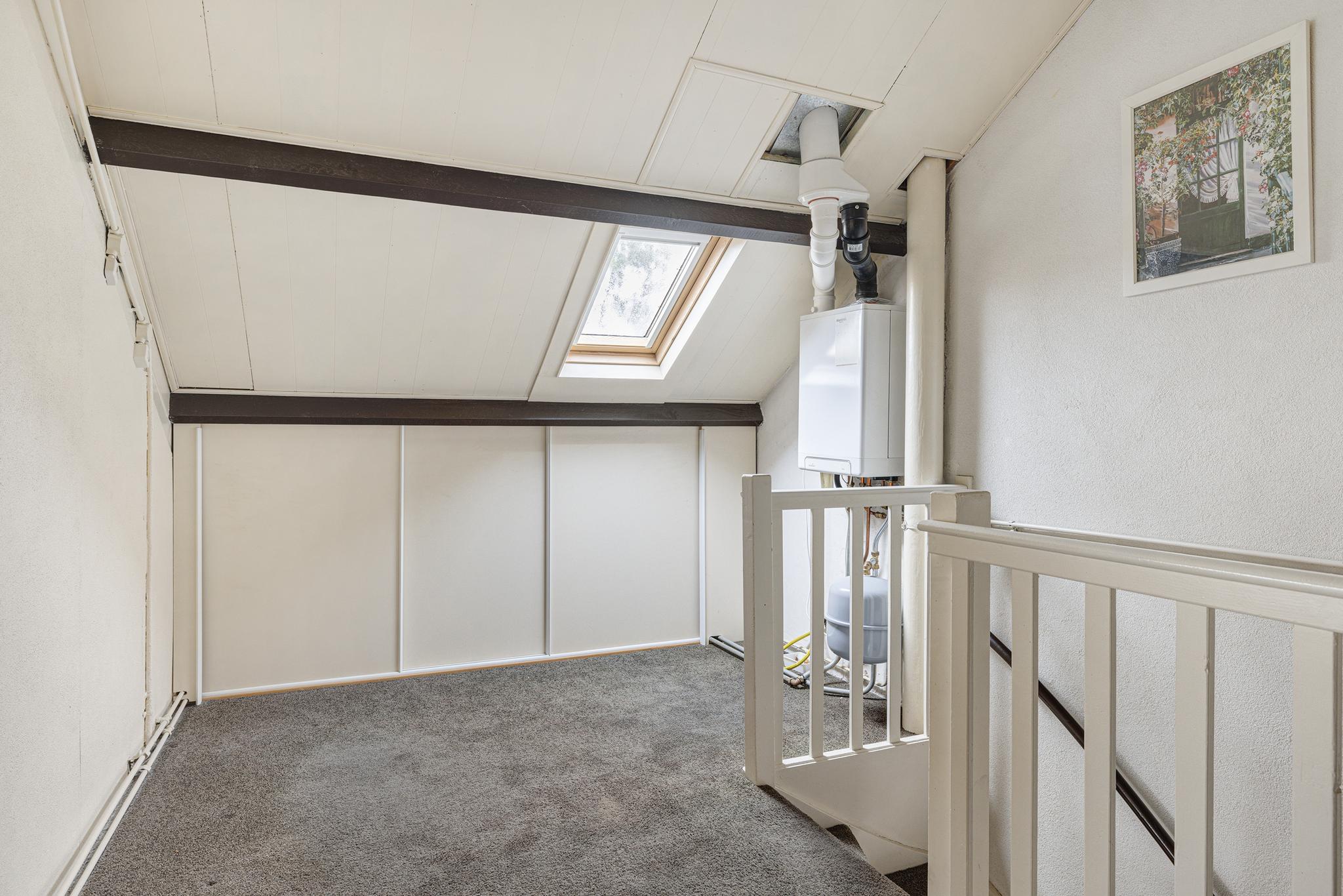 Grote overloop met opstelling van de CV ketel merk Intergas, bouwjaar 2018, dakraam en bergruimte onder het schuine dak.