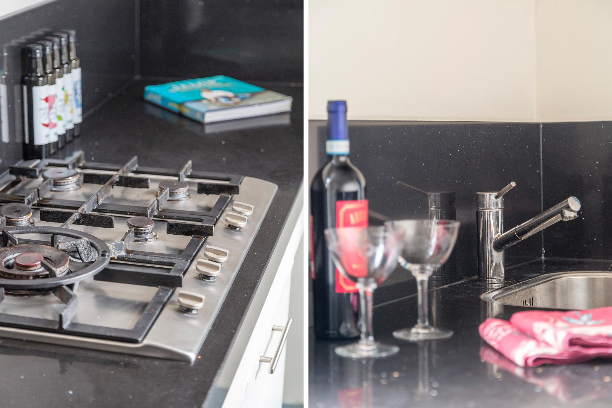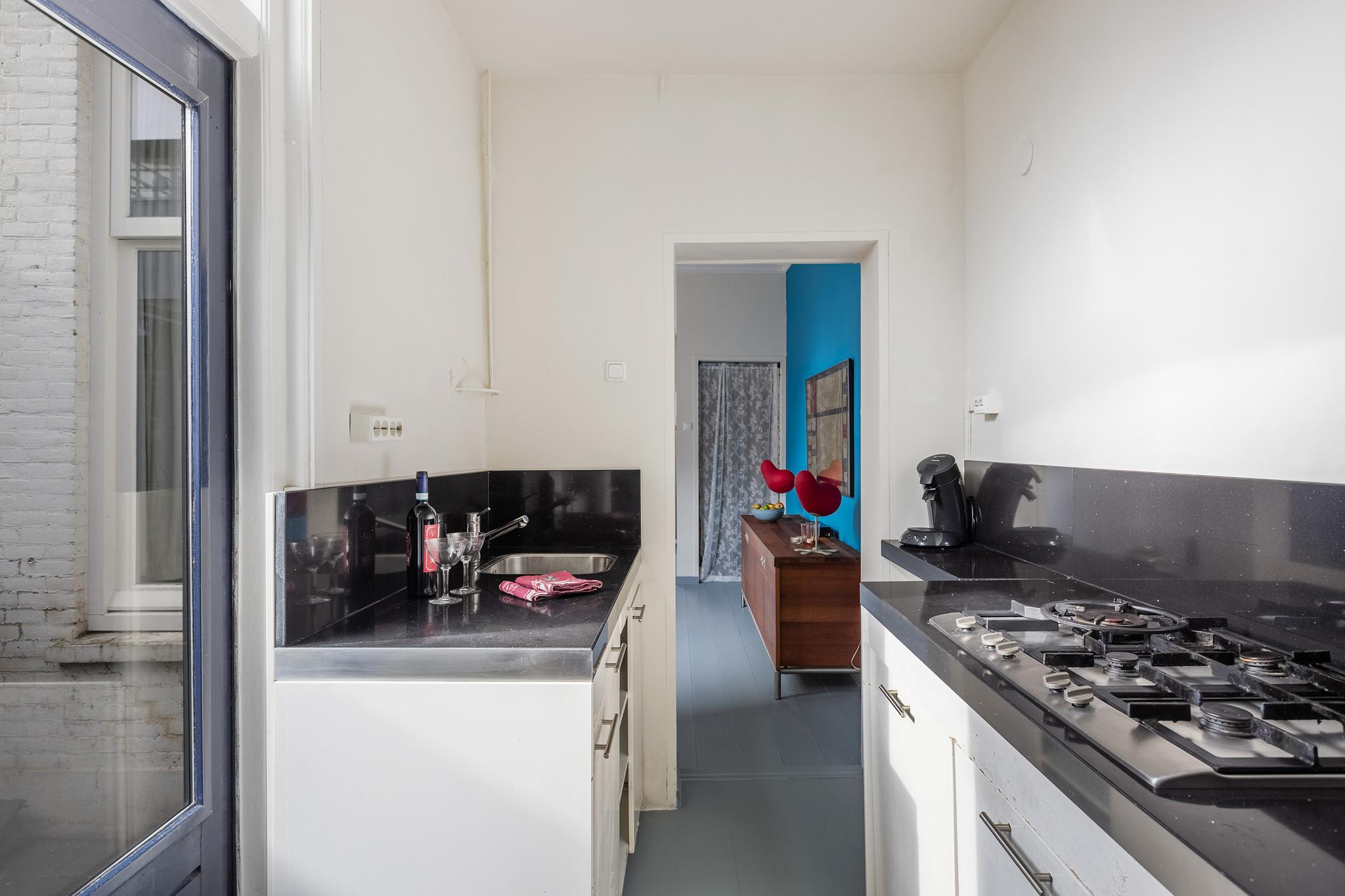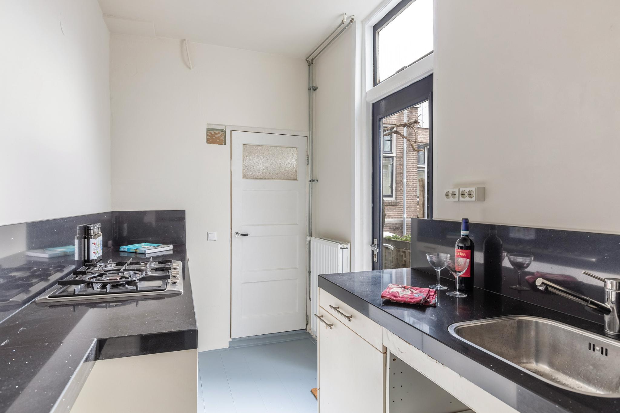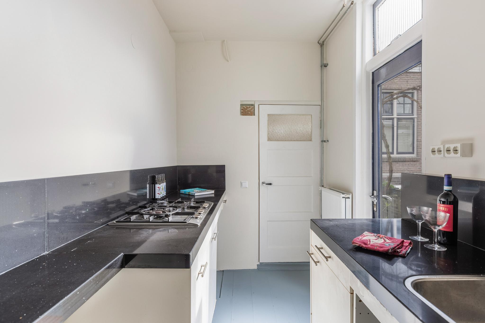 Vanuit de woonkamer is de keuken in de aanbouw begaanbaar, deze is opgesteld in een dubbele wandopstelling en beschikt over een 5-pit gaskookplaat, koelkast, vriezer, vaatwasser (2021 vervangen) en een graniet werkblad. Vanuit de keuken is de badkamer aan achterzijde en de achtertuin bereikbaar.