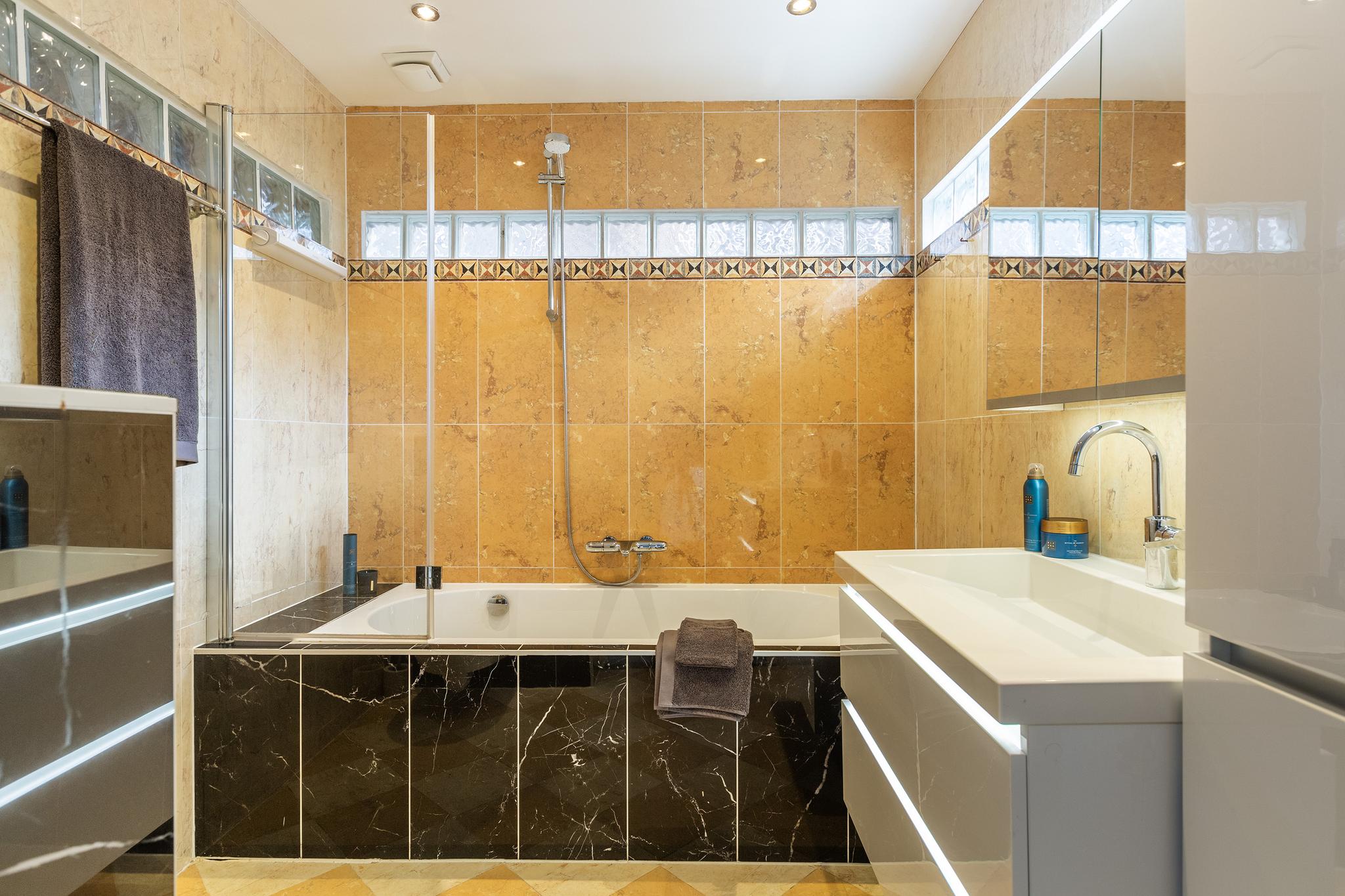 De badkamer is in 2021 aangepakt, deze is volledig betegeld en voorzien van een ligbad, wasmeubel, spiegelkast, toilet, vloerverwarming en mechanische ventilatie. De wanden van de badkamer zijn vanaf de buitenzijde geïsoleerd en met hout afgewerkt.
