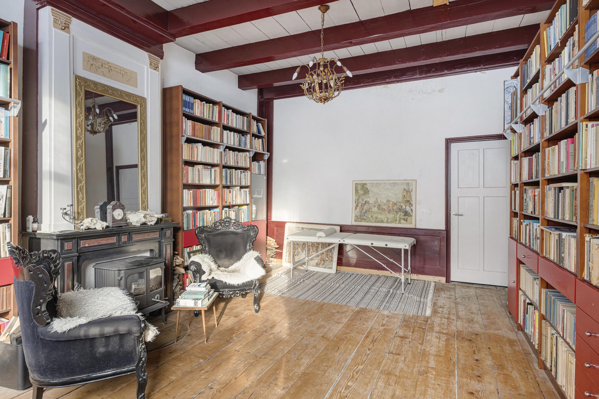 Hier komen we uit in de achterkamer met mooie zwart marmeren schouw en diverse oude muurschilderingen. Vanaf deze locatie kijk je op het water. Heerlijke werkkamer met veel licht en hoge ramen. De originele brede vloerplanken zijn hier in het zicht gelaten.