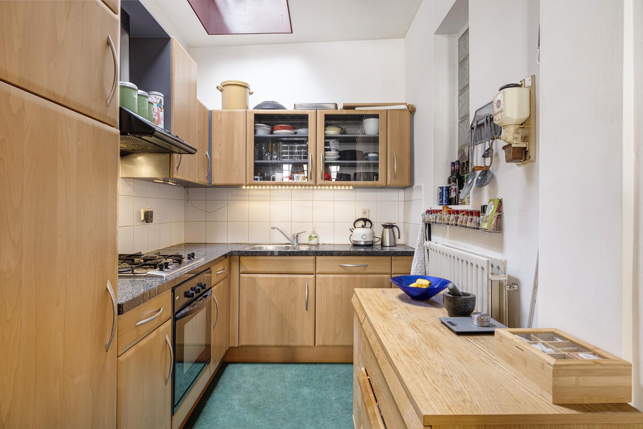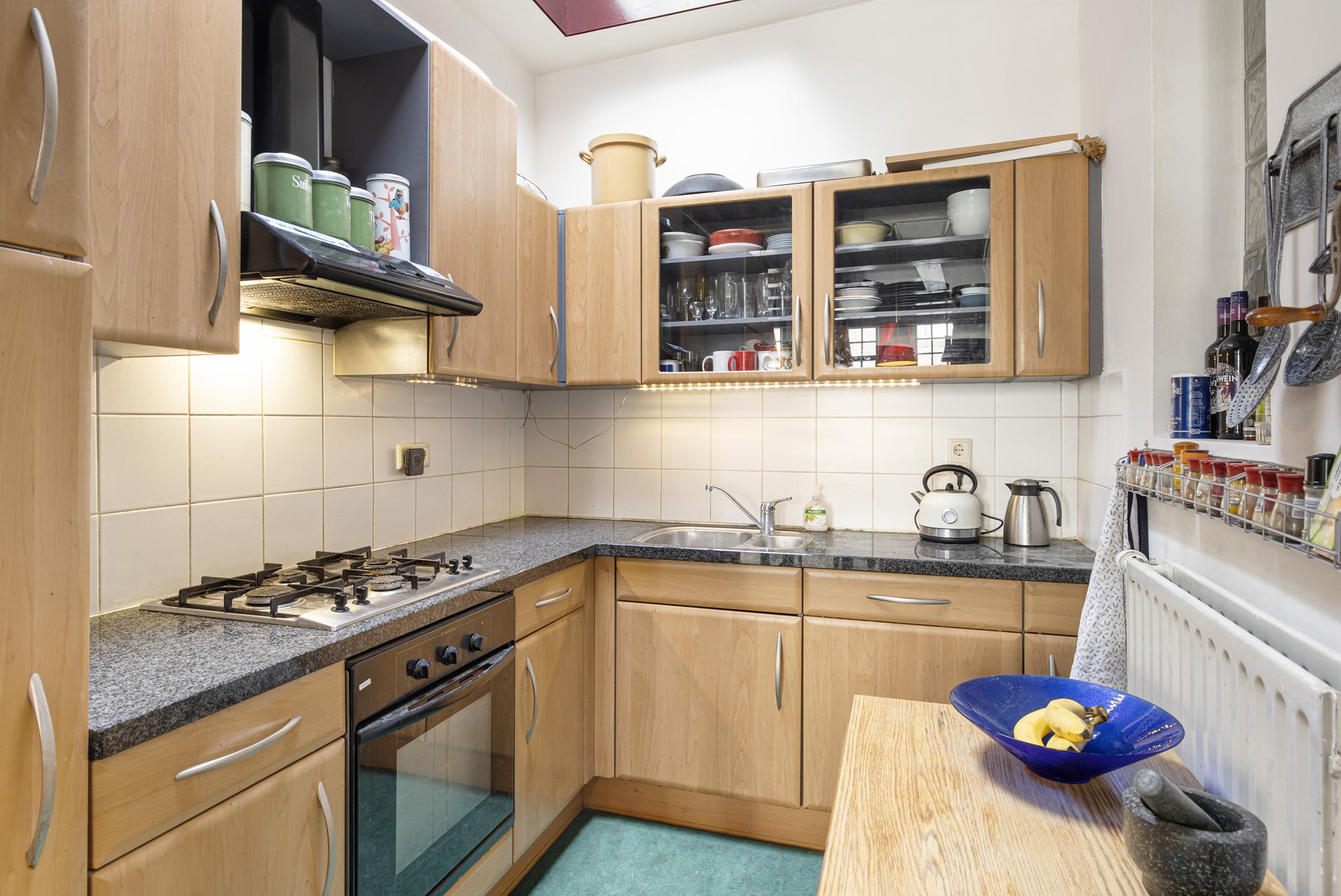 Keuken in hoekopstelling voorzien van 4 pits gaskookplaat, afzuigkap, spoelbak, oven, vaatwasser, koelkast met vriezer. De keuken en apparatuur zijn verouderd.