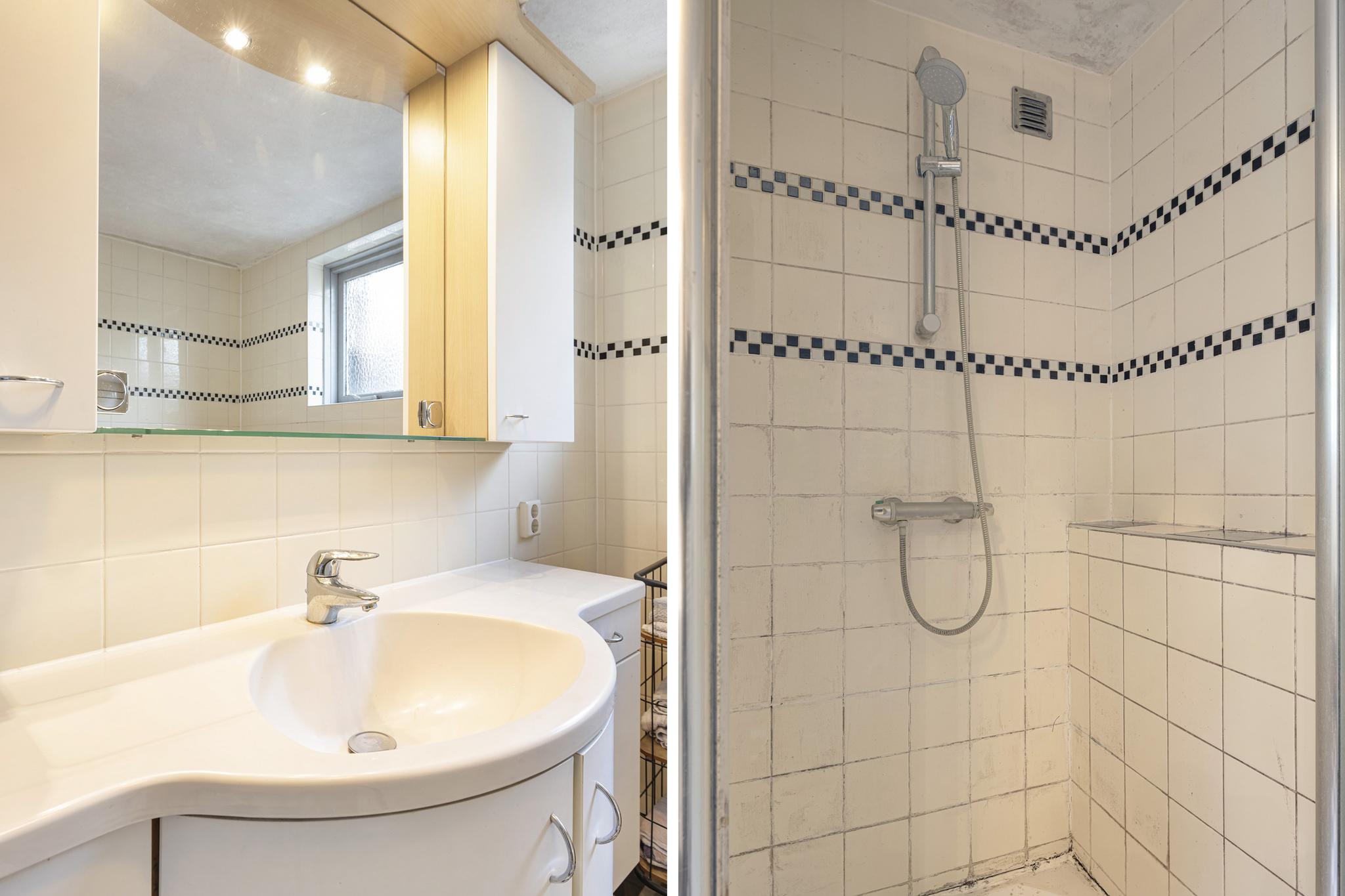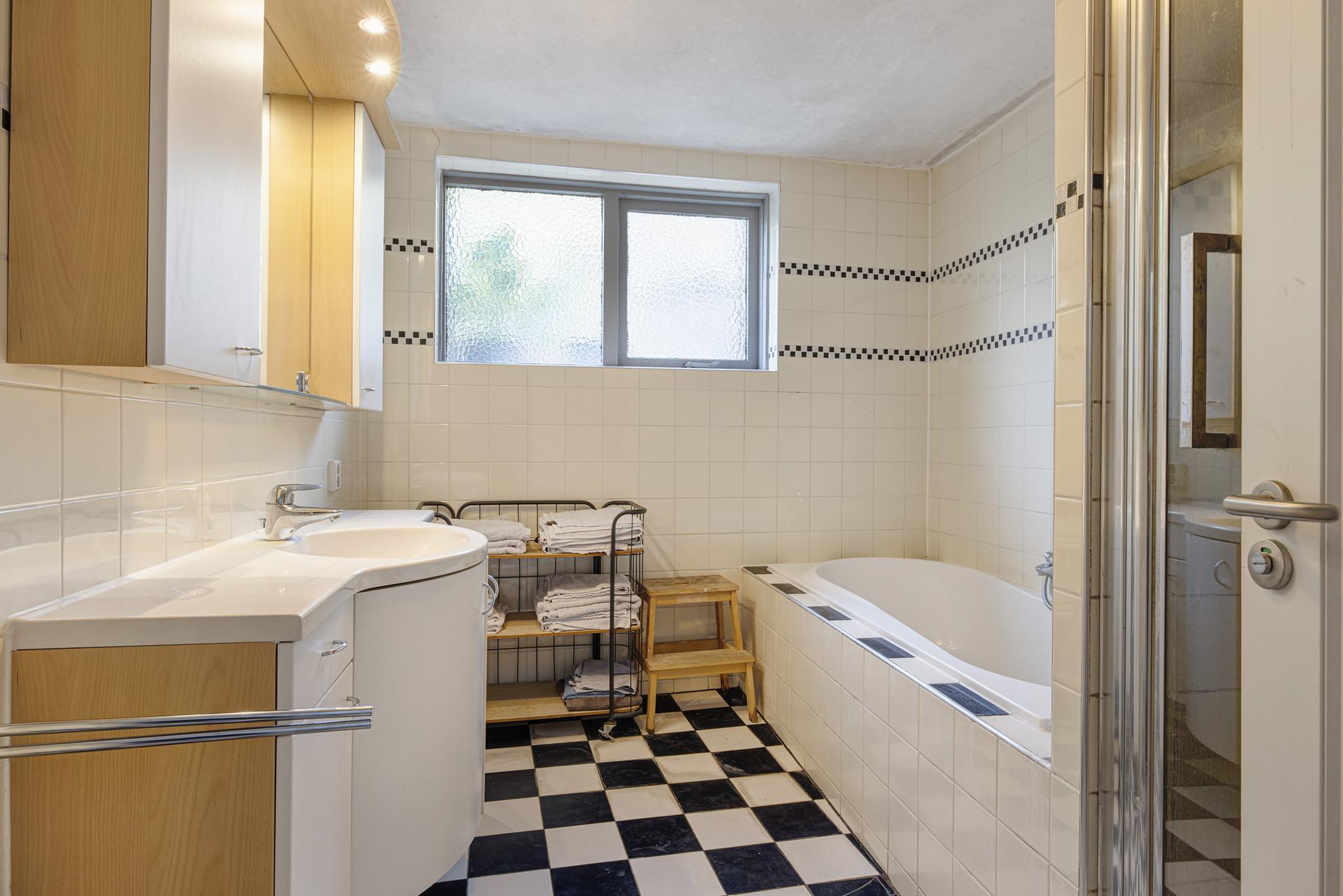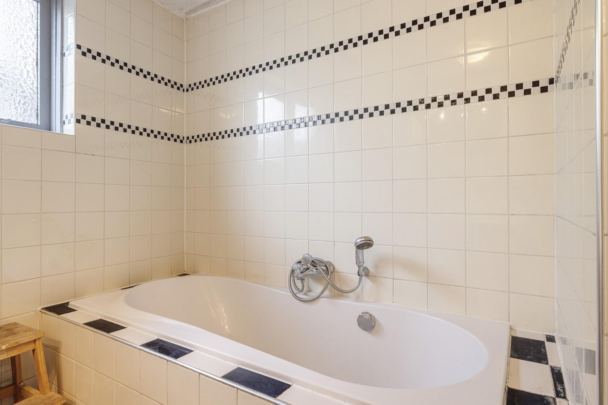 Badkamer met bad, wastafel in meubel en douche (douche thans niet bruikbaar) en deels betegelde wanden.
