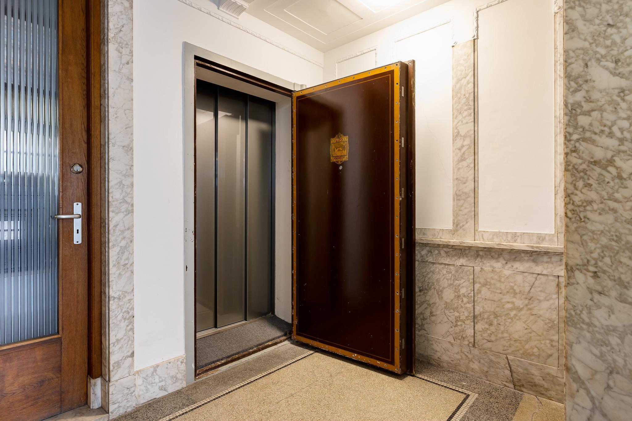 Dankzij de lift is dit appartement voor iedereen goed bereikbaar – ook met boodschappen of kinderwagen. De lift is bovendien stijlvol weggewerkt in de voormalige Lips-kluis van het pand, een uniek detail dat het verhaal van het huis als oud bankgebouw versterkt.