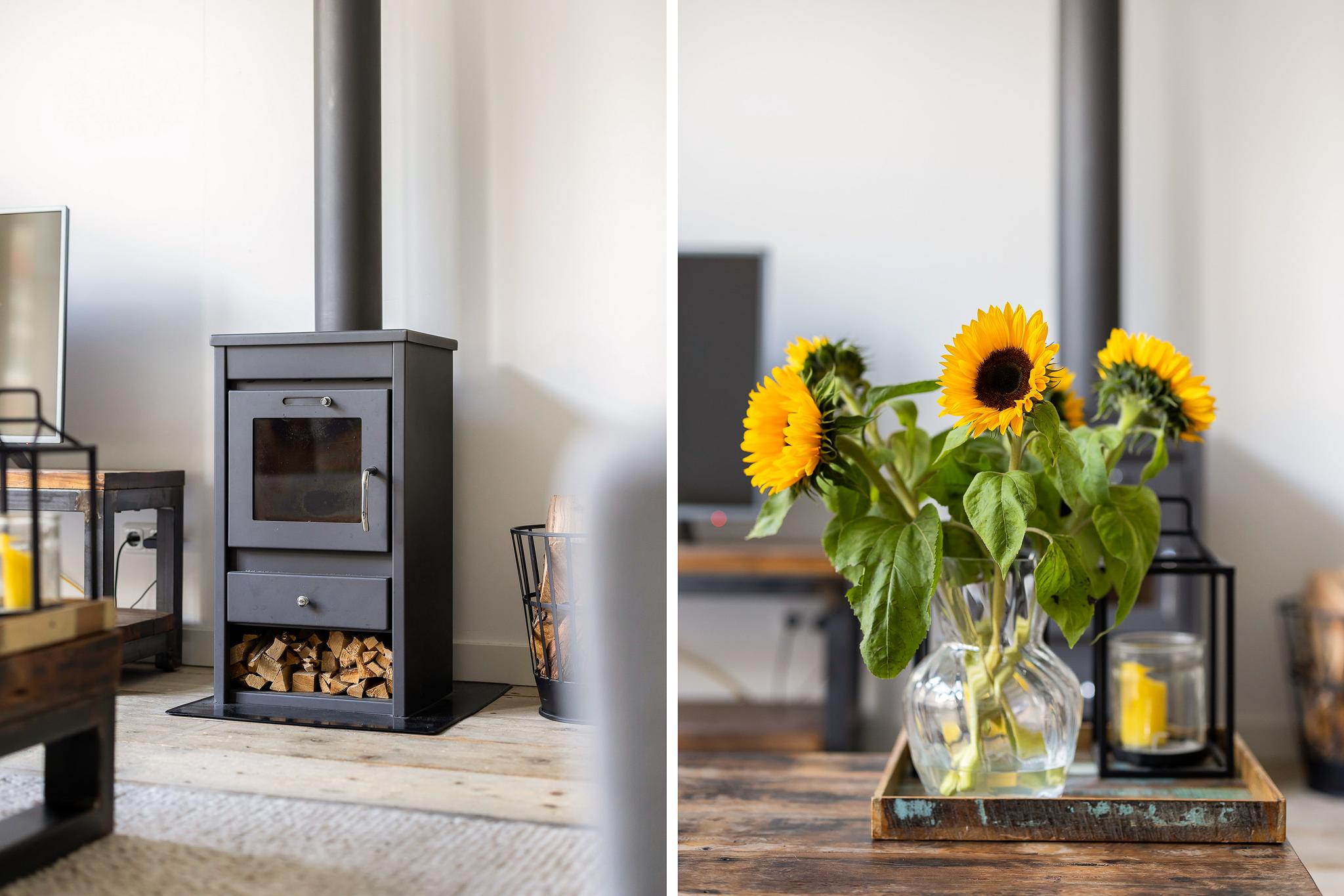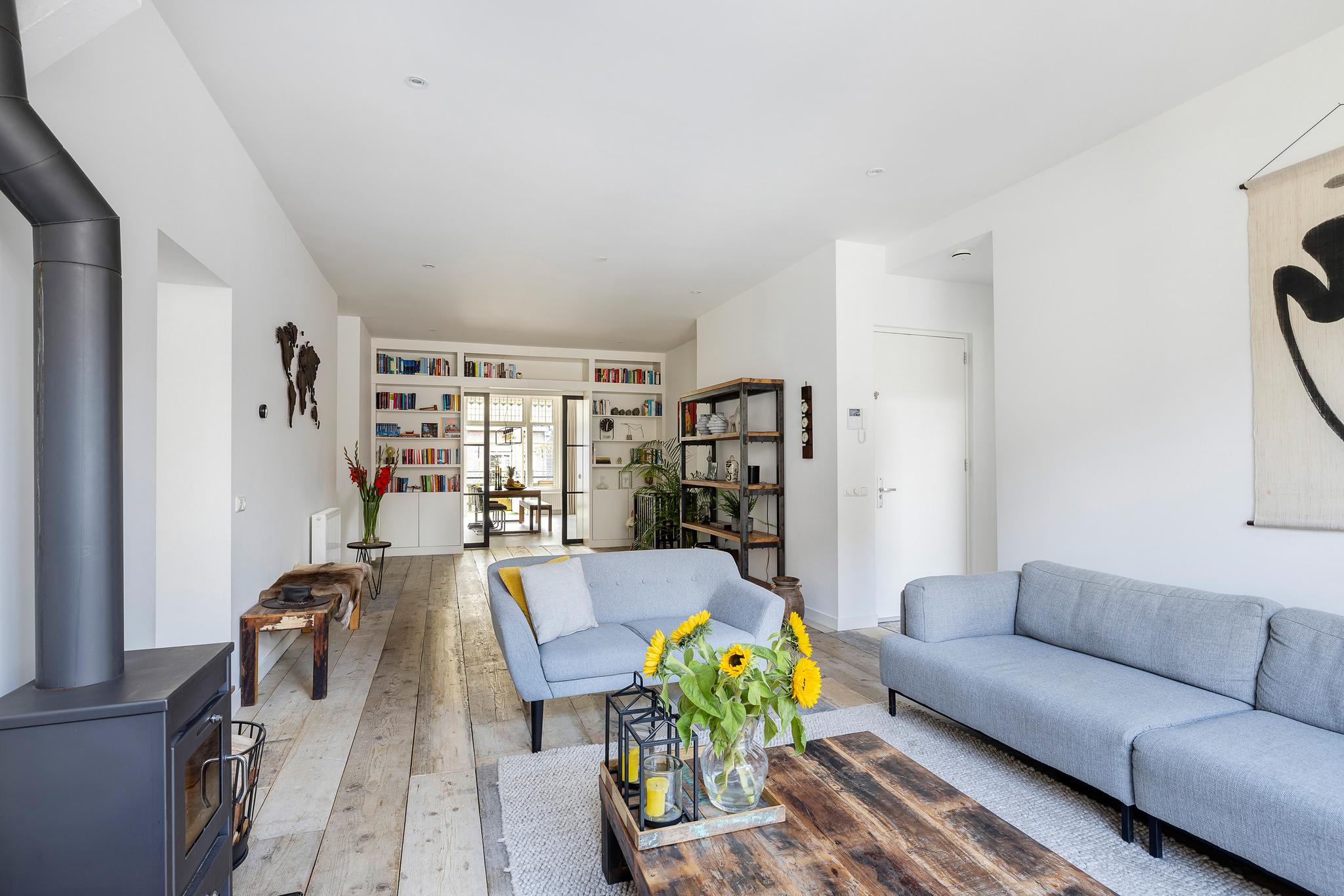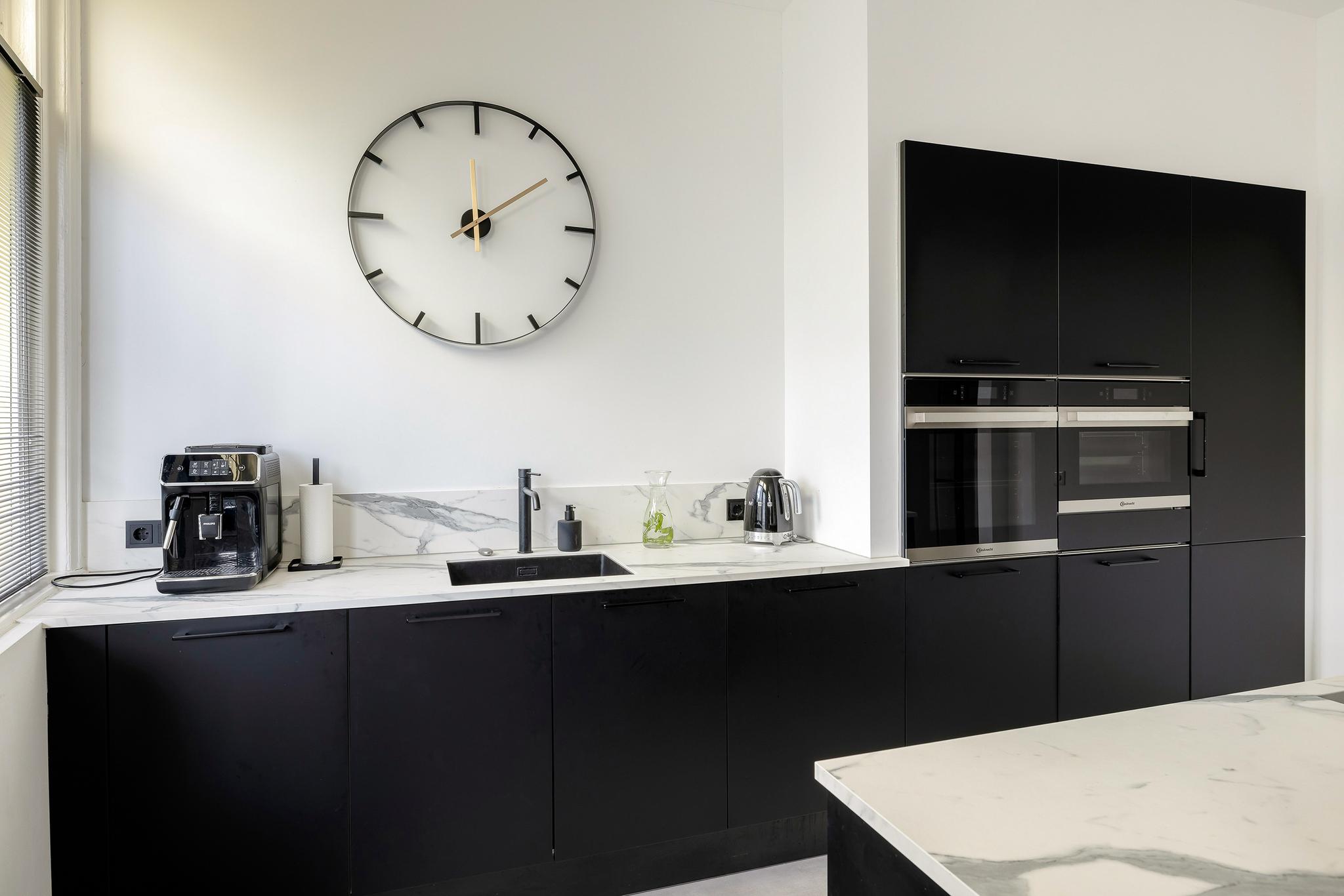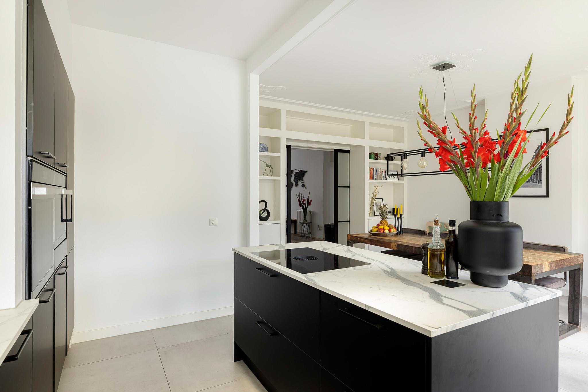 De woonkamer-en-suite is het hart van de woning – een sfeervolle ruimte met houtkachel, stijlvolle schuifdeuren en vaste kasten. De leefkeuken is een plek waar je samenkomt, kookt en geniet. Het kookeiland, hoogwaardige apparatuur en openslaande deuren naar het balkon maken het tot een plek waar je met gemak uren doorbrengt.
