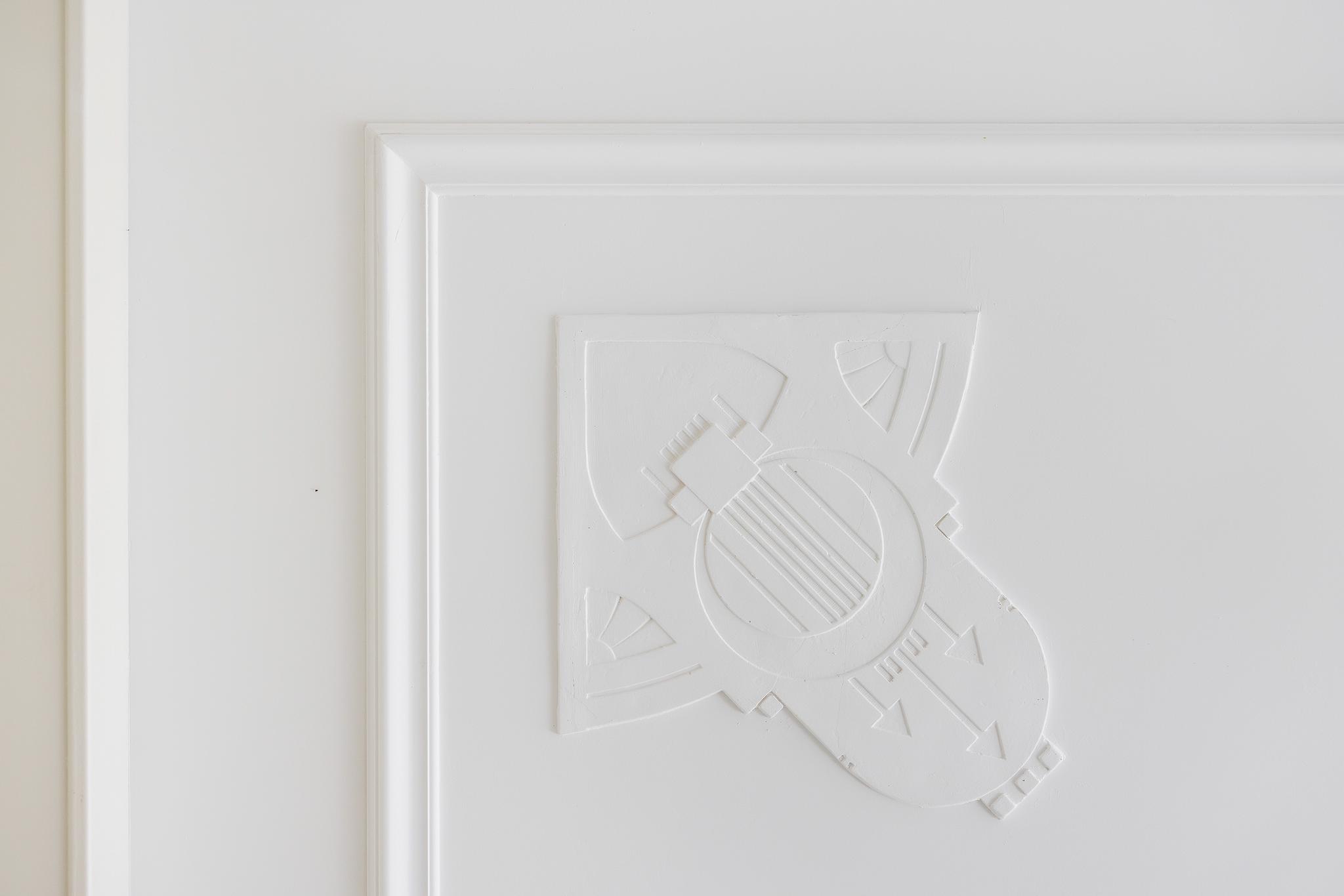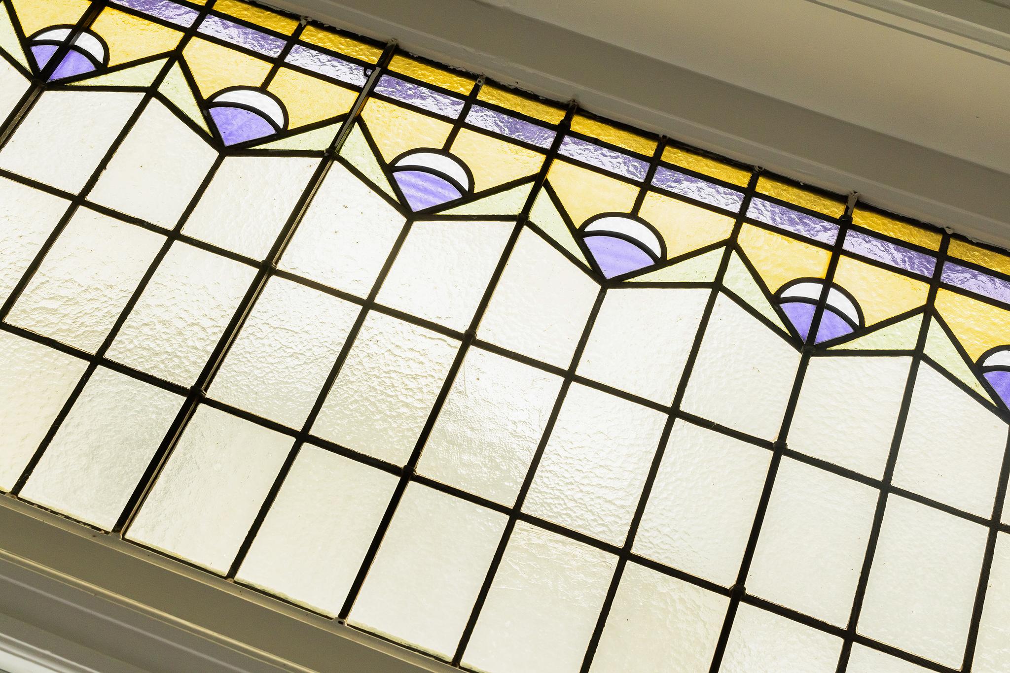 Authentieke details zoals glas-in-loodramen, houten vloer en ornamentenplafond