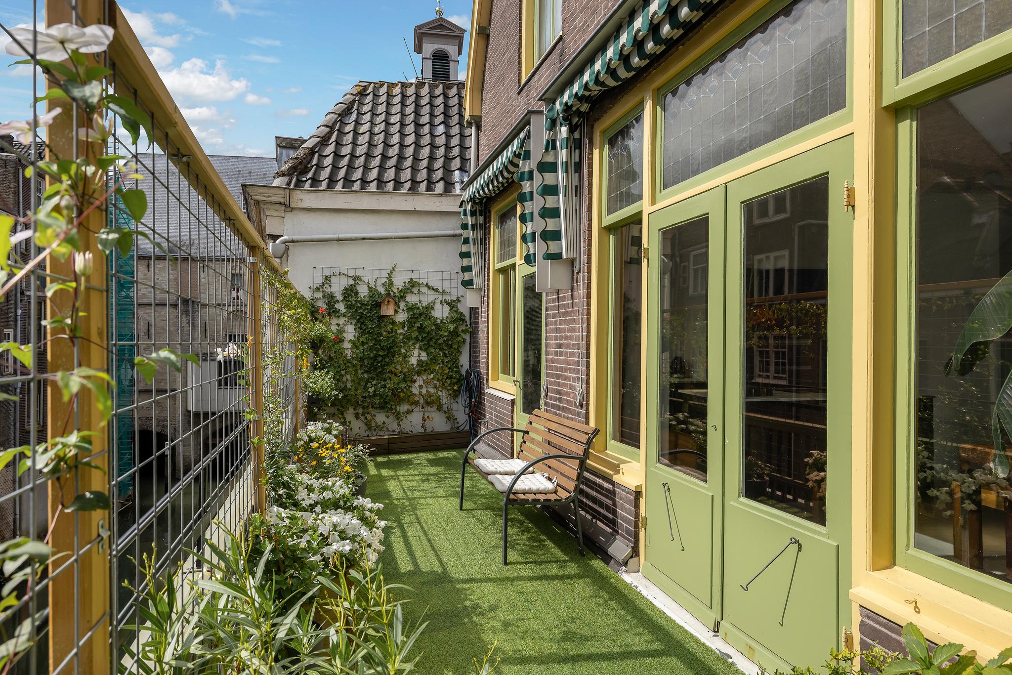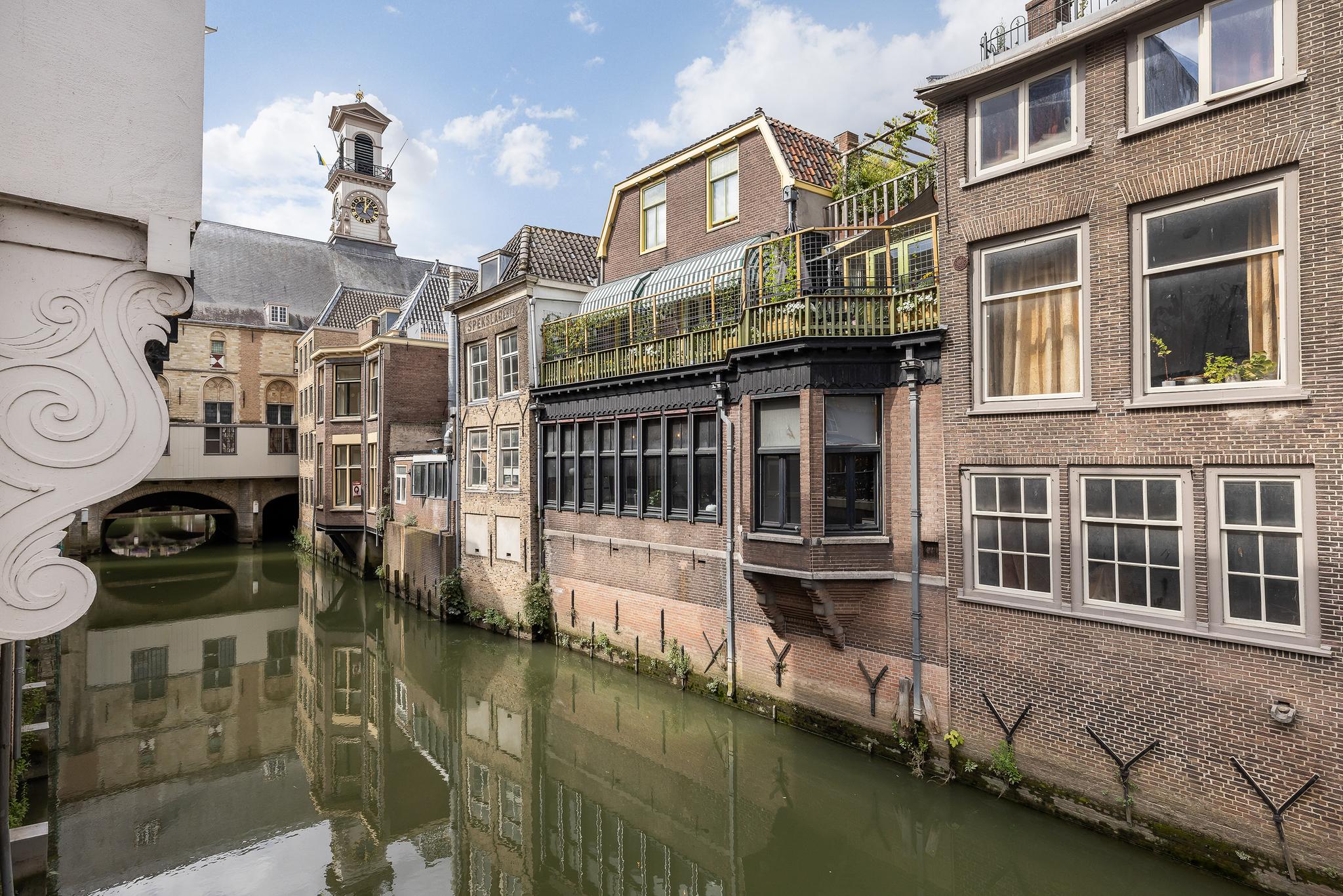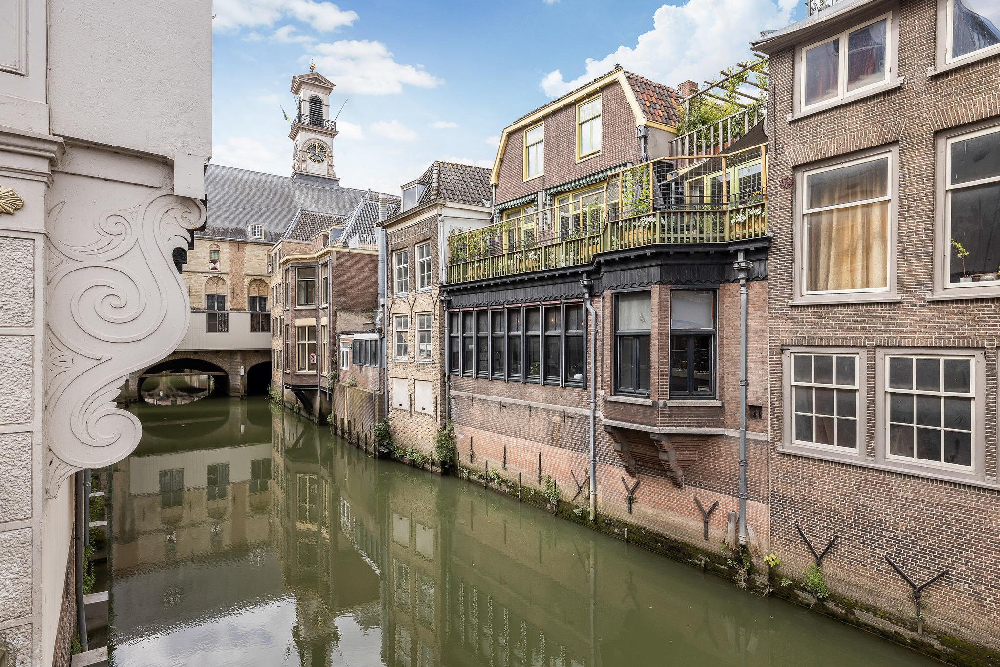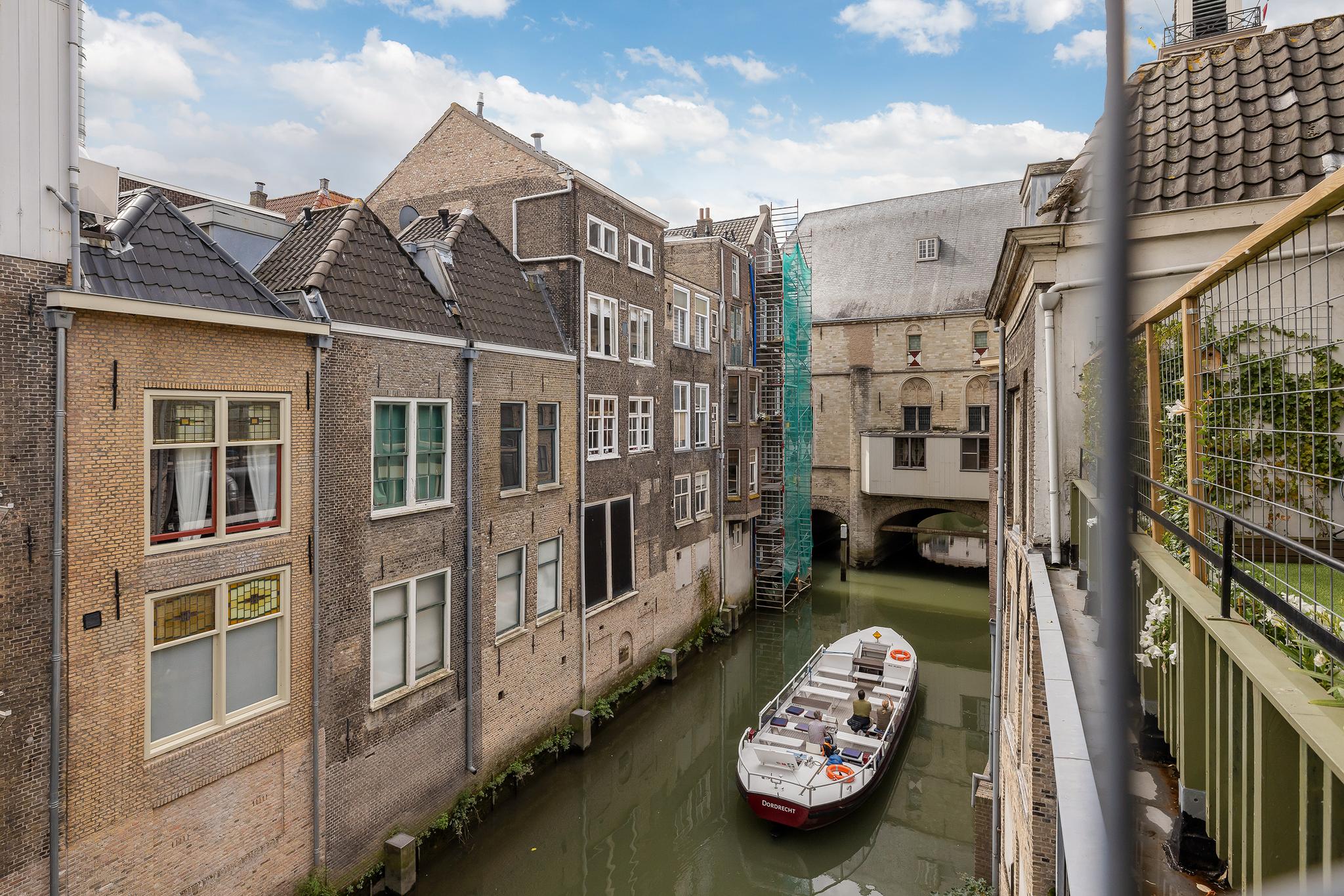 Het balkon is heerlijk breed en gelegen op het zuiden, met uitzicht op de schilderachtige gracht. Geniet hier van het levendige uitzicht op het gezellige terras van Centre Ville, het mooie uitzicht op het stadhuis en de bootjes die onder je door varen. De karakteristieke groen-witte markiezen zorgen niet alleen voor verkoeling op warme zomerdagen, maar geven het balkon ook een charmante en gezellige uitstraling. Een unieke plek om je dag te beginnen met een kop koffie of te eindigen met een glas wijn in de middagzon. Het buitenschilderwerk is zeer recent uitgevoerd en sluit perfect aan bij de monumentale uitstraling van het pand. Op de foto’s zijn nog de oude kleuren te zien, maar inmiddels is het pand geschilderd in zachte, warme tinten uit de officiële Dordtse kleurenwaaier – een elegante combinatie van beige en donkergroen.