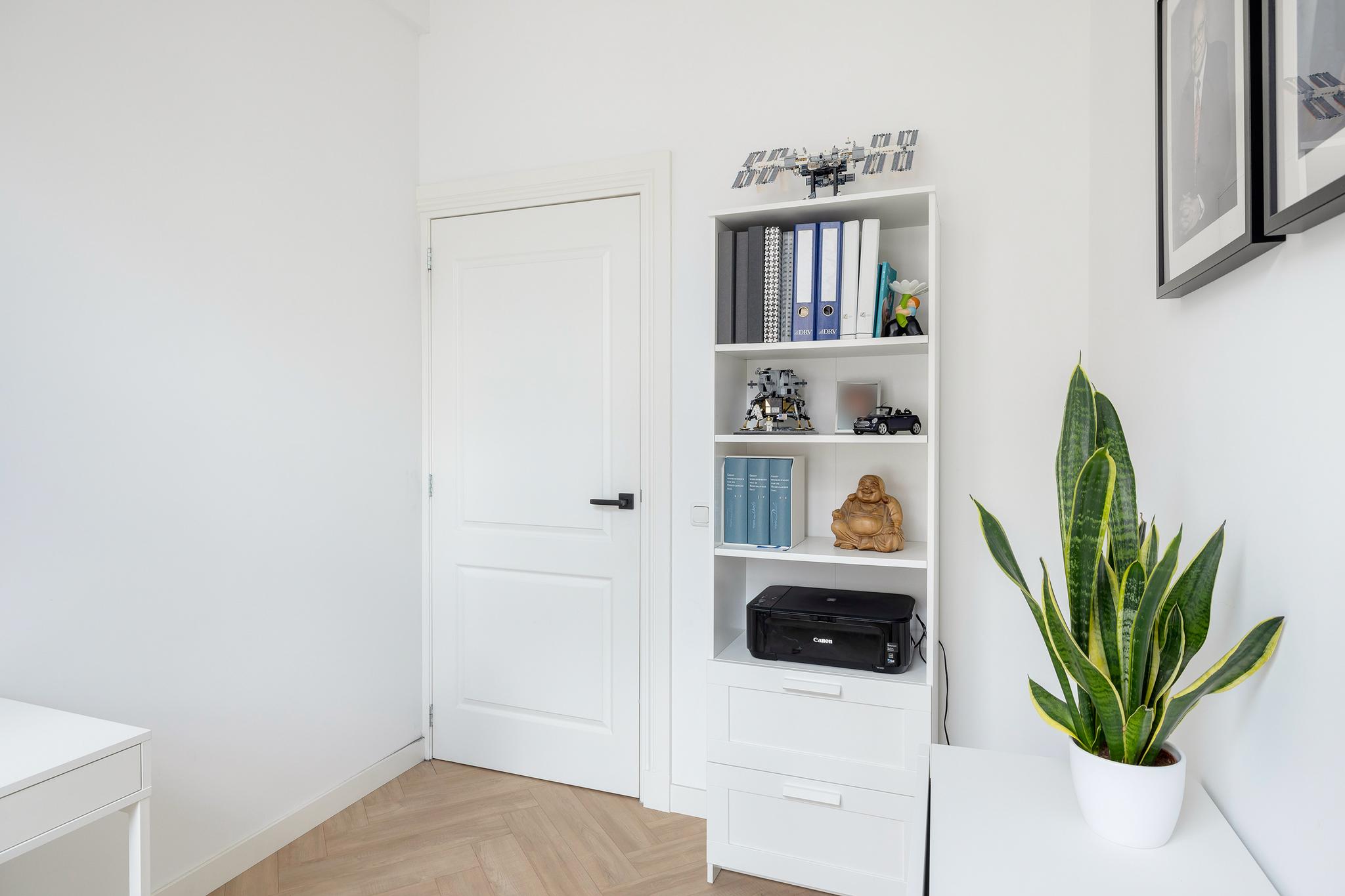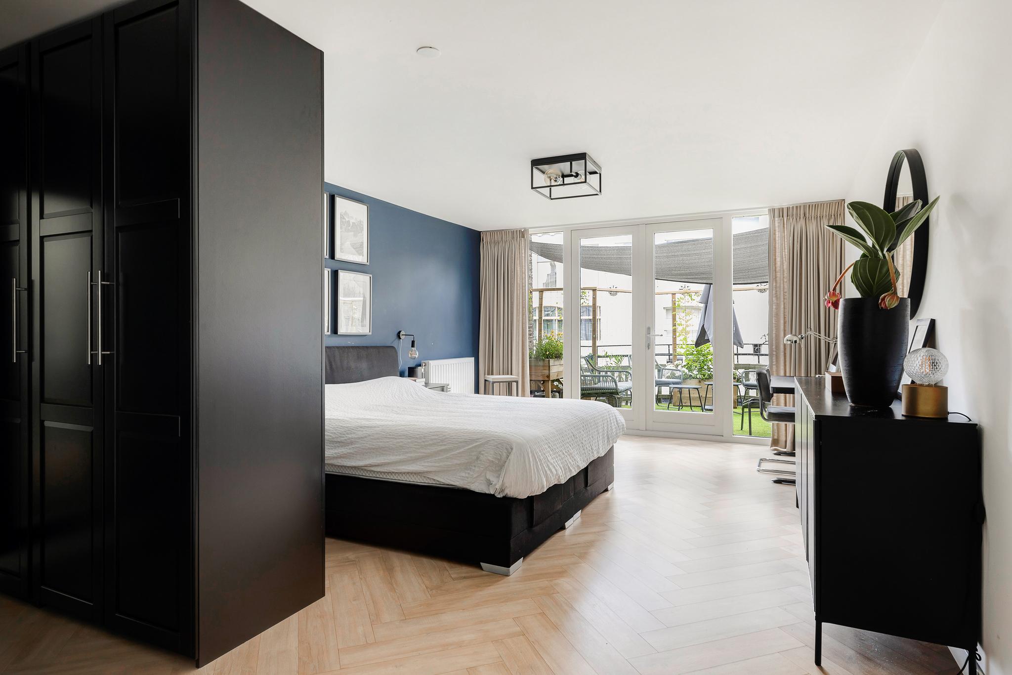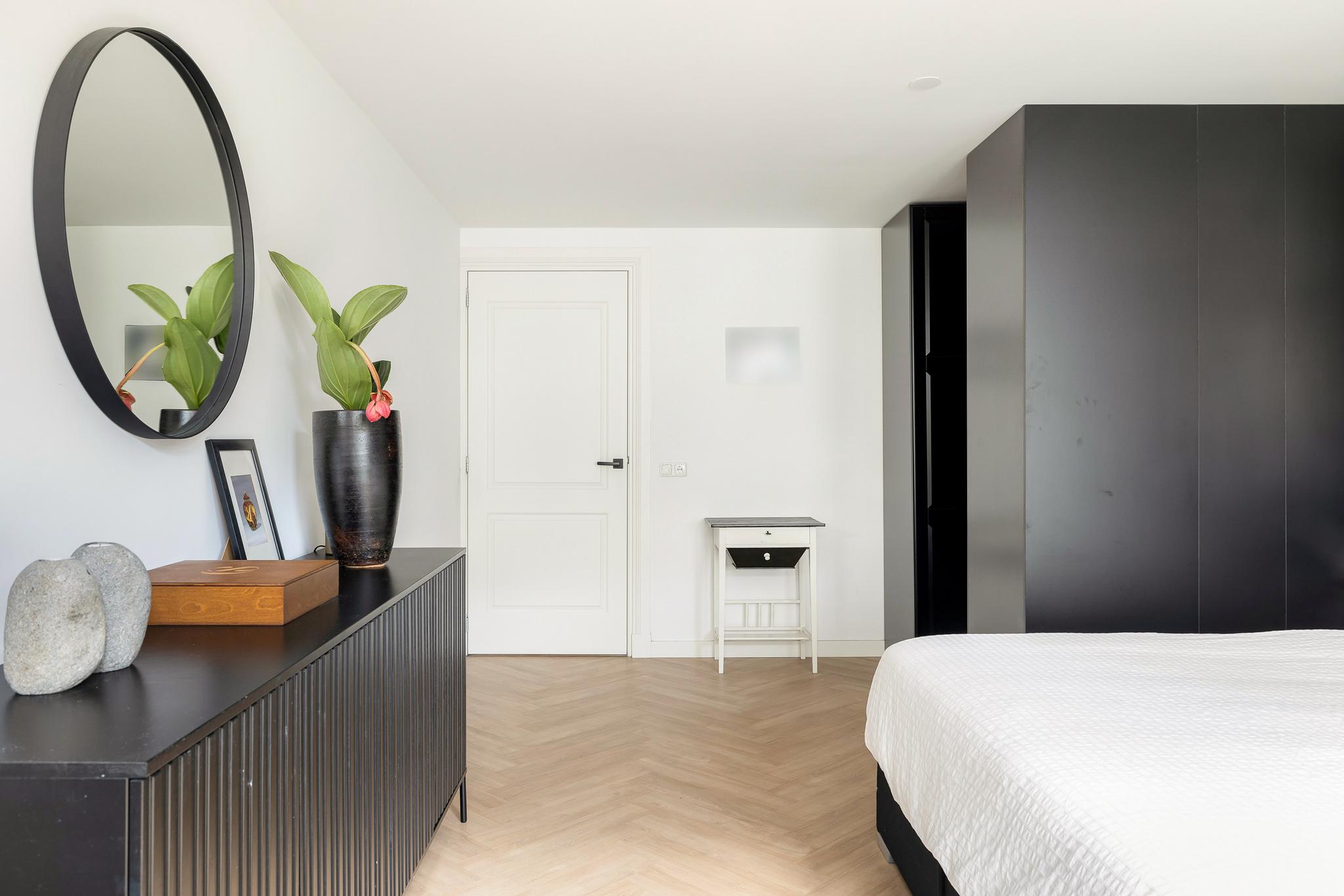Het appartement beschikt over drie slaapkamers: twee lichte kamers aan de voorzijde en een riante master bedroom aan de achterzijde met openslaande deuren naar het balkon. De inloopkast maakt deze kamer extra comfortabel. De luxe badkamer, met ligbad, inloopdouche, dubbele wastafel en speelse ronde binnenwand, is een ware eyecatcher. Daarnaast zijn er een praktische bijkeuken én een aparte technische ruimte voor wasmachine en droger.