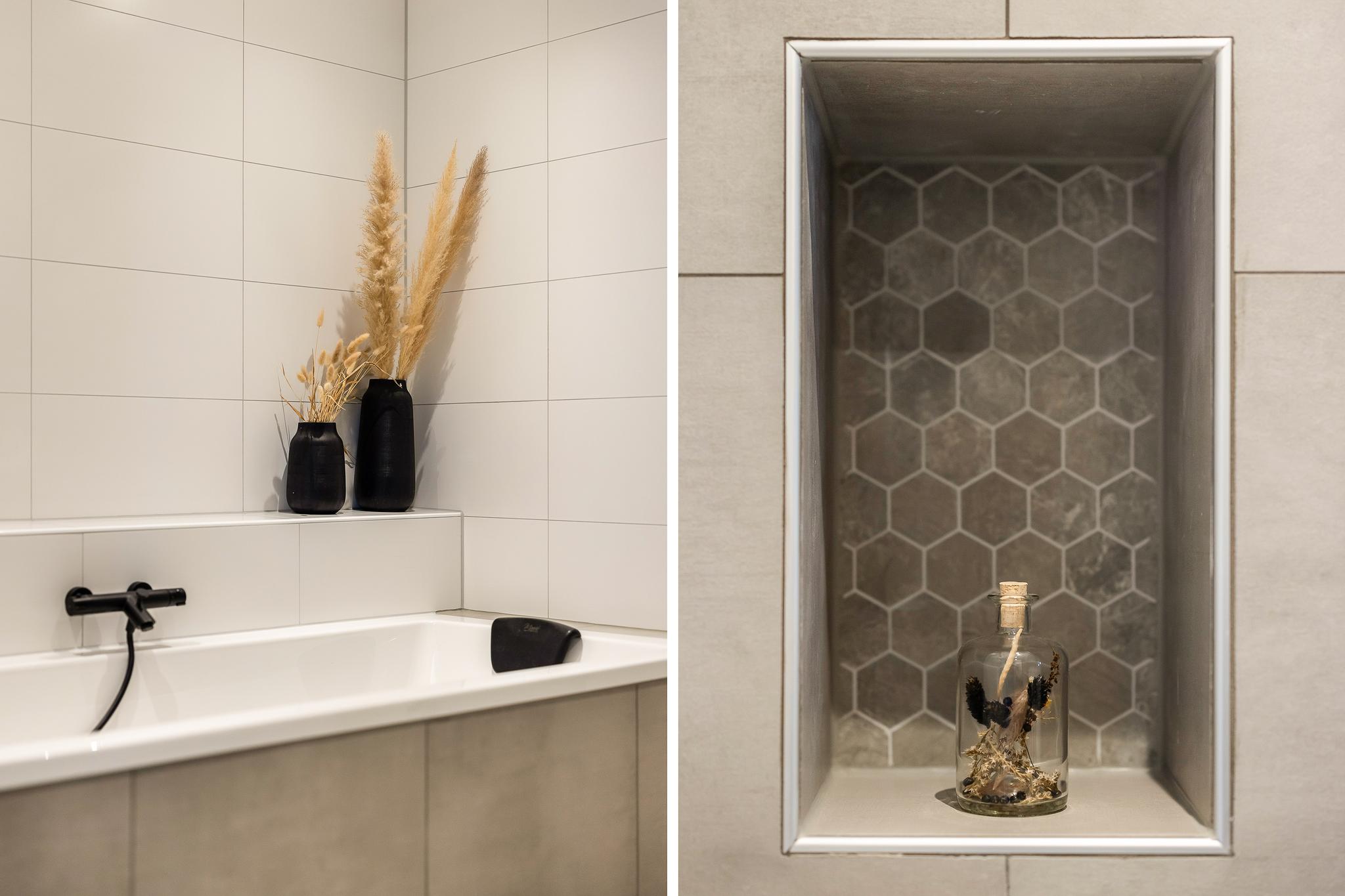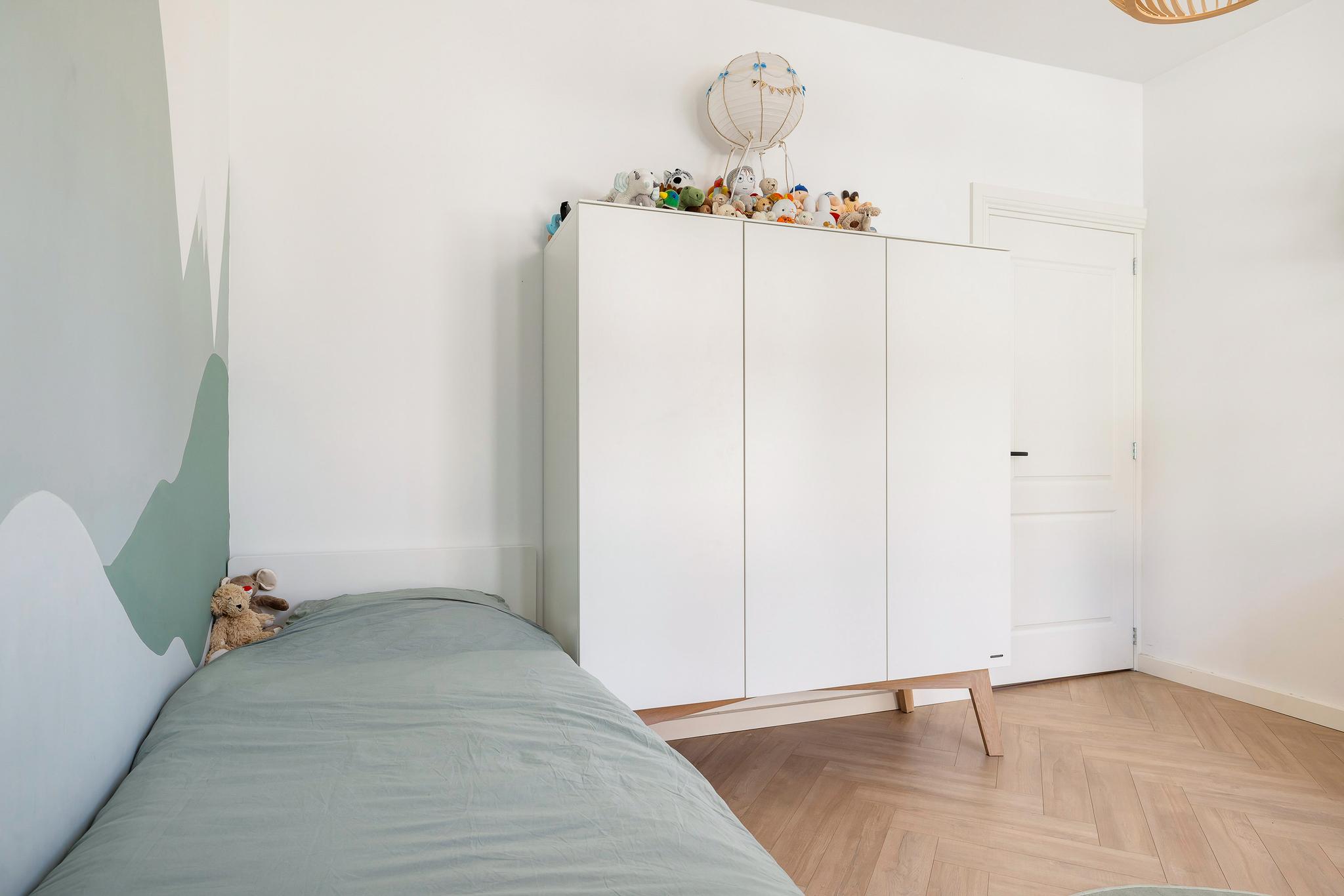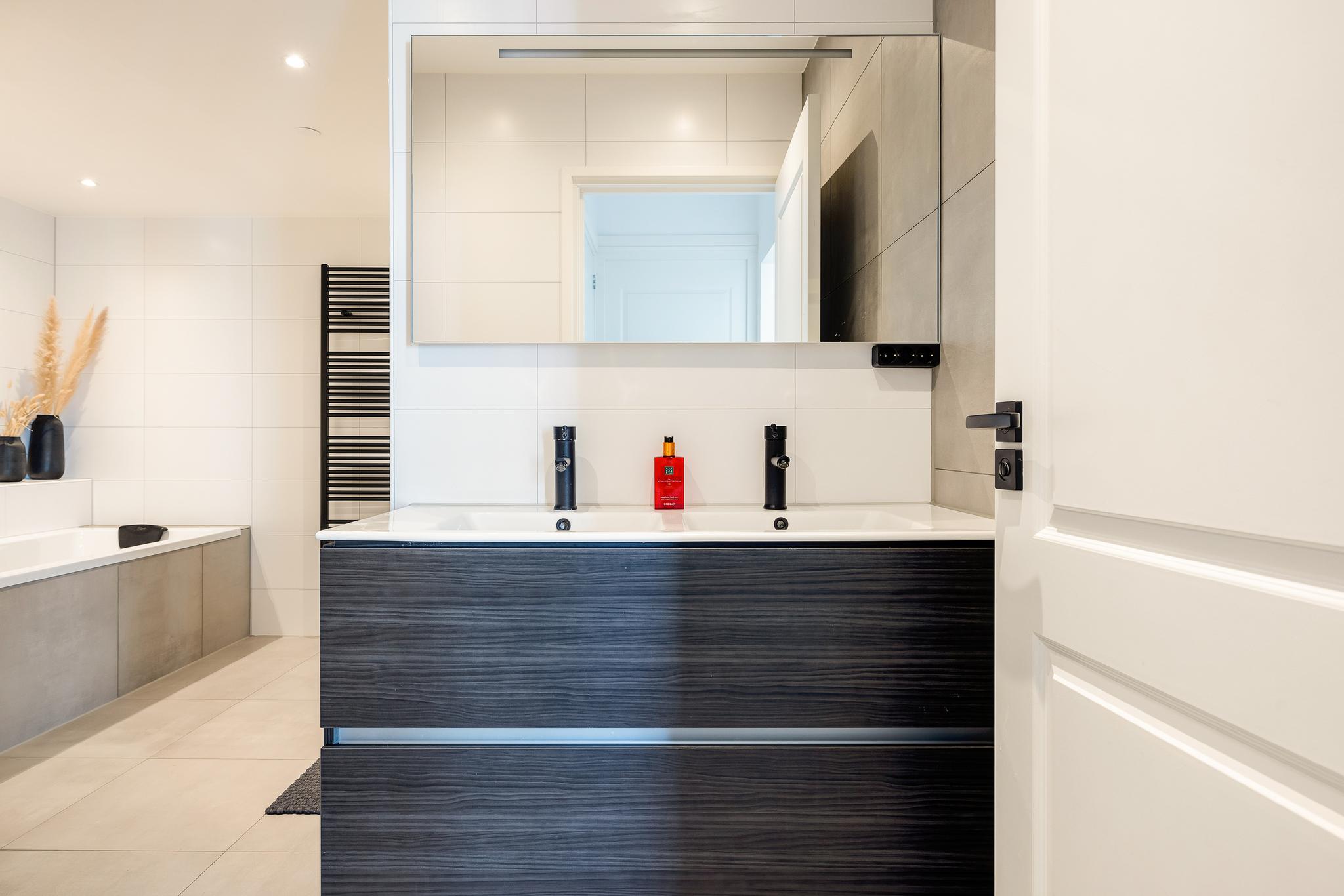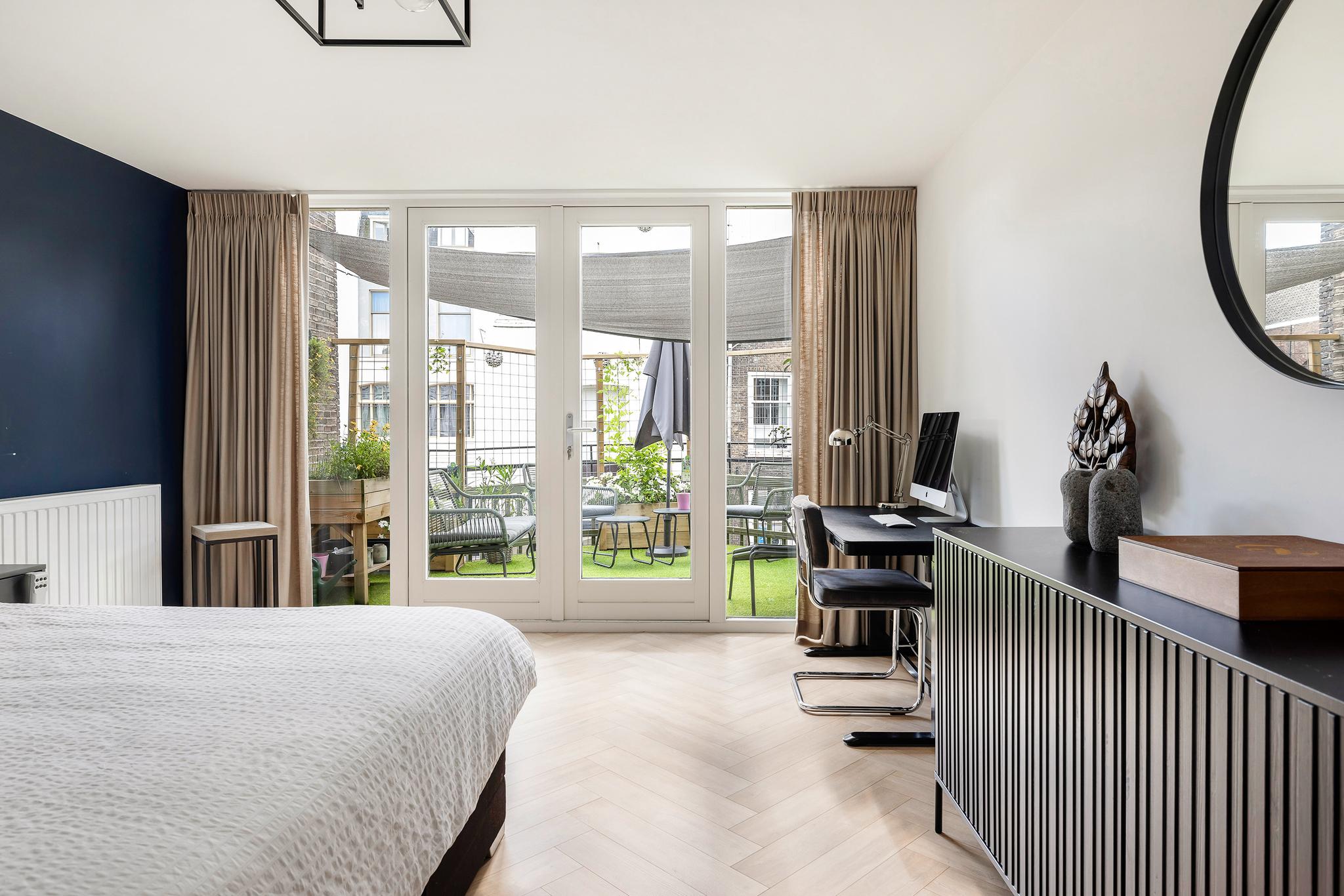 Het appartement beschikt over drie slaapkamers: twee lichte kamers aan de voorzijde en een riante master bedroom aan de achterzijde met openslaande deuren naar het balkon. De inloopkast maakt deze kamer extra comfortabel. De luxe badkamer, met ligbad, inloopdouche, dubbele wastafel en speelse ronde binnenwand, is een ware eyecatcher. Daarnaast zijn er een praktische bijkeuken én een aparte technische ruimte voor wasmachine en droger.