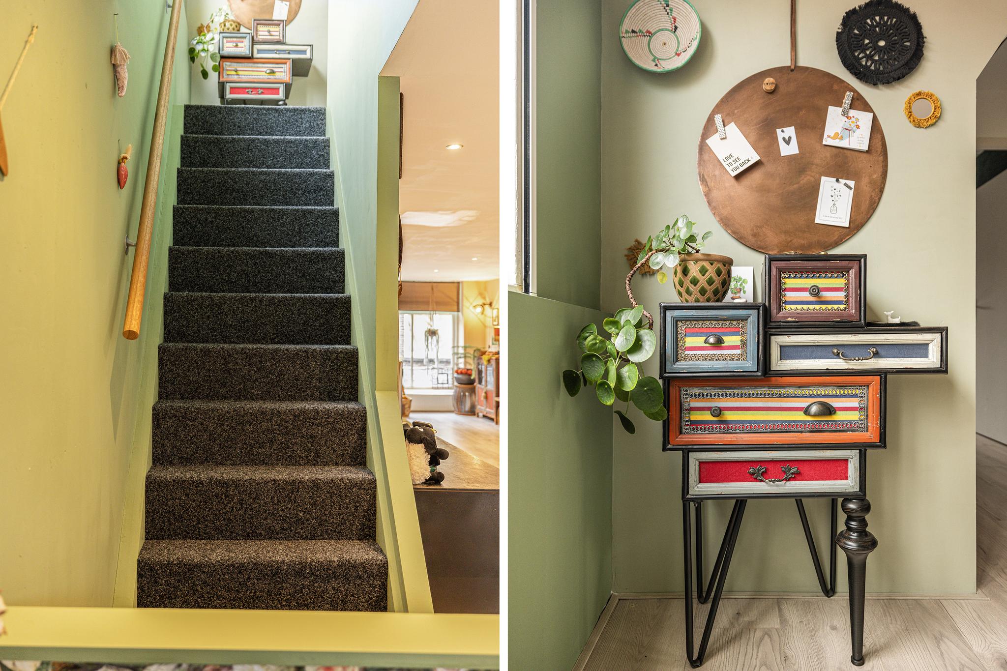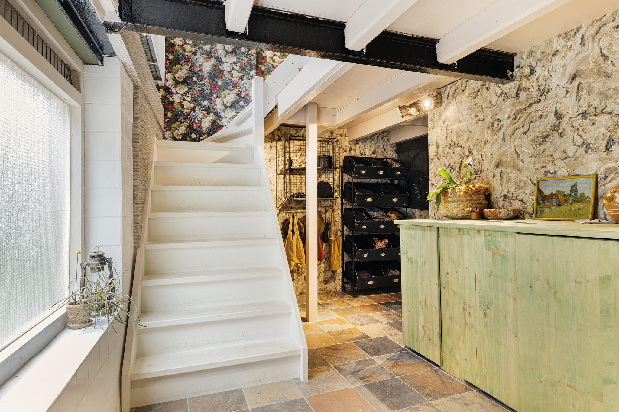 Entree in de ruime hal met garderobe hoek en trap naar de winkel ruimte. Er is een kast aanwezig waar de wasapparatuur in is weggewerkt. Mooie brede trap naar de woonverdieping.