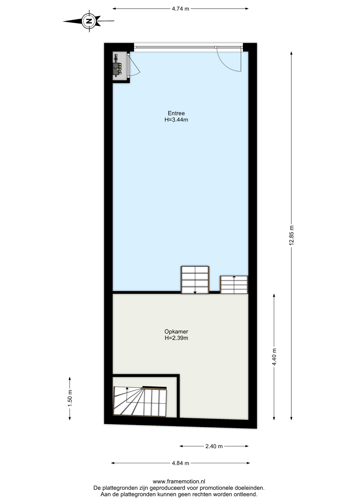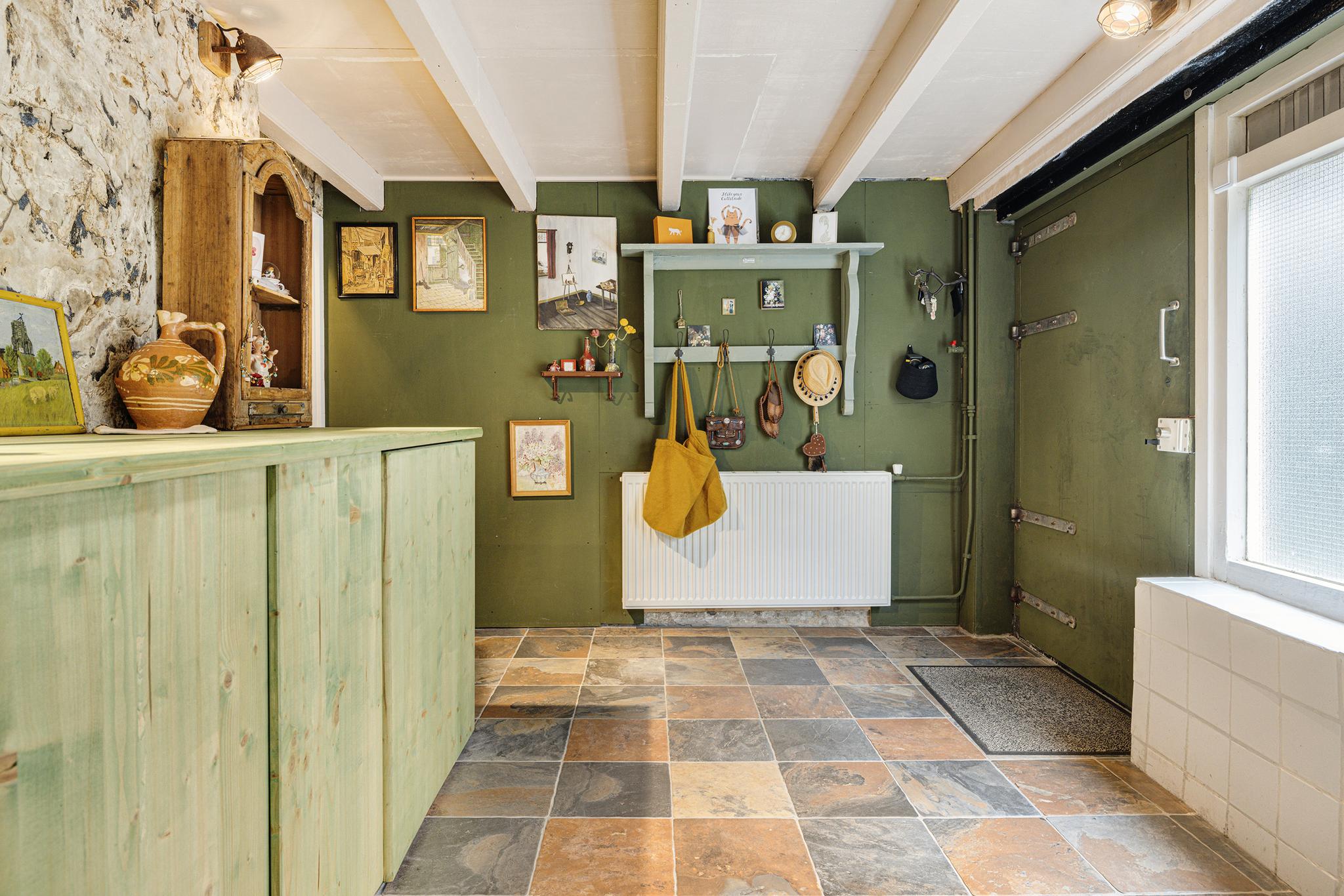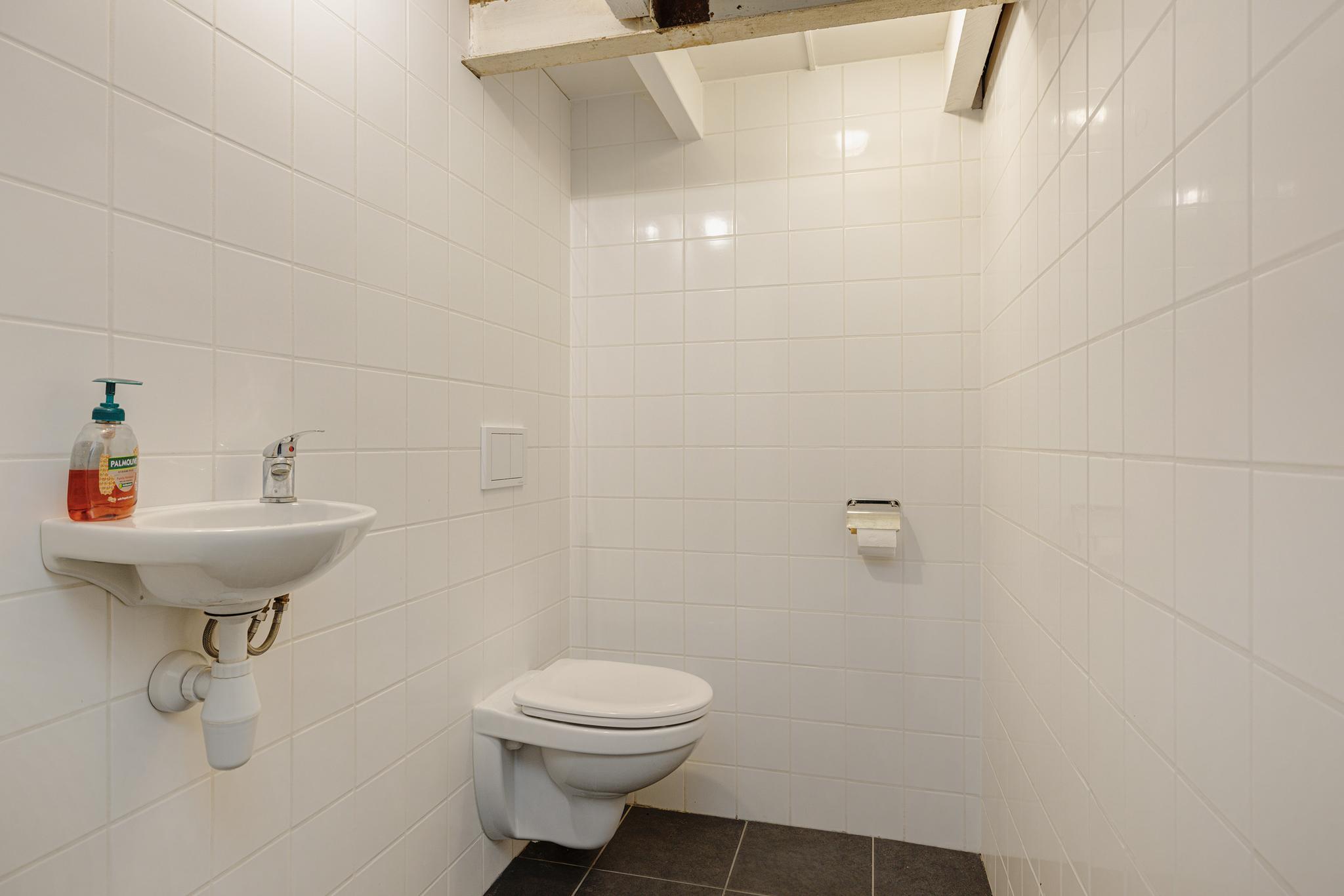 Tussenhal met meterkast en toilet, toegang tot de woonkamer.