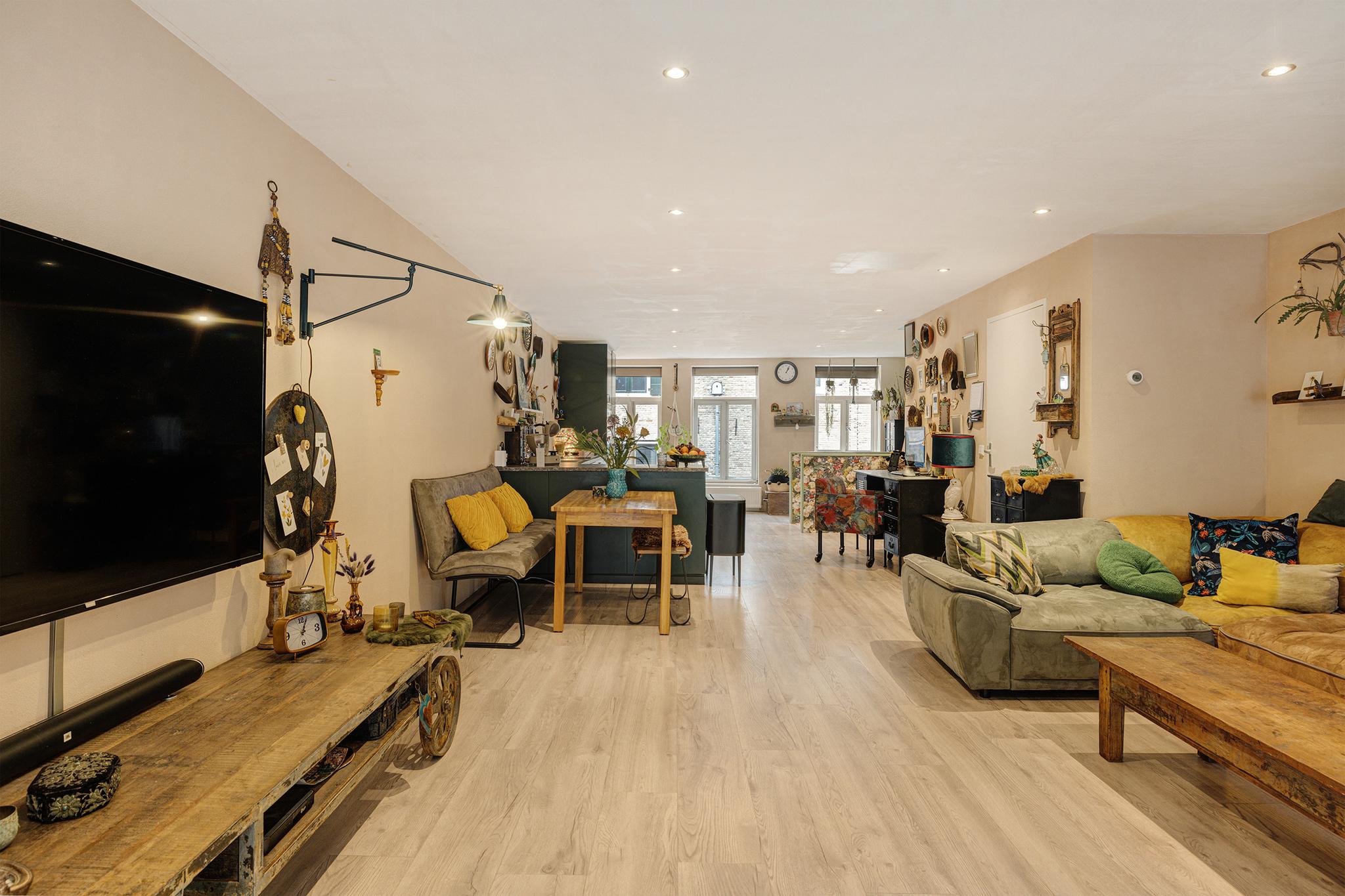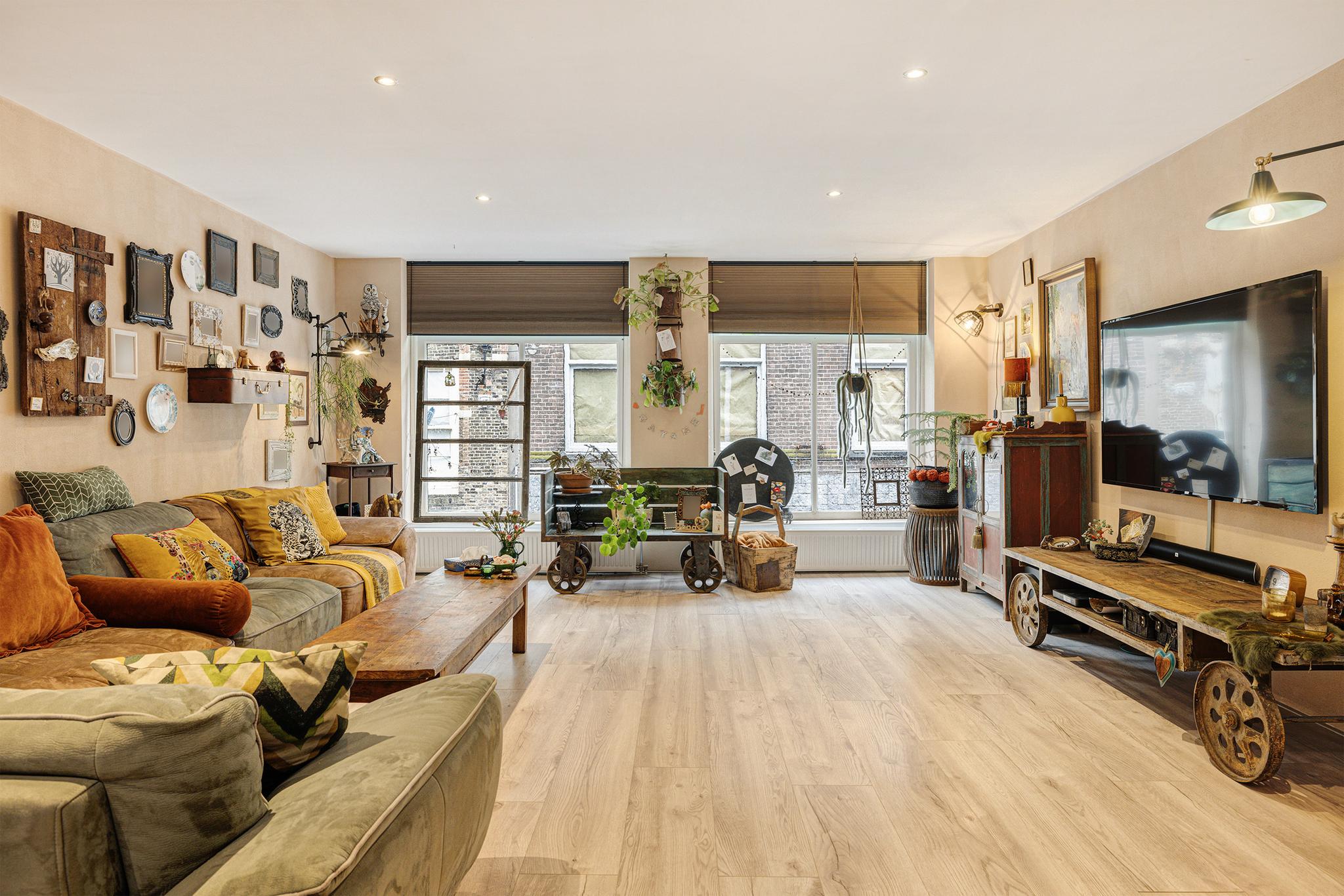 De hele verdieping is in gebruik als enorme woonkamer met open keuken, je kijkt dus ook hier uit op de Grote Spuistraat en aan de achterzijde op de Belgracht. De kamer is voorzien van een laminaatvloer en een hoek opgestelde keuken.