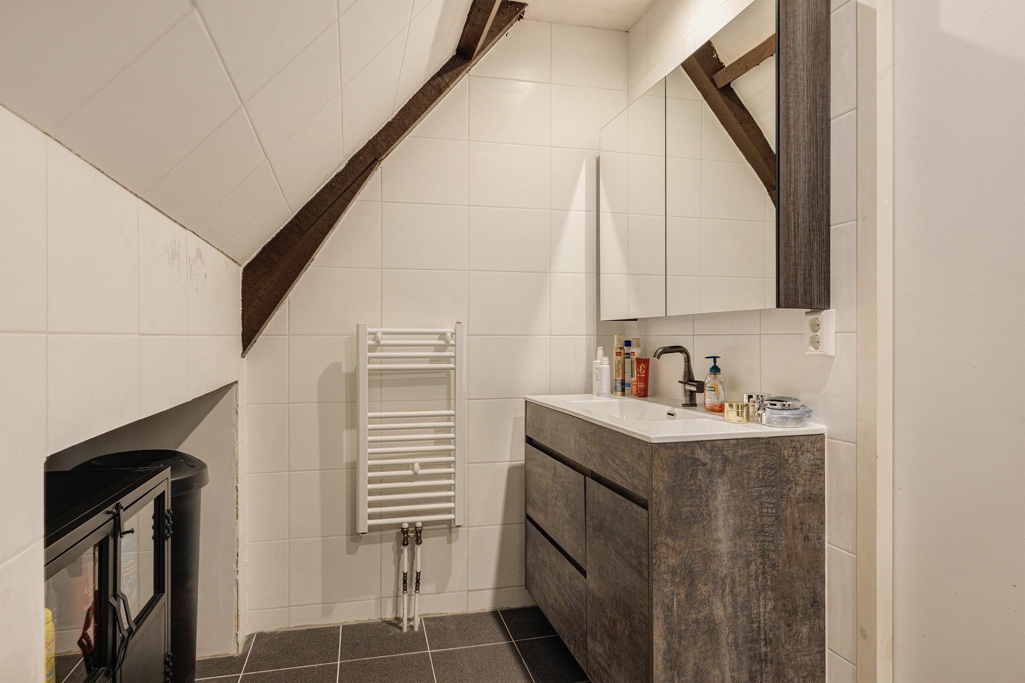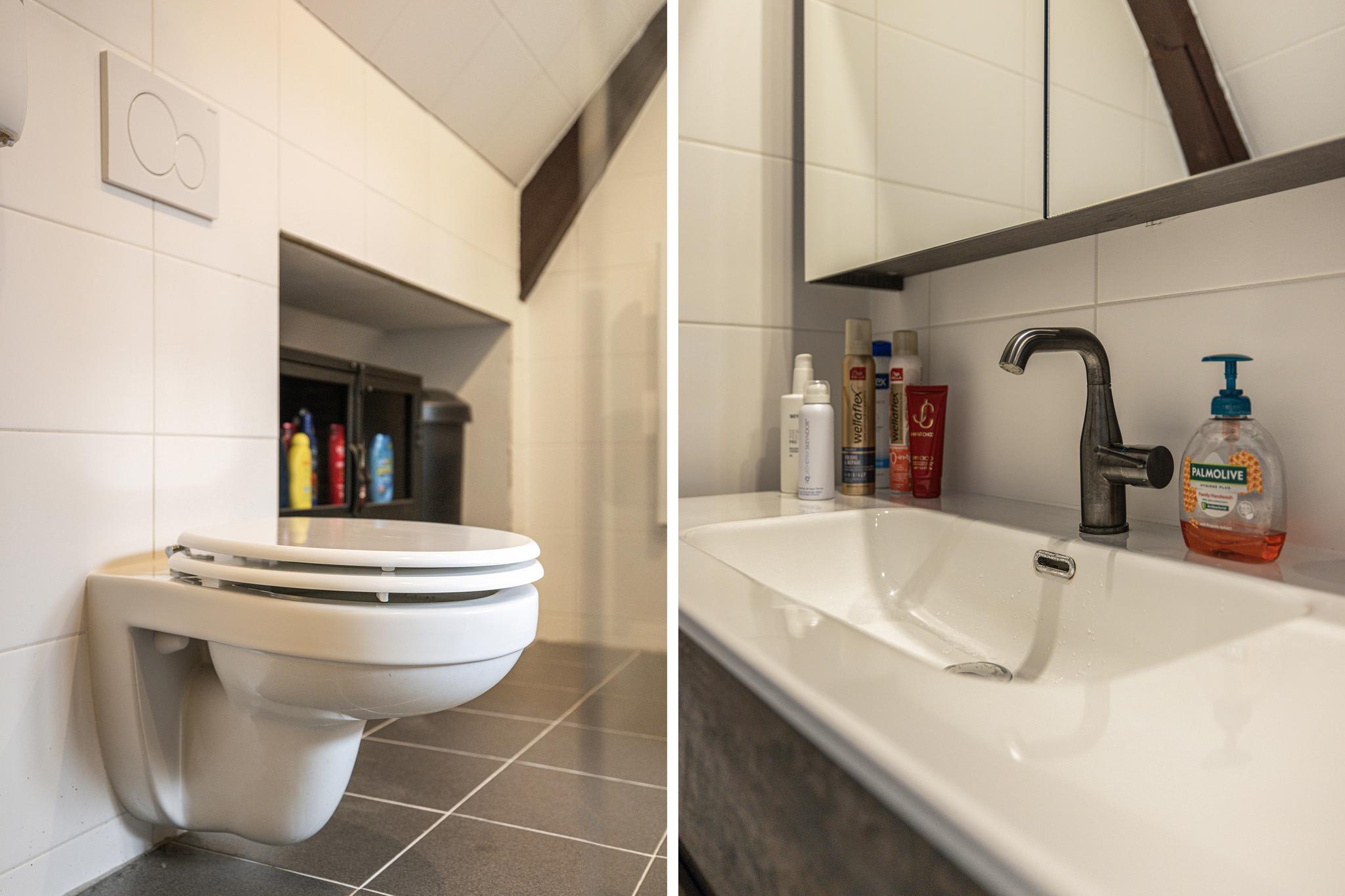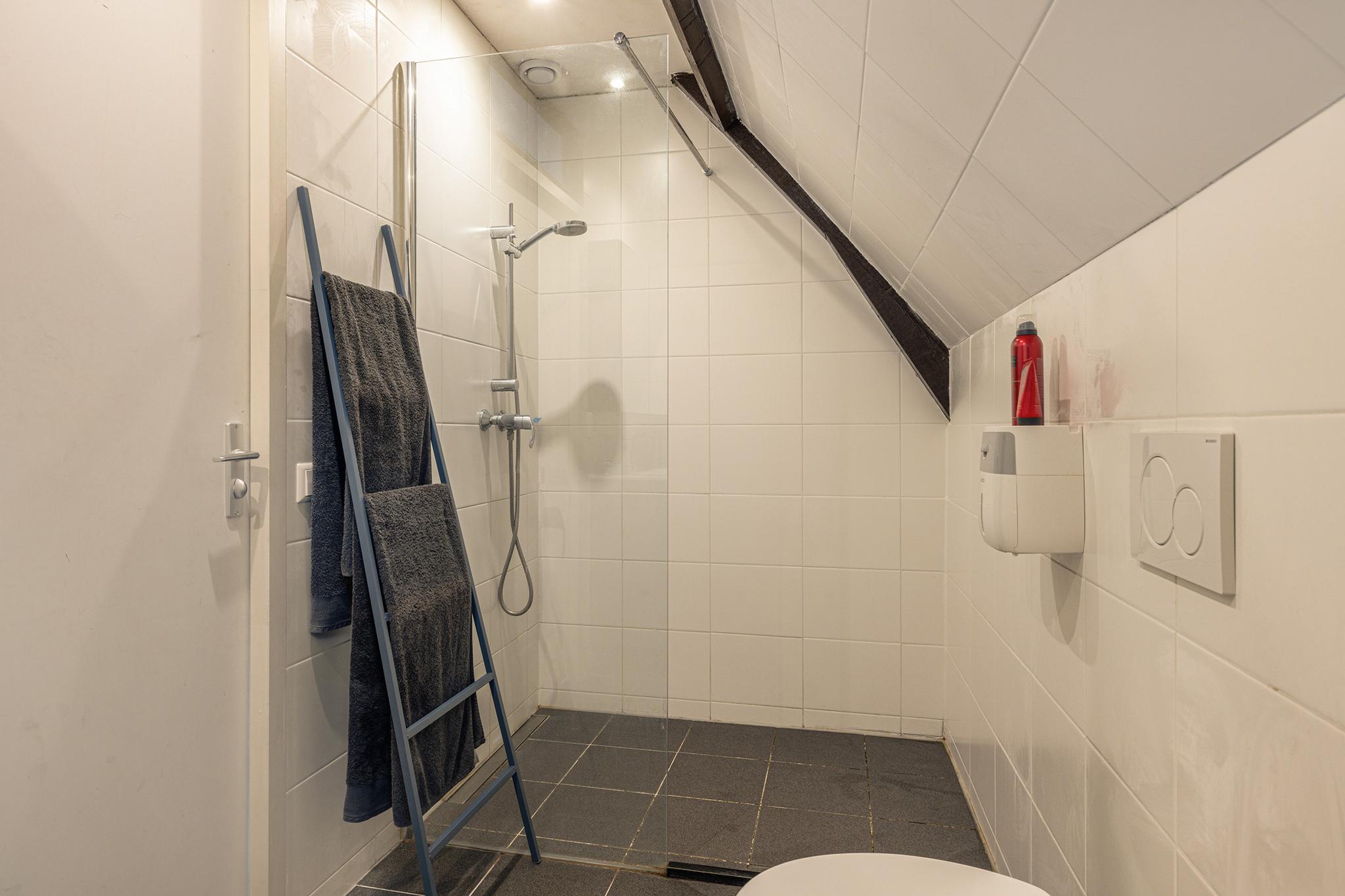 Inpandige badkamer met vrijhangend toilet, douchehoek, wastafel met meubel en ventilatie, geheel betegelde wanden.