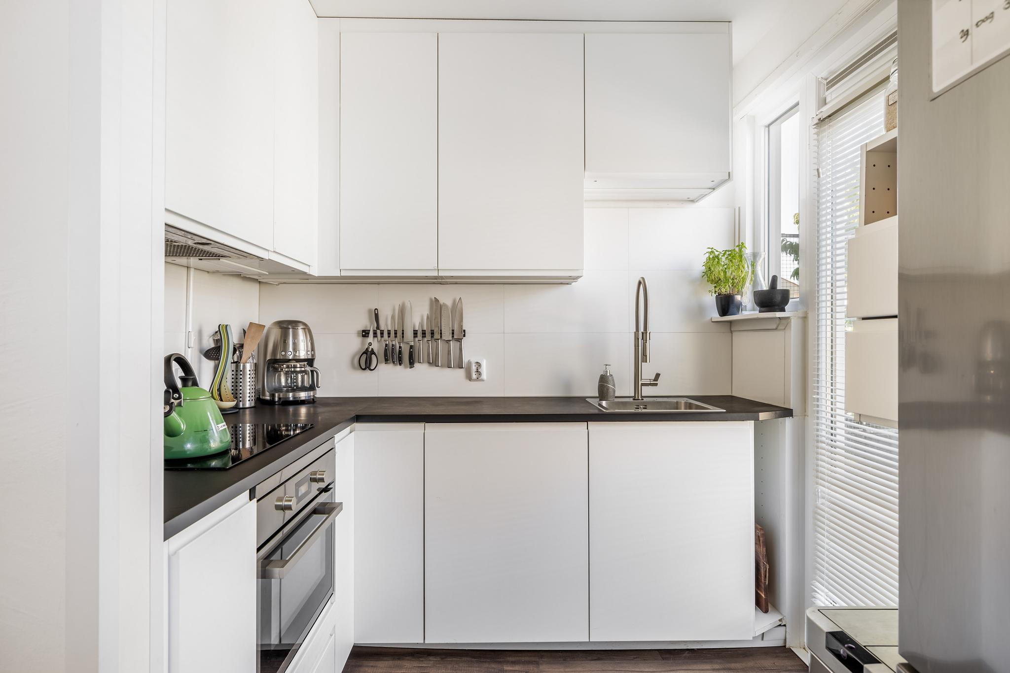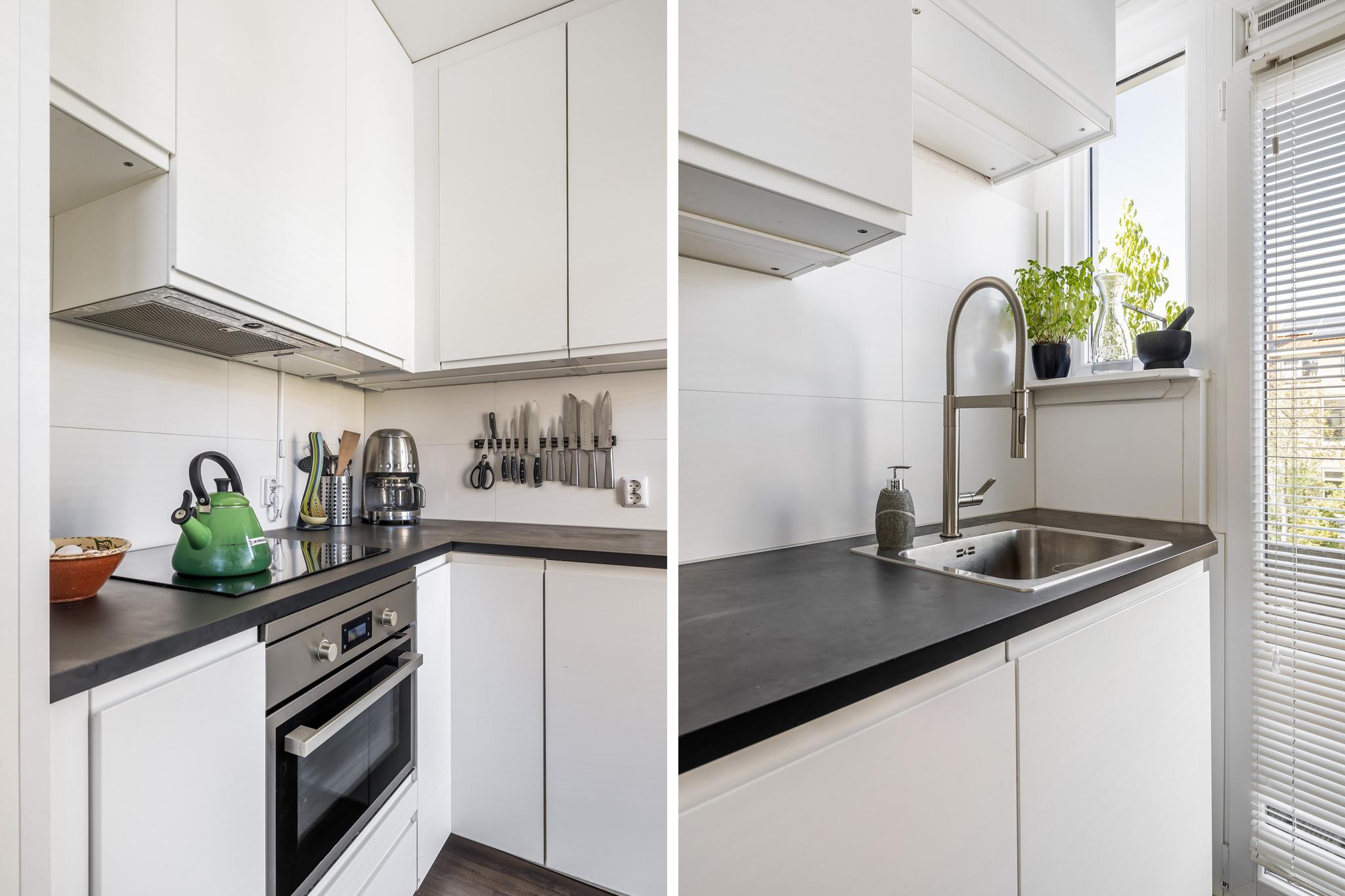 Keuken in hoekopstelling (2021), deze beschikt over een 4 pit keramische kookplaat, combi-oven, vaatwasser, losse koel/vriescombinatie en een deur naar het balkon aan voorzijde.