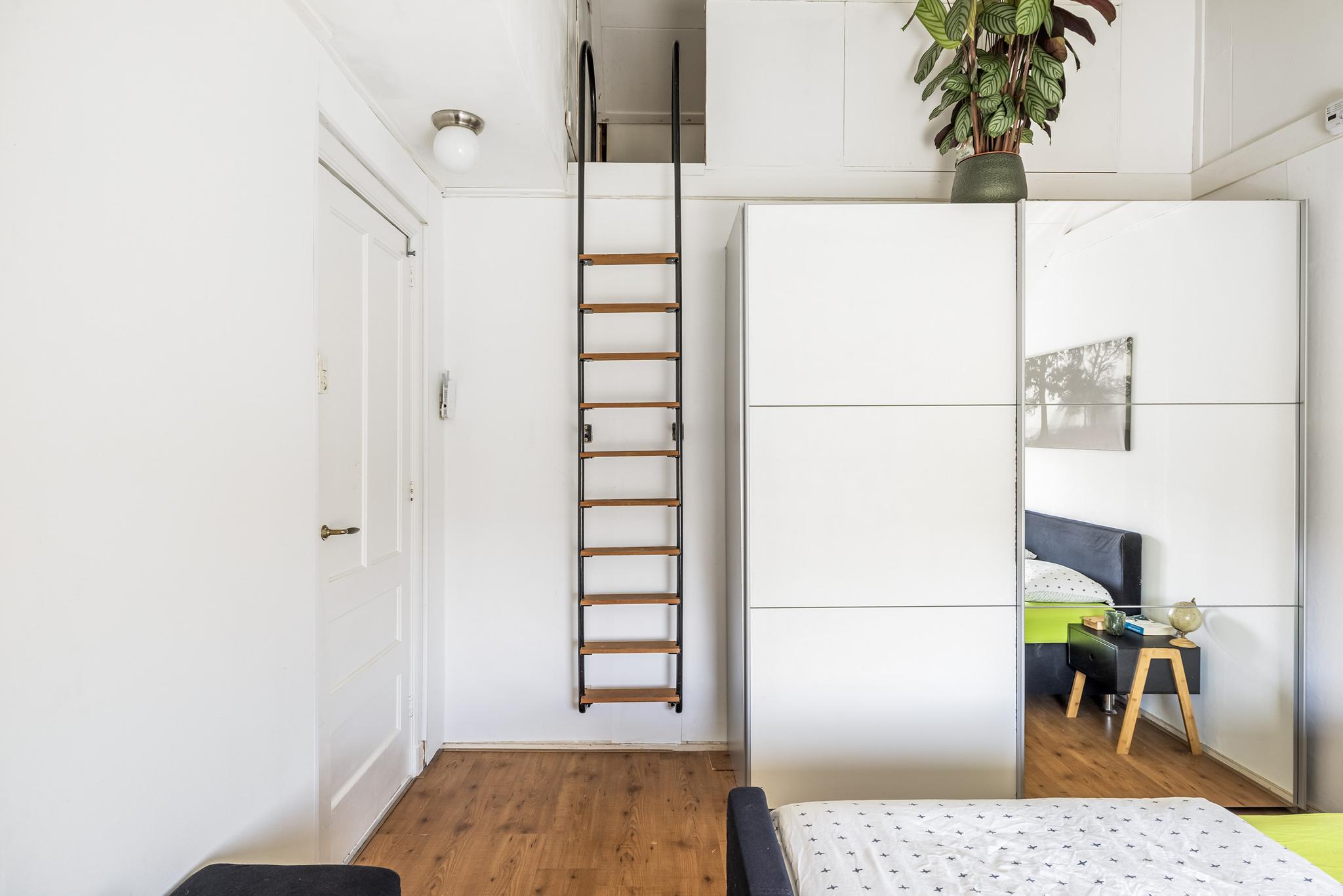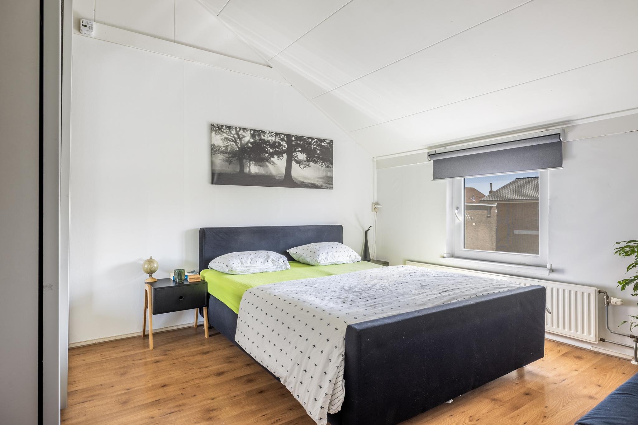 Leuke slaapkamer aan achterzijde, voorzien van een laminaatvloer. Vanuit deze kamer heb je toegang tot een grote ruimte in de nok van de woning, ideaal te gebruiken als berging maar ook een leuke speelplek voor de kinderen.