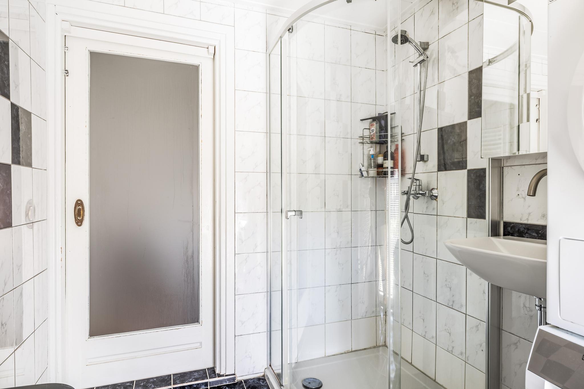 Badkamer (volledig betegeld) met douchecabine, wastafel met spiegelkast, wasaansluiting, designradiator en toegang tot het dakterras.