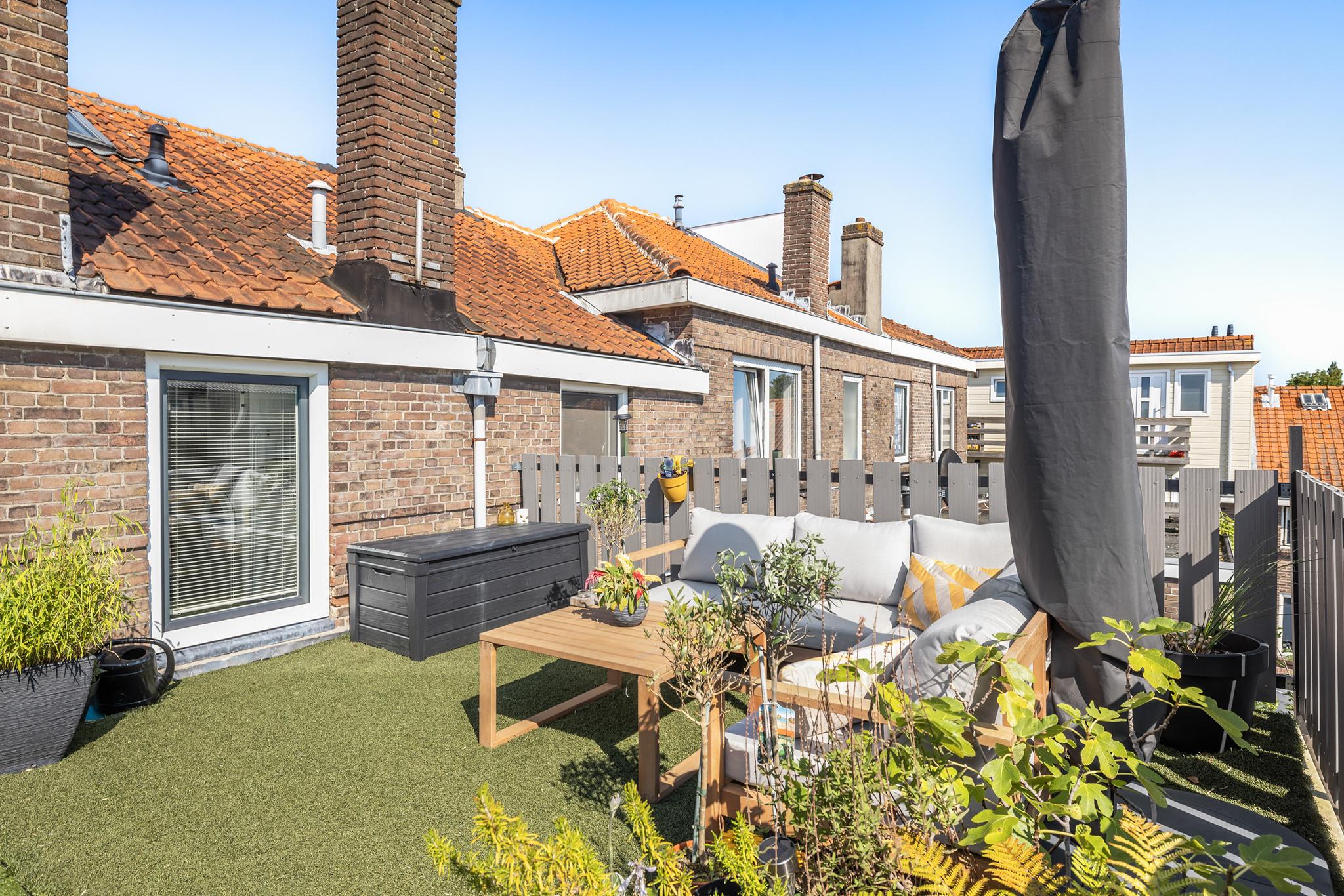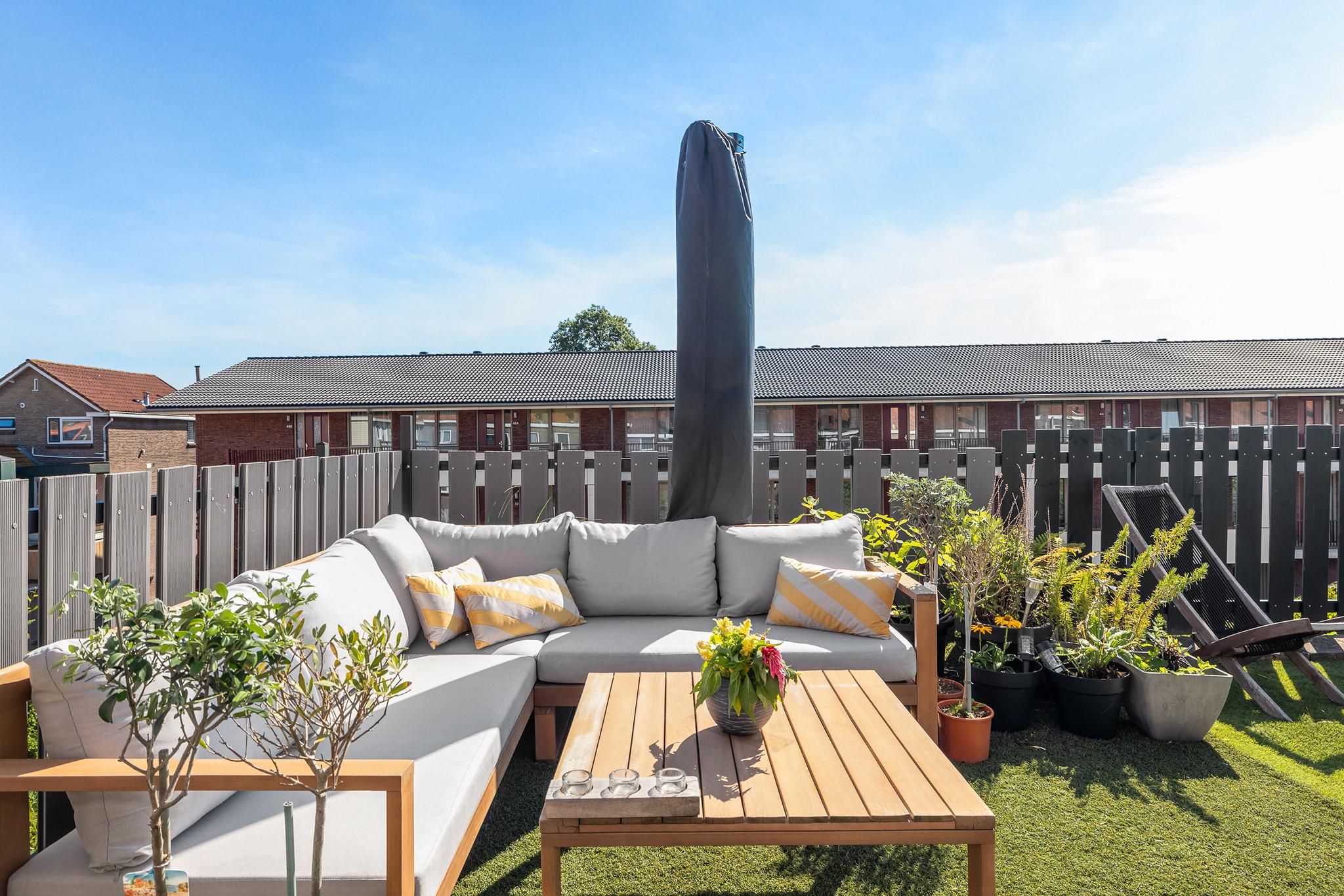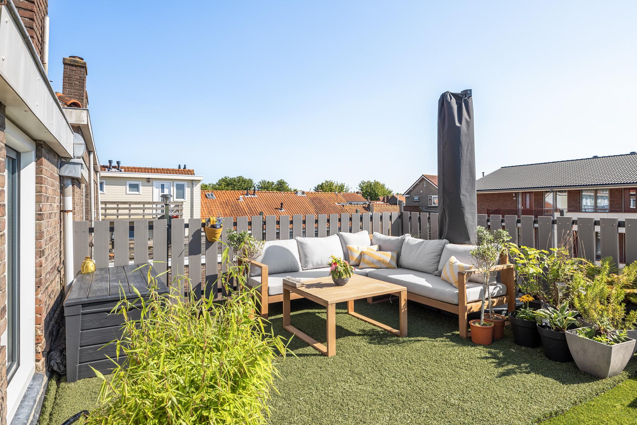 Het ruime dakterras aan achterzijde is gelegen op het zuidwesten, een ideale buitenruimte waar je tot in de late uurtjes kan genieten van het zonnetje. Het terras is voorzien van kunstgras en een kunststof reling.