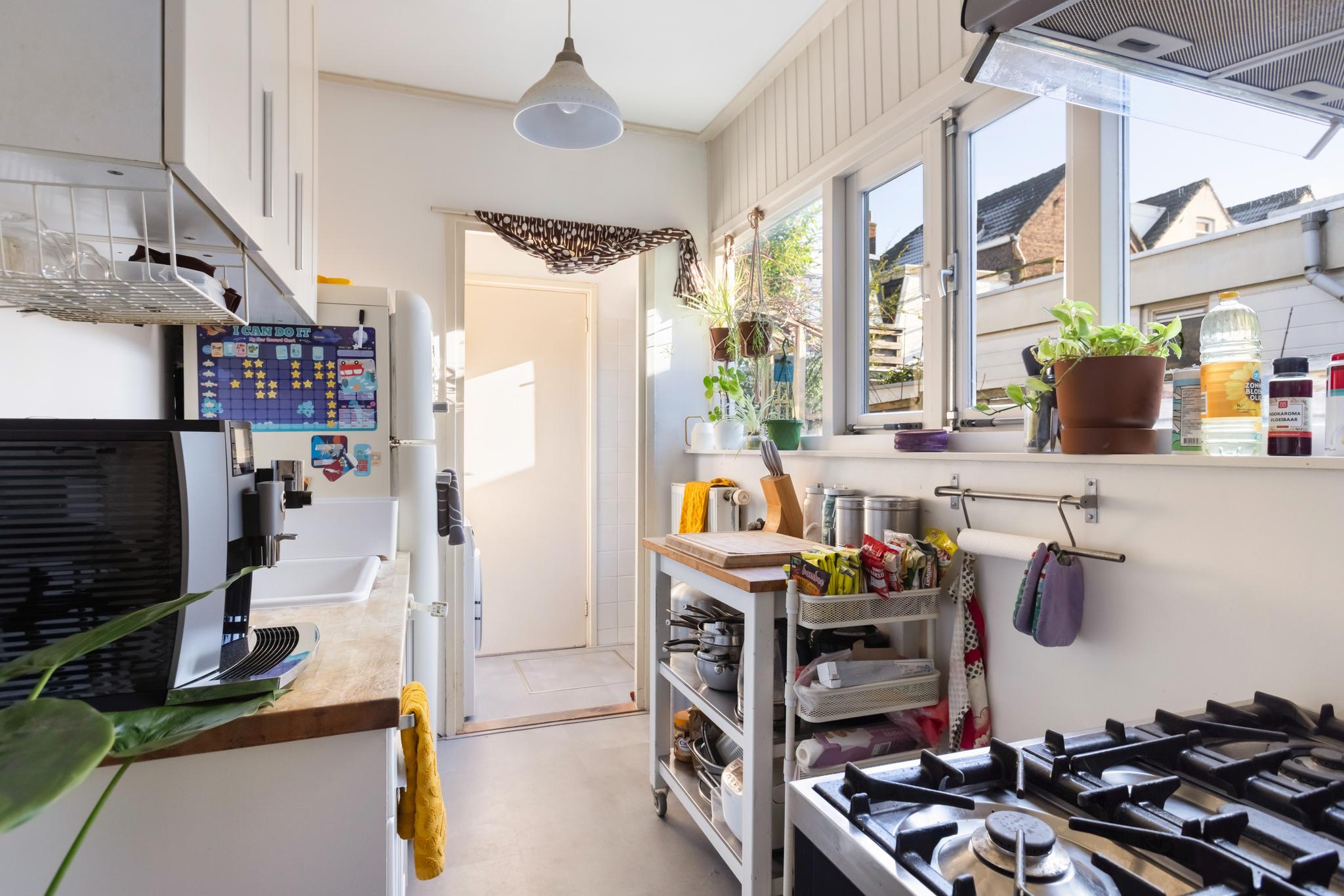 In de aanbouw bevindt zich de keuken in wandopstelling voorzien van een groot gasfornuis, afzuigkap en een spoelbak.
