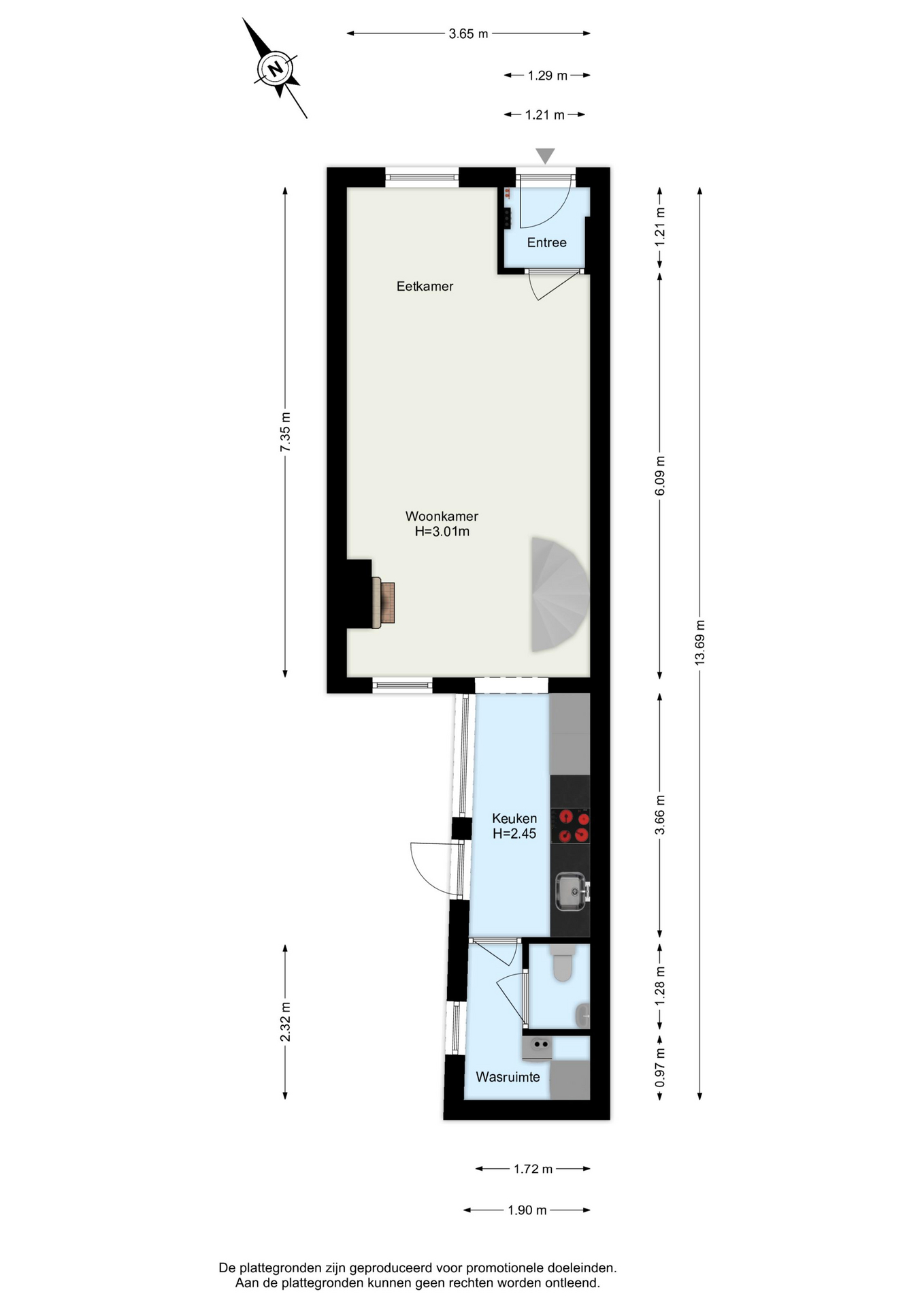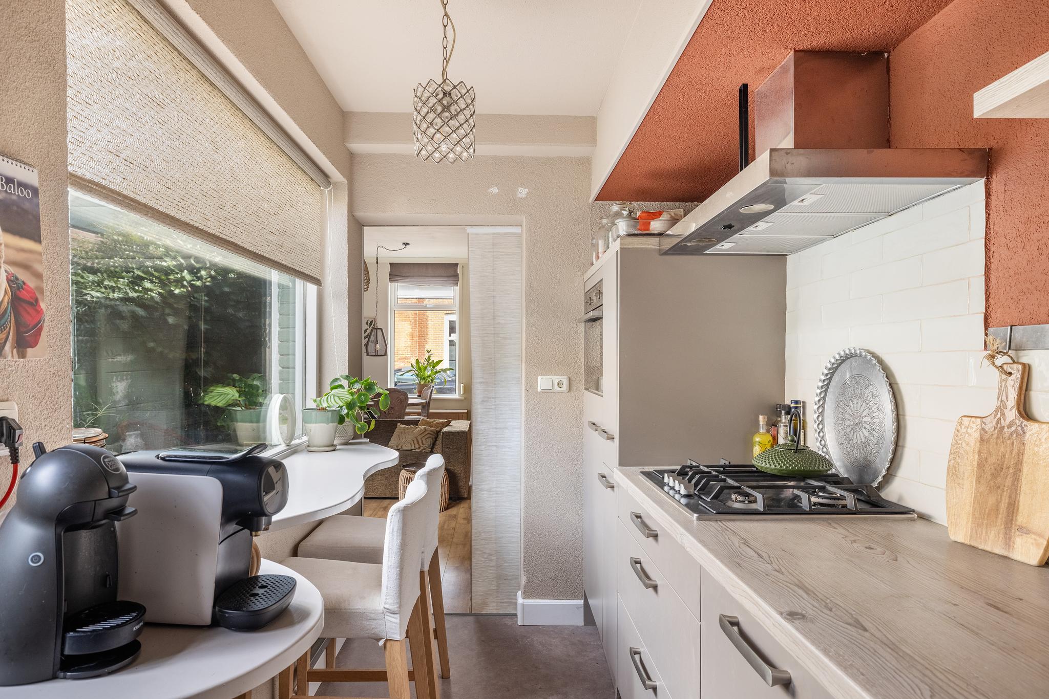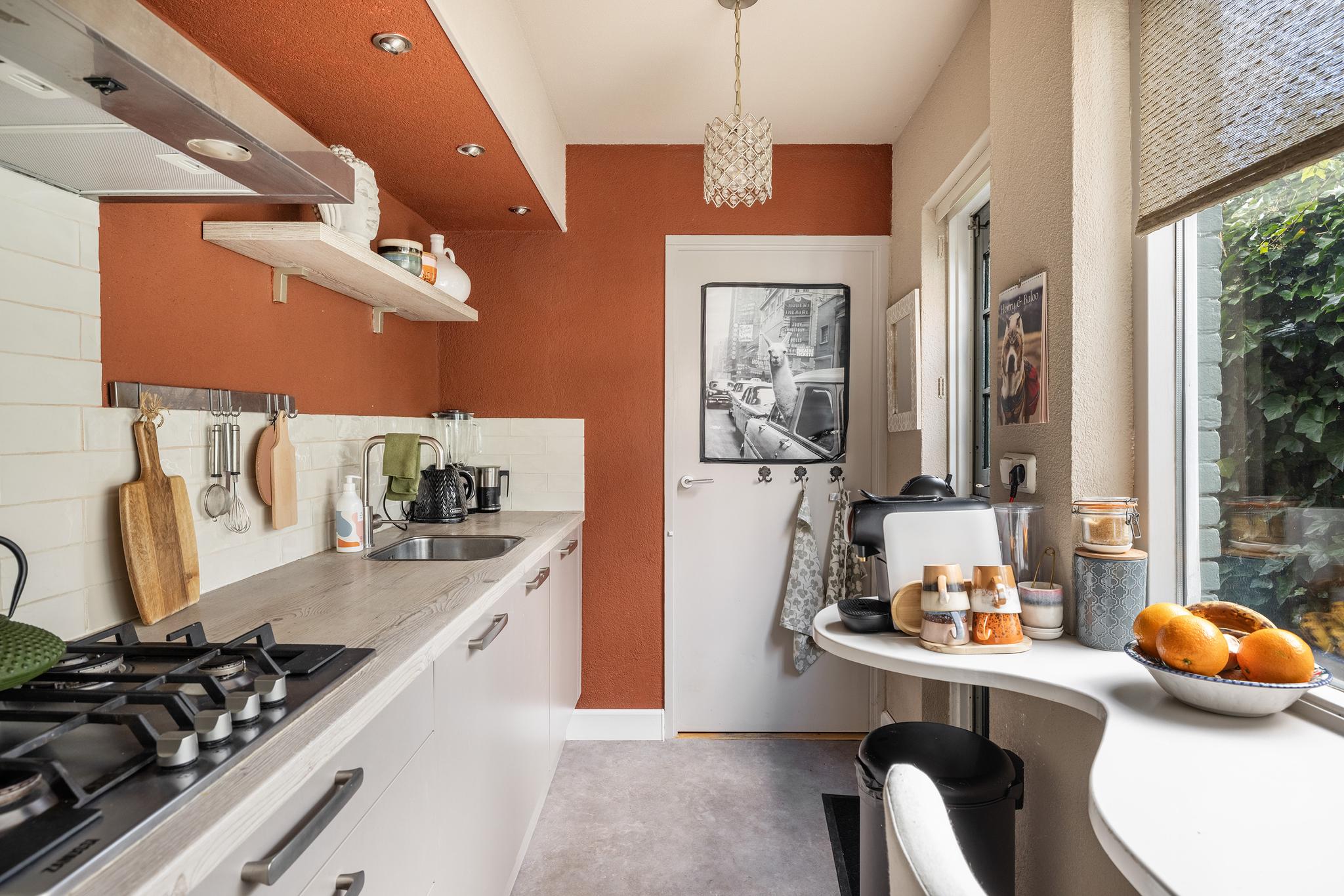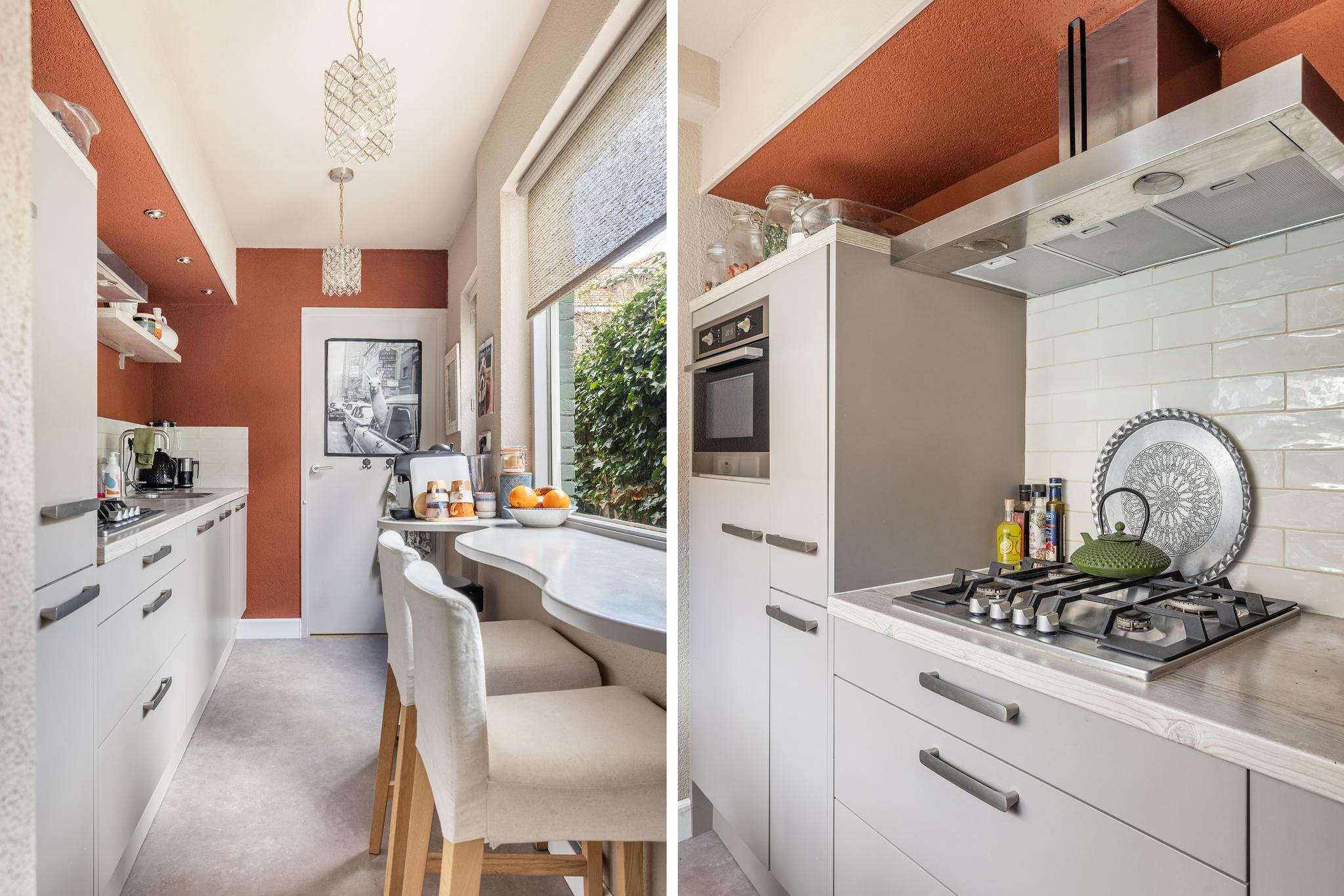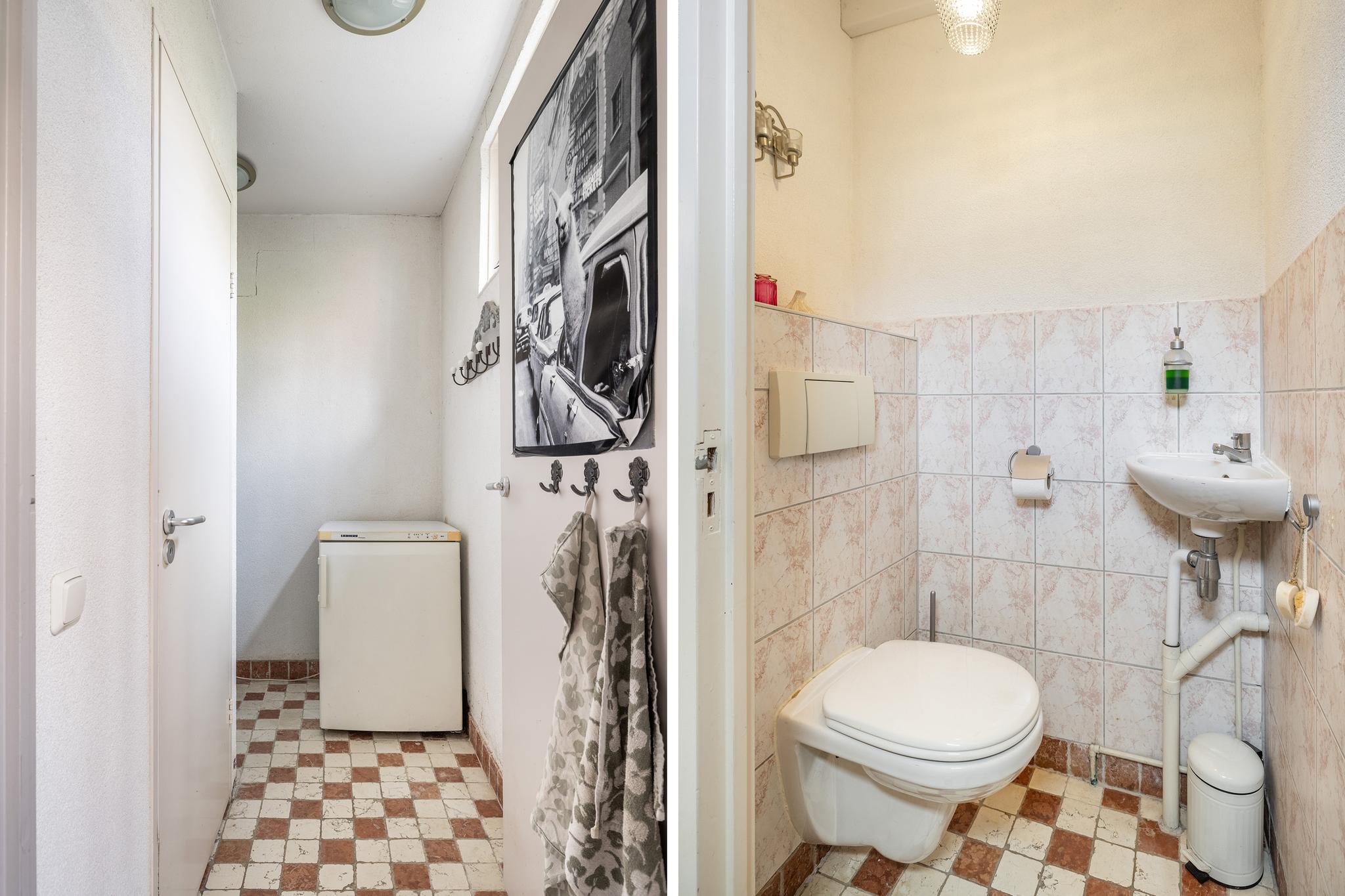De bijkeuken ligt achter de keuken en biedt plek voor de was apparatuur en de huur geiser van Eneco.