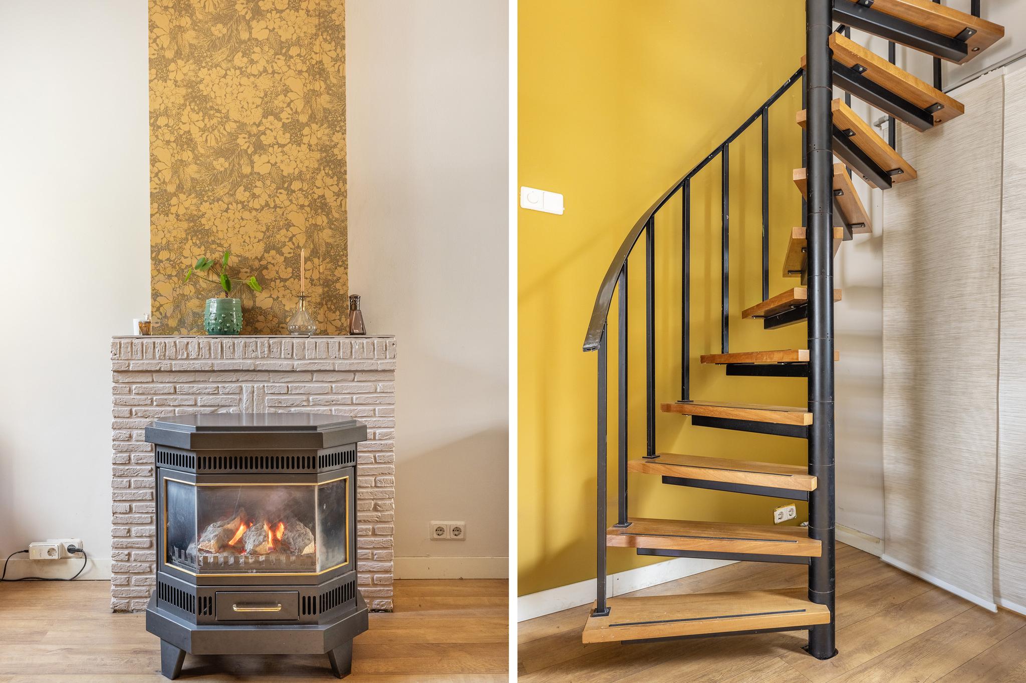 Heerlijk ruime woonkamer met spiltrap naar de verdieping en toegang tot de keuken in de achter aanbouw.