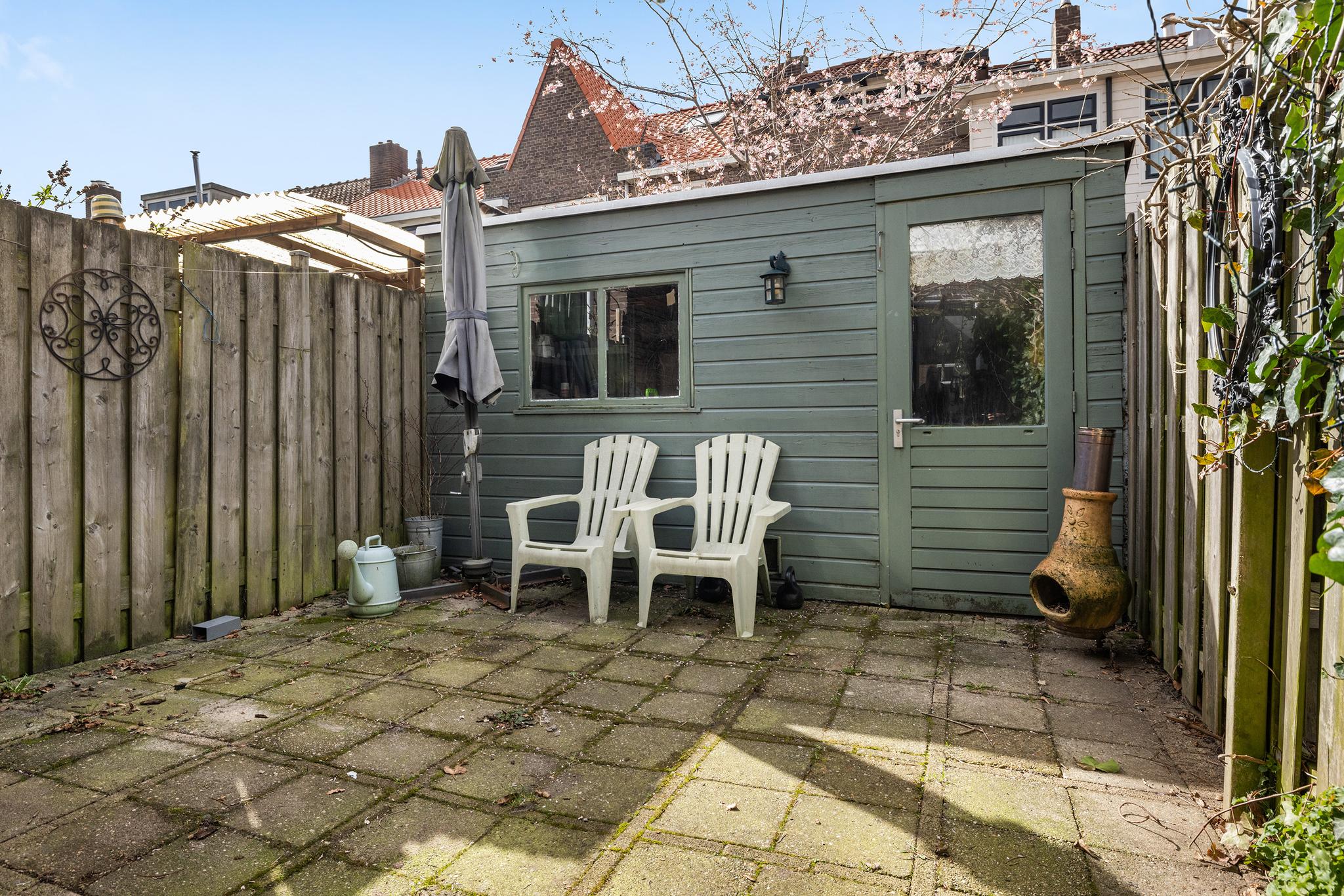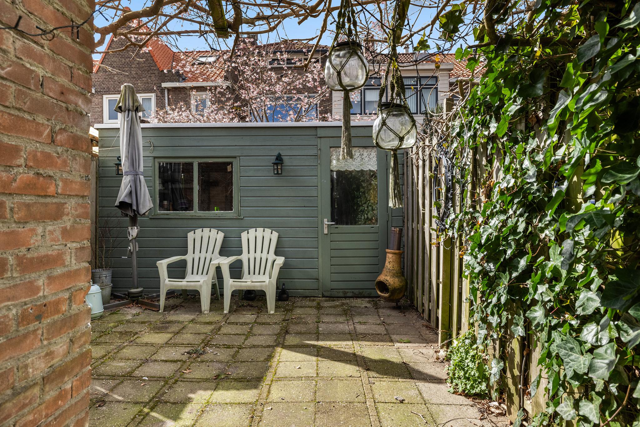 Heerlijke achtertuin met veel zon EN zoals gezegd een eigen achterom. In het voorjaar staat de blauwe regen prachtig in bloei. Er is een eenvoudige maar grote berging aanwezig.