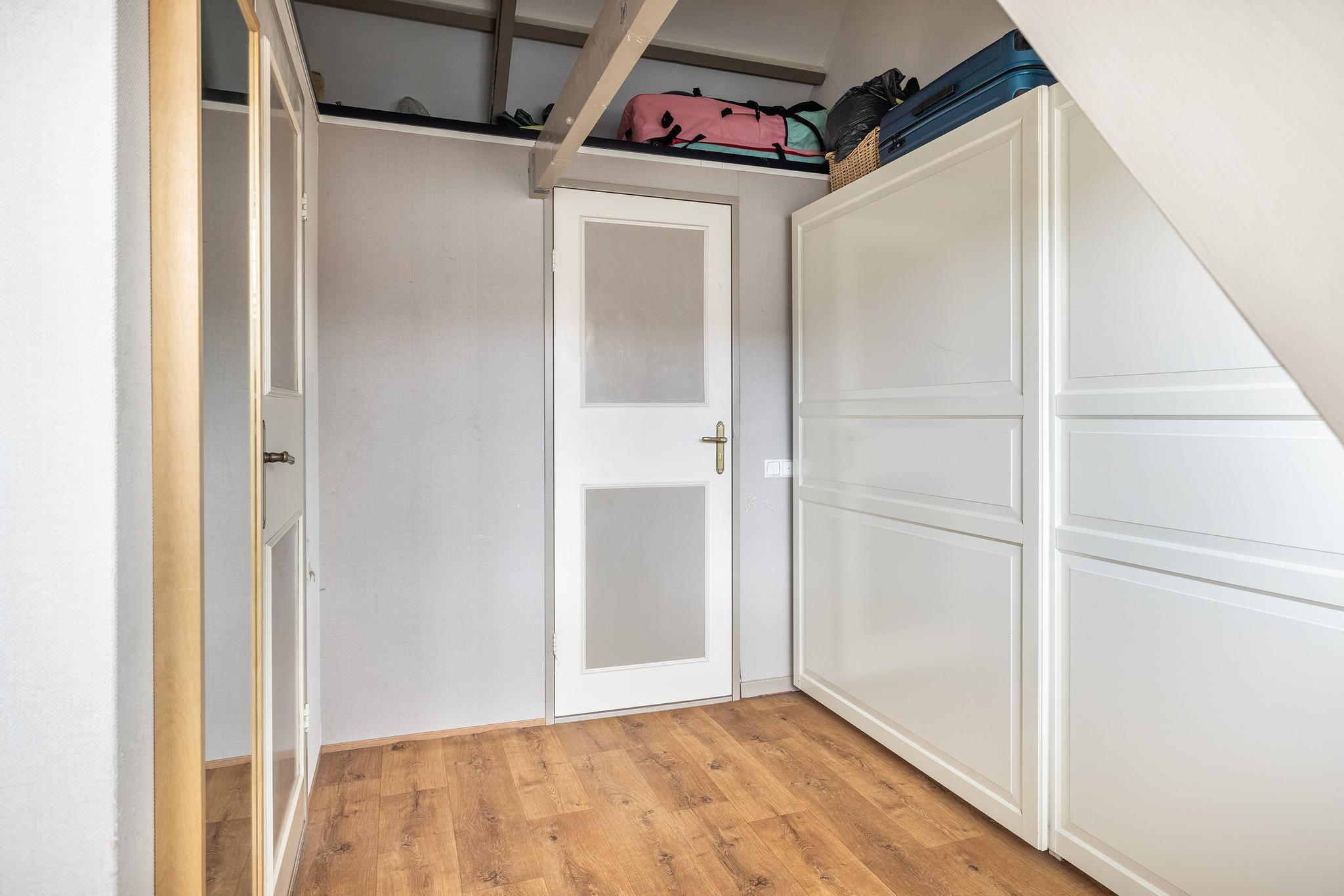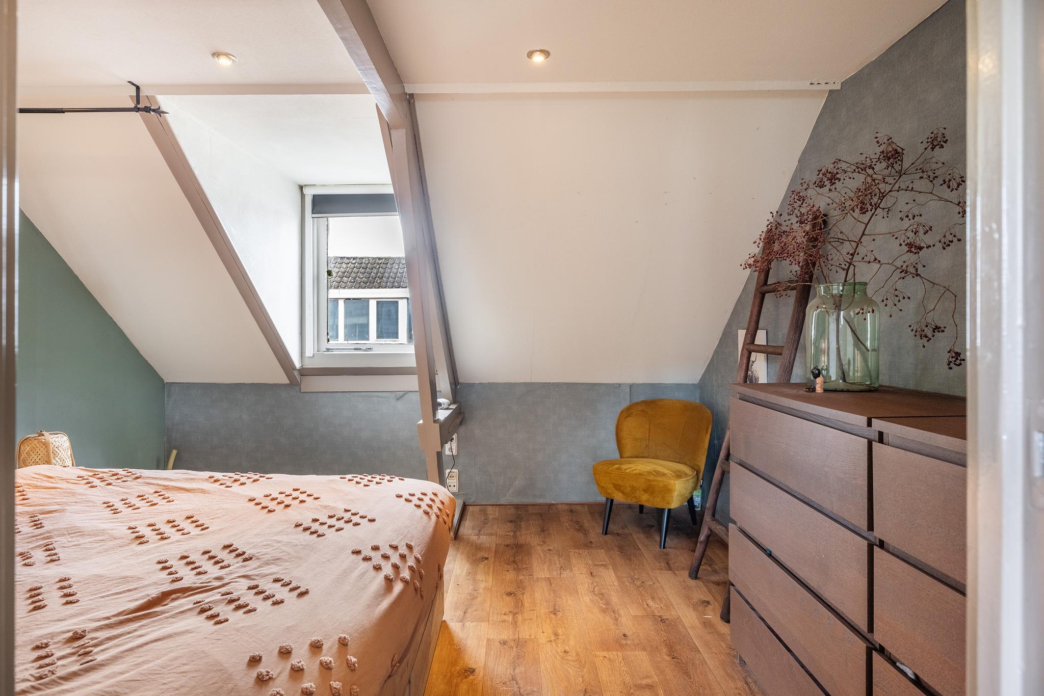 Slaapkamer aan de voorzijde met vinyl vloer en koekoek (kleine dakkapel).