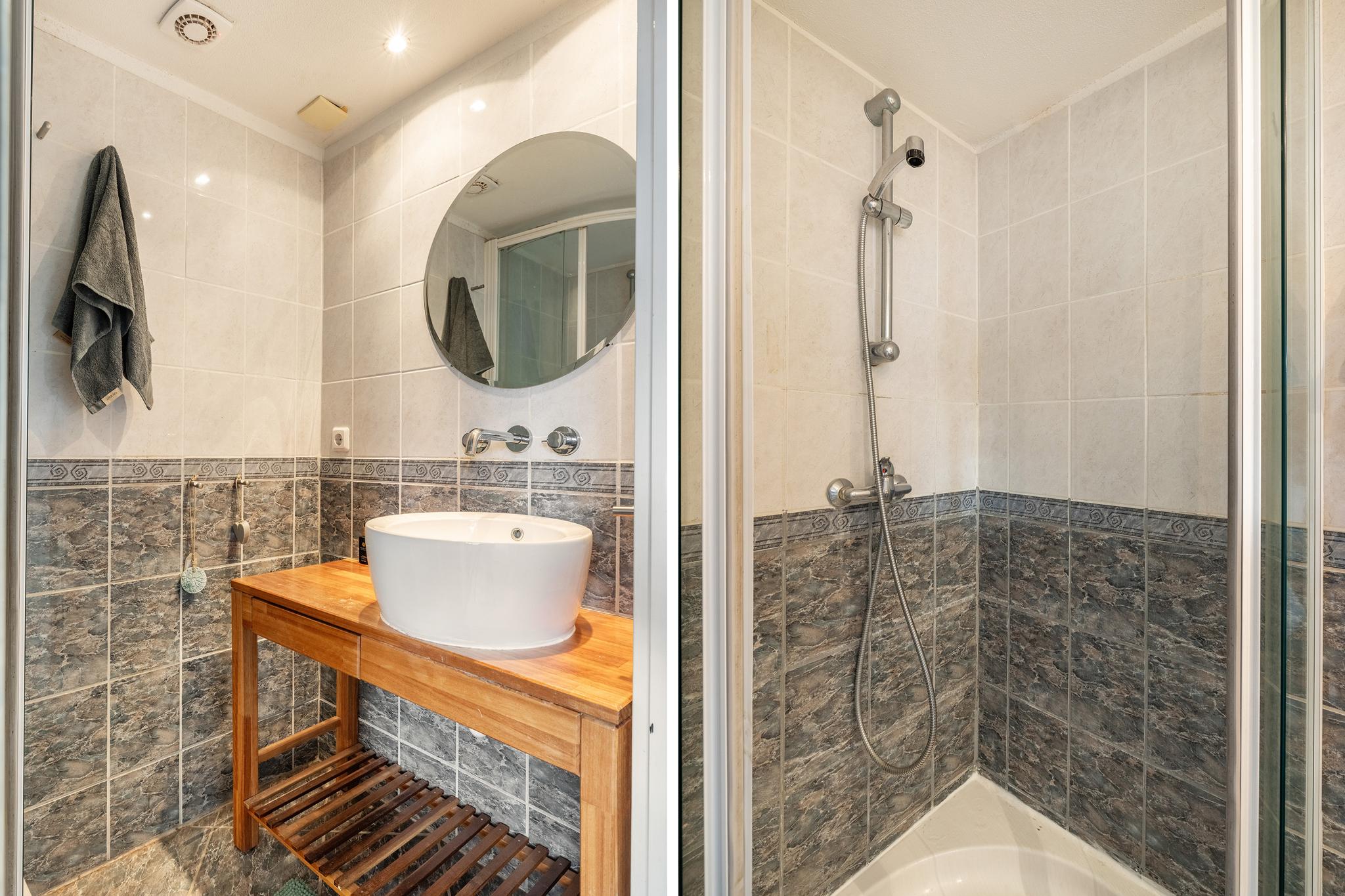 Inpandige badkamer met douchehoek en waskom, geheel betegelde wanden, elektrische ventilatie en spots in het plafond.