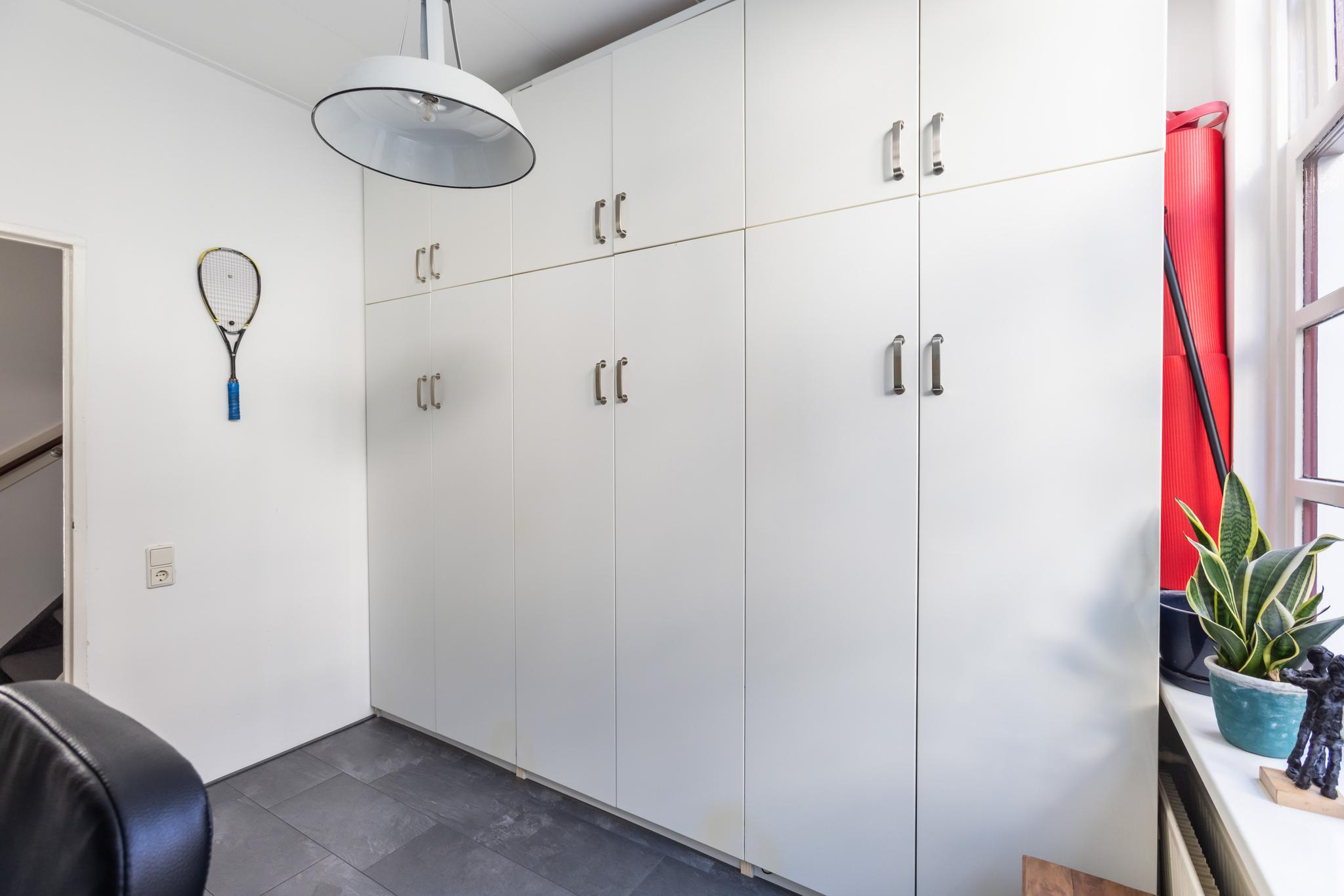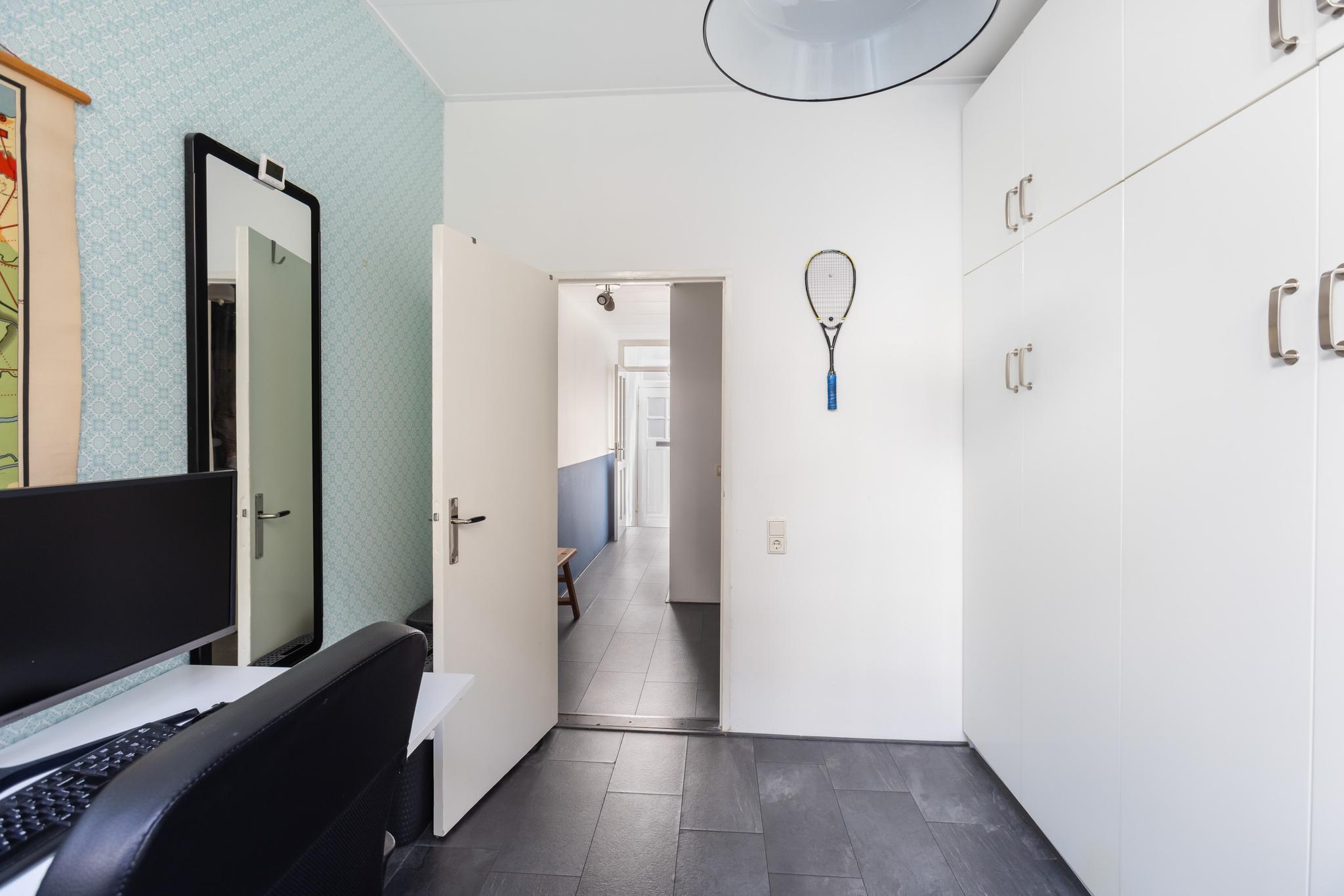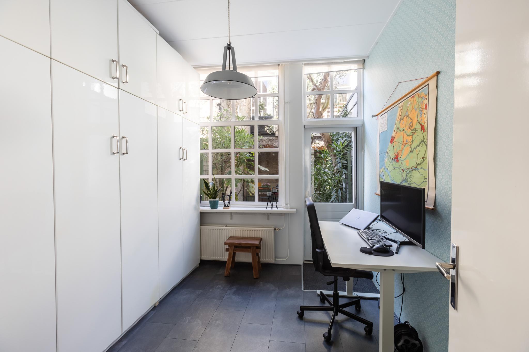 De ruime slaapkamer is gelegen aan achterzijde, deze kamer wordt momenteel gebruikt als thuiswerkplek, heerlijk aangrenzend bij de achtertuin! Deze kamer beschikt over een grote kastenwand, behang wandafwerking en een laminaatvloer.