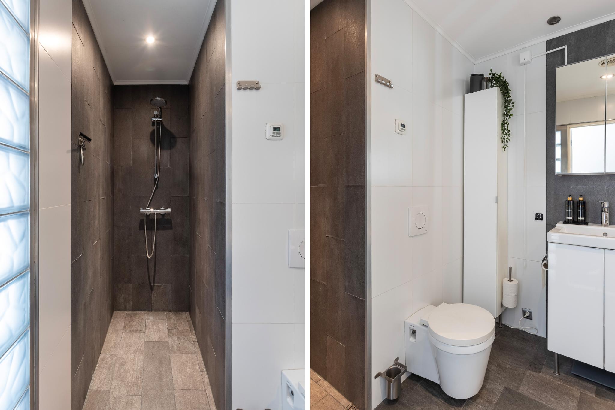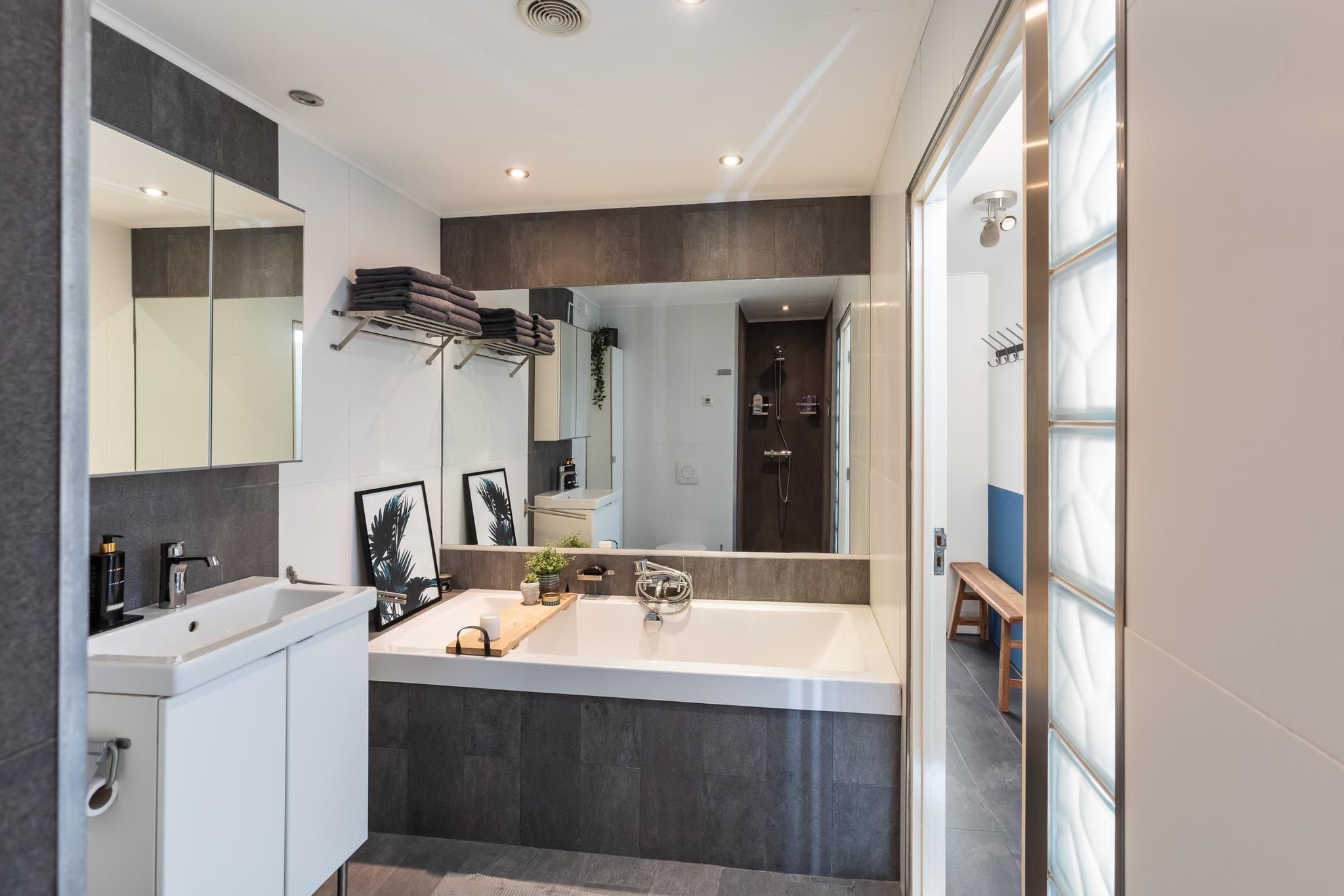 De royale badkamer is volledig betegeld en voorzien van een ruim ligbad, inloopdouche, wastafelmeubel met spiegelkast en kolomkast, toilet en elektrische vloerverwarming.