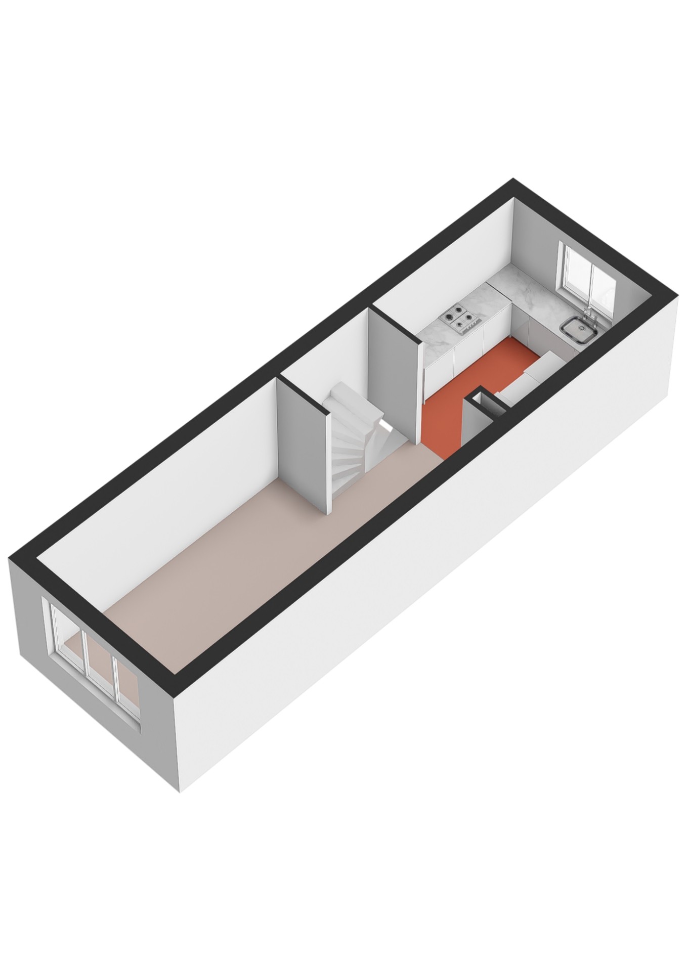 Deze verdieping is in geheel in gebruik als gezellige woonverdieping, met aan de voorzijde de zitkamer en aan achterzijde de royale keuken.