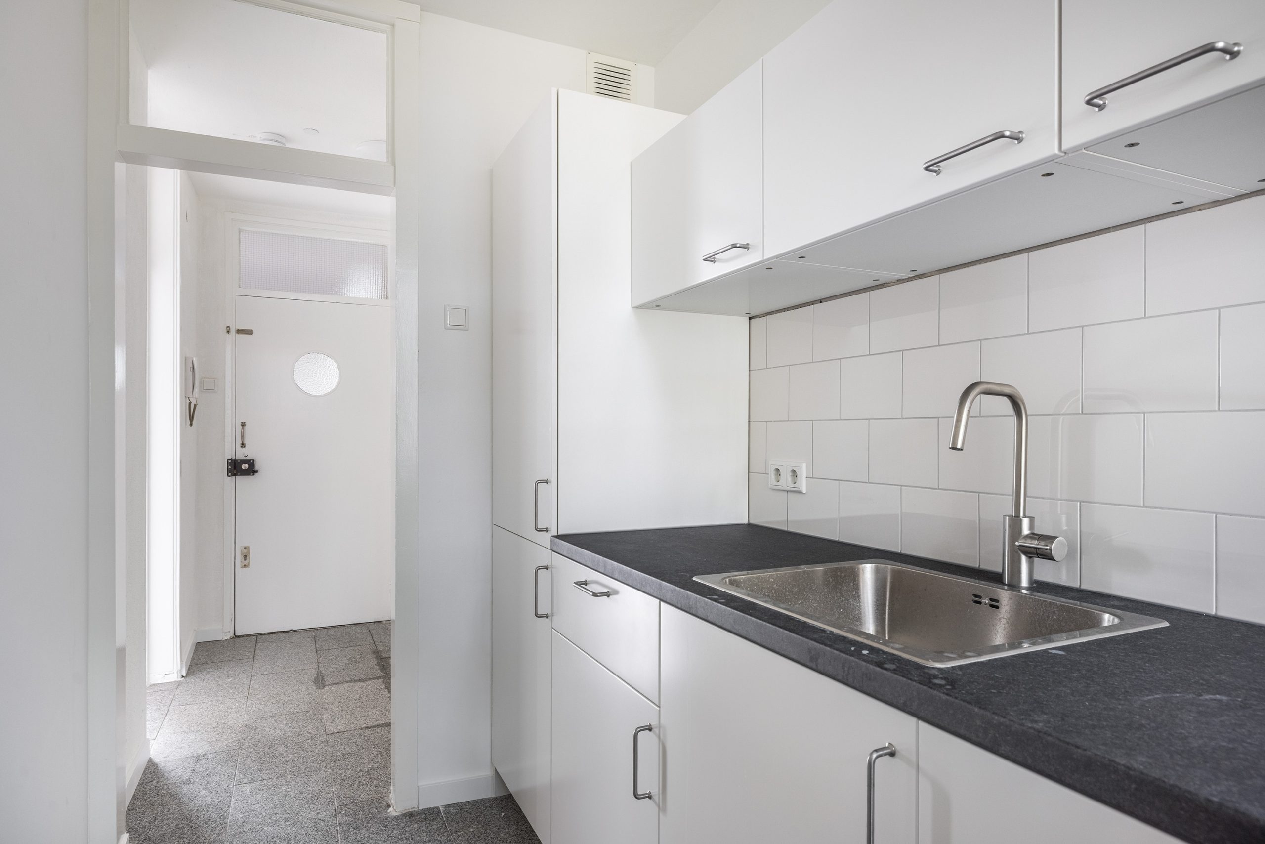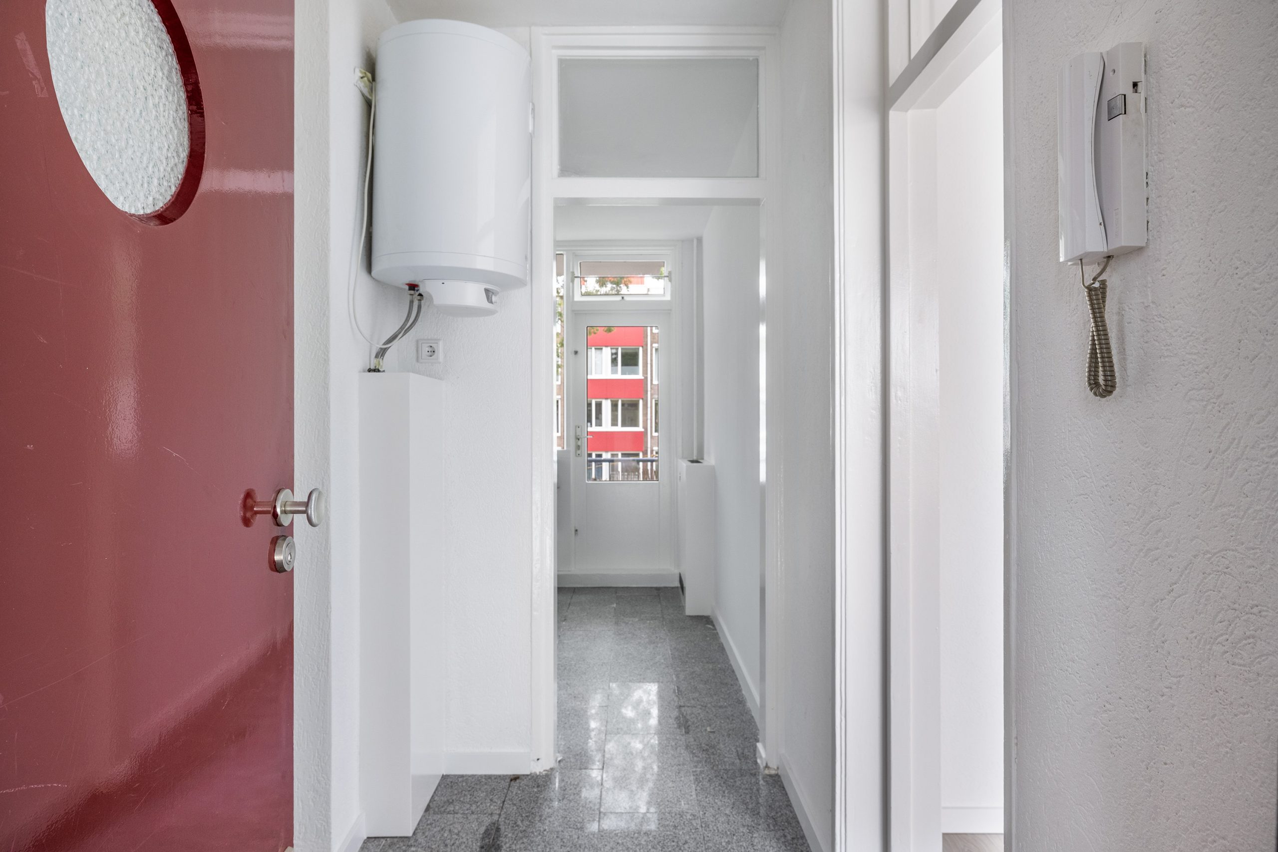 Hal met ruimte voor de garderobe, opstelling van de eigen boiler en toegang tot de woonkamer en de aparte keuken.