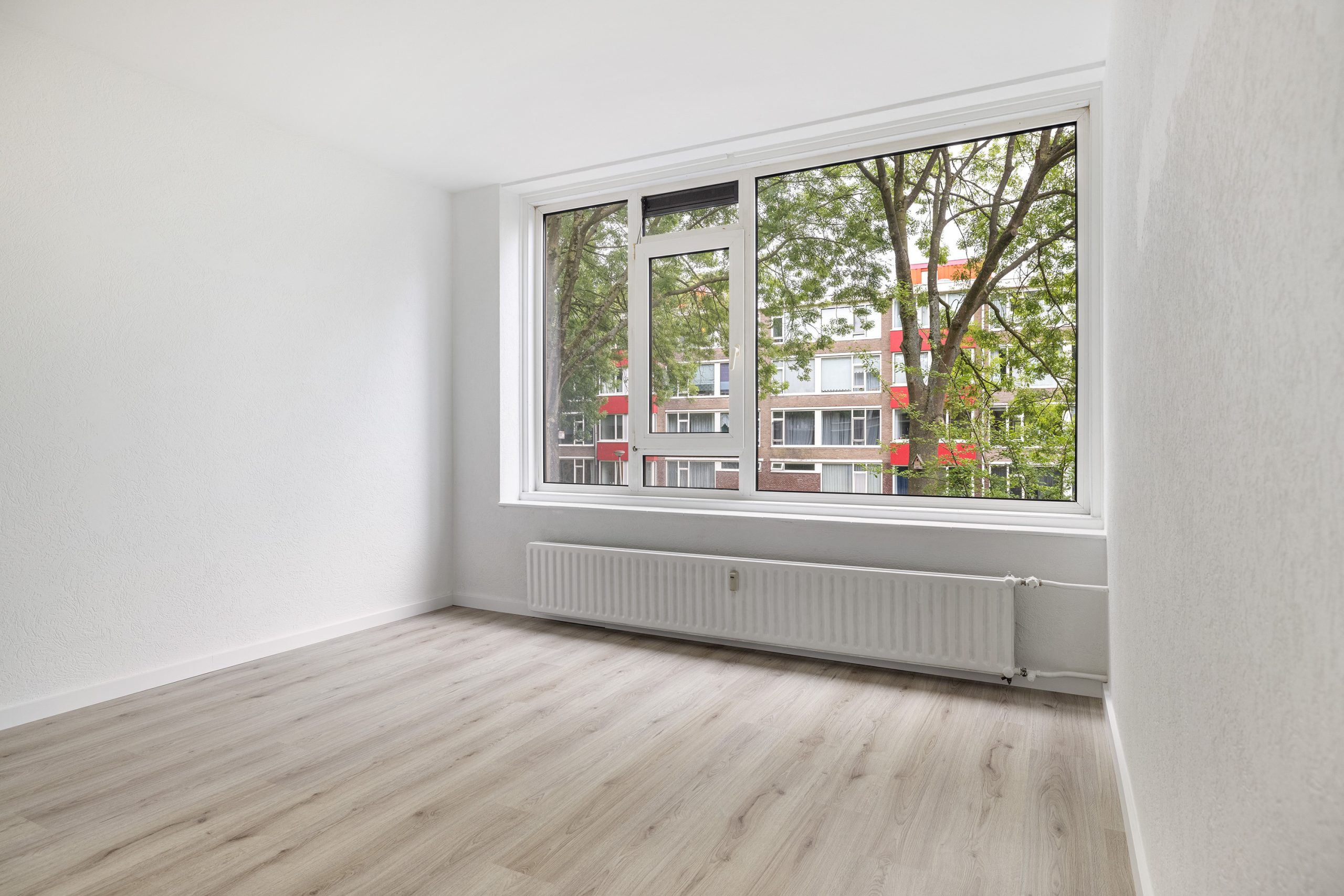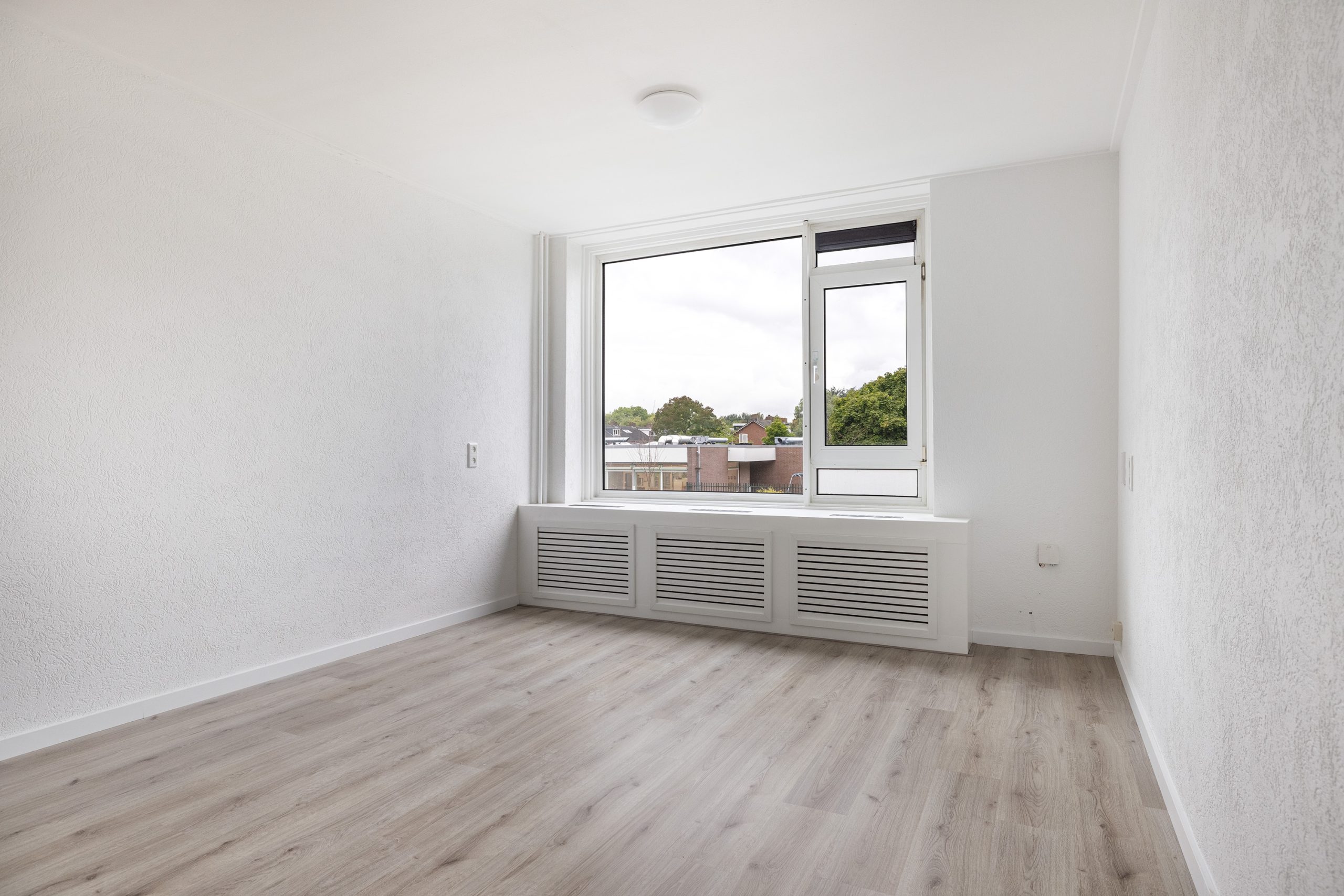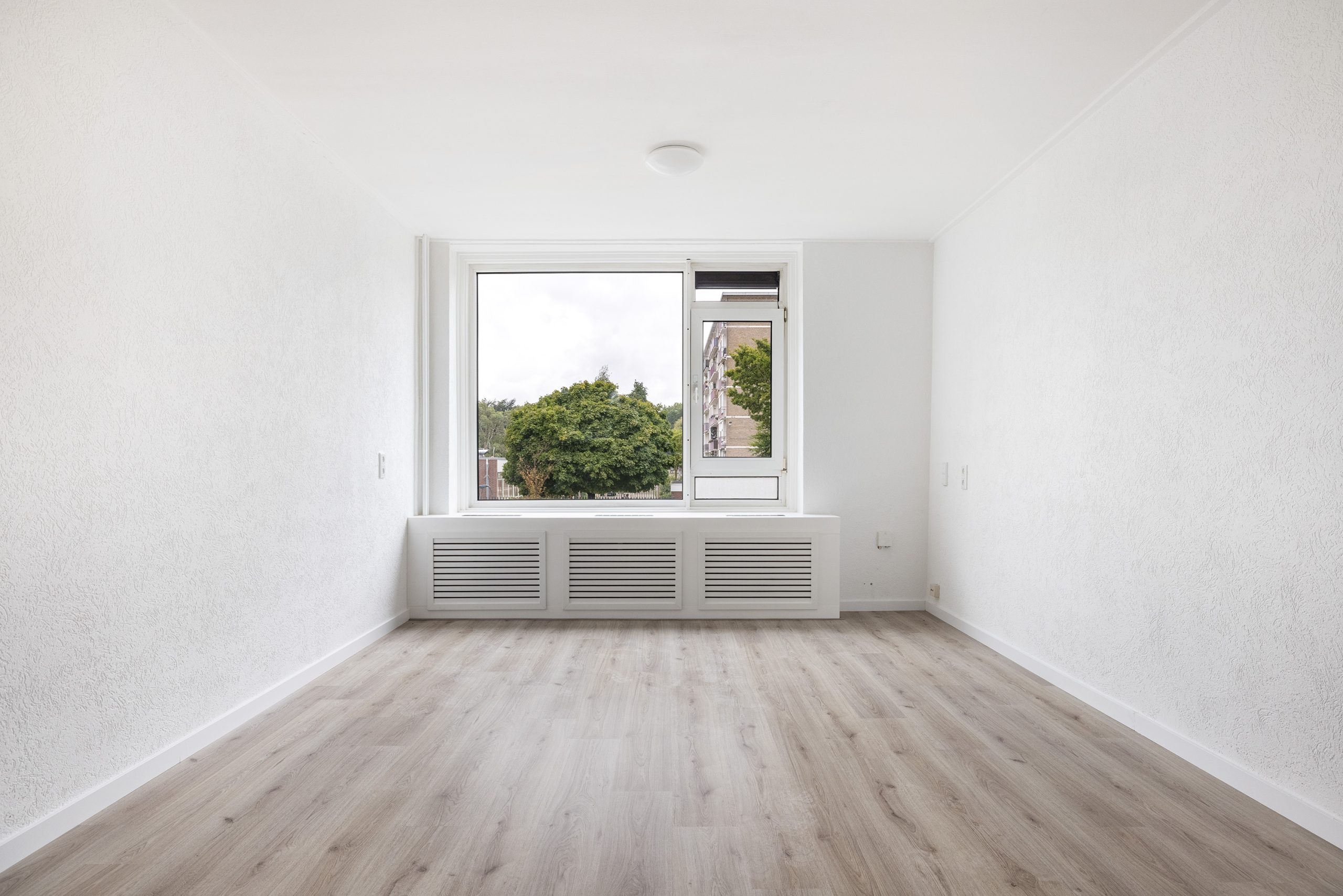 Royale woonkamer aan de voorzijde van de woning, in de kamer is een op maat gemaakte ombouw om de radiator geplaatst, leuk als extra zit ruimte of voor het plaatsten van je planten collectie.